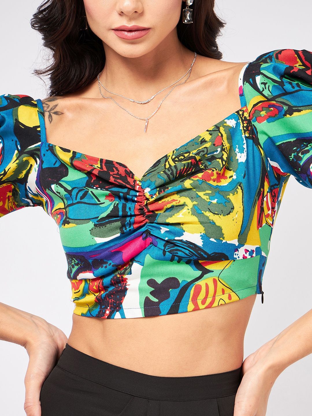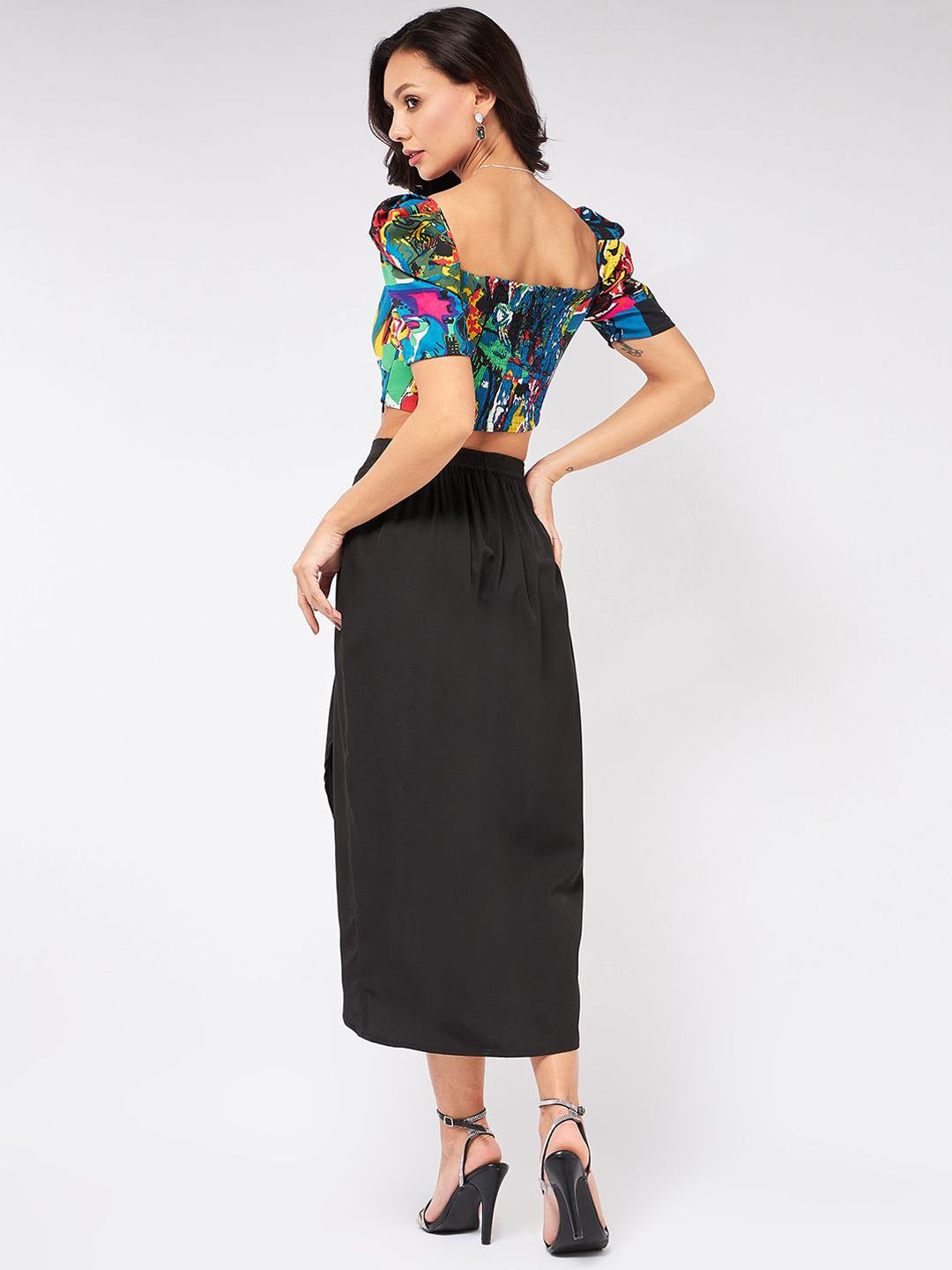 This co-ords consists of a top and skirtBlue and green printed crop top, has a square neck and short puff sleeves, secured with slip on closureBlack solid knee-length skirt, has an elasticated waistband with slip-on closure