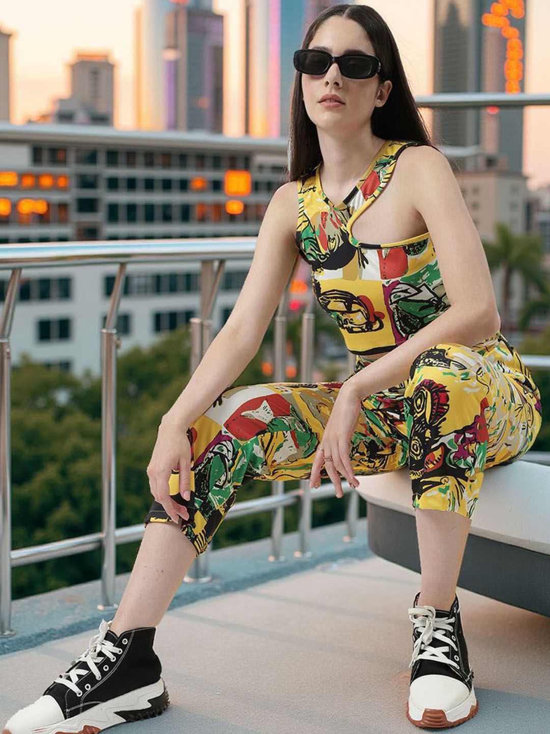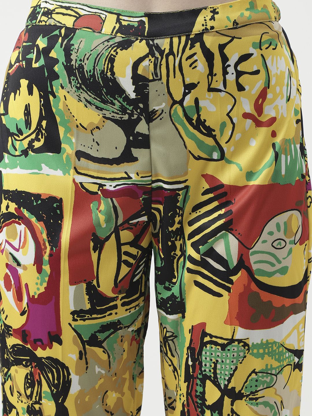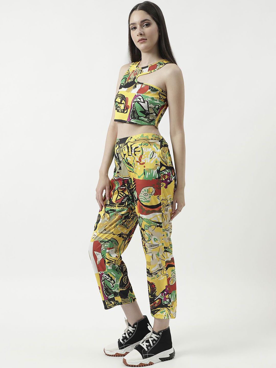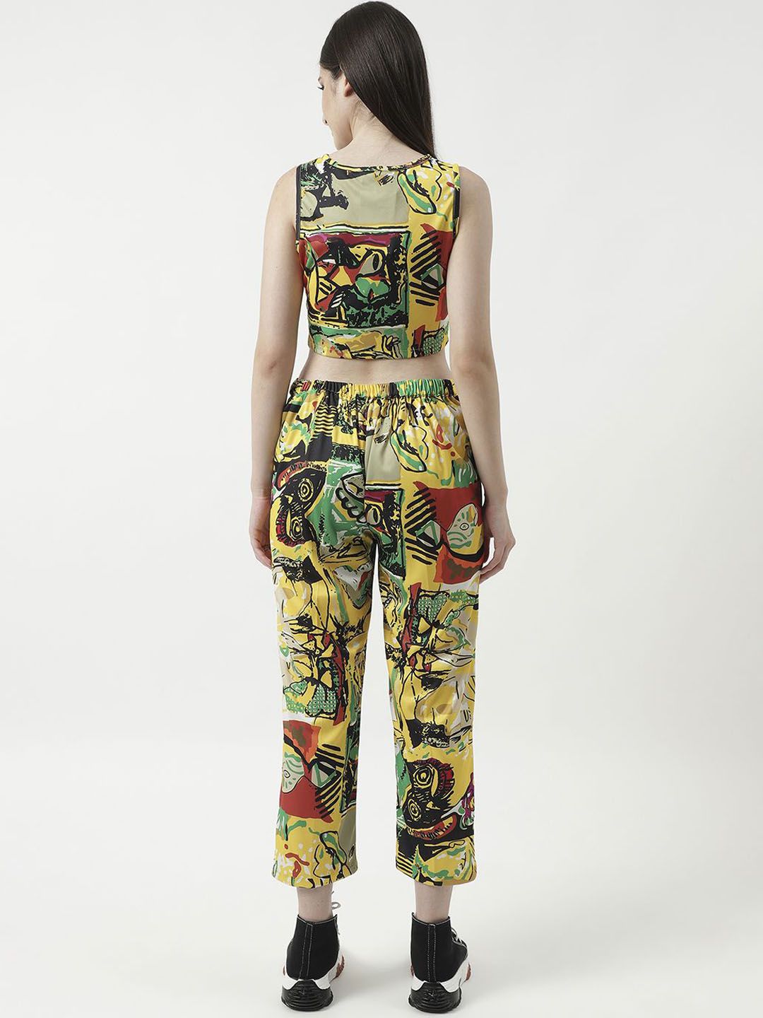 This co-ords consists of a top and trousersYellow, green and red digital printed top, has a round neck and sleeveless, secured with slip on closureYellow, green and red printed trousers, has an elasticated waistband with slip-on closure