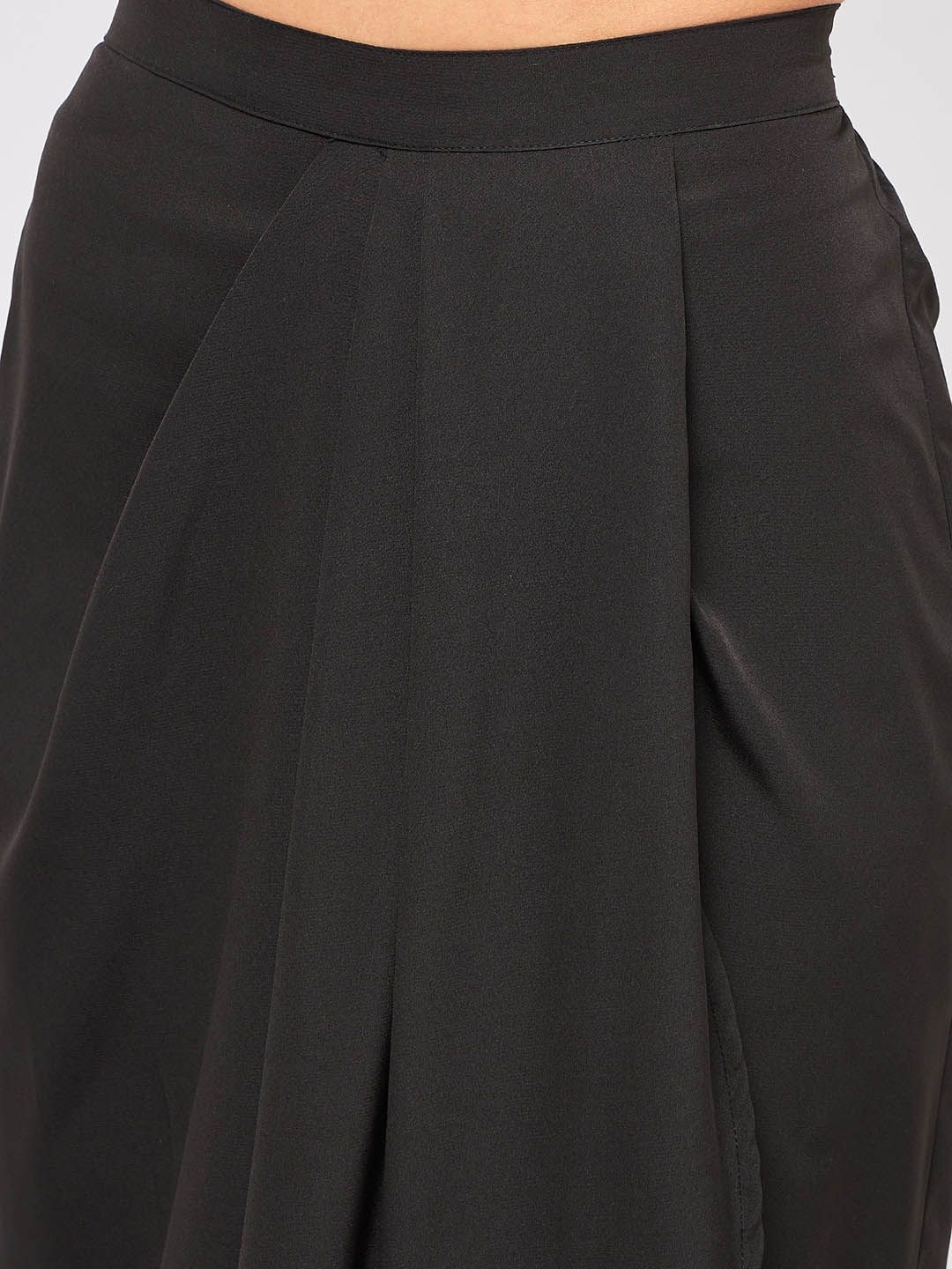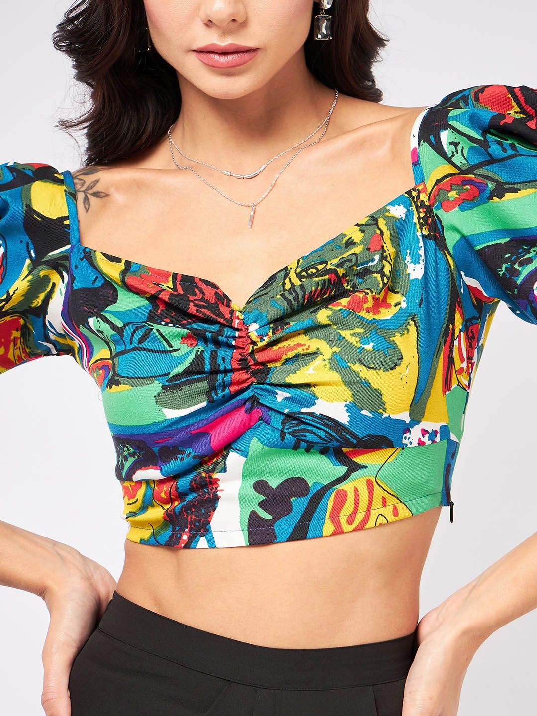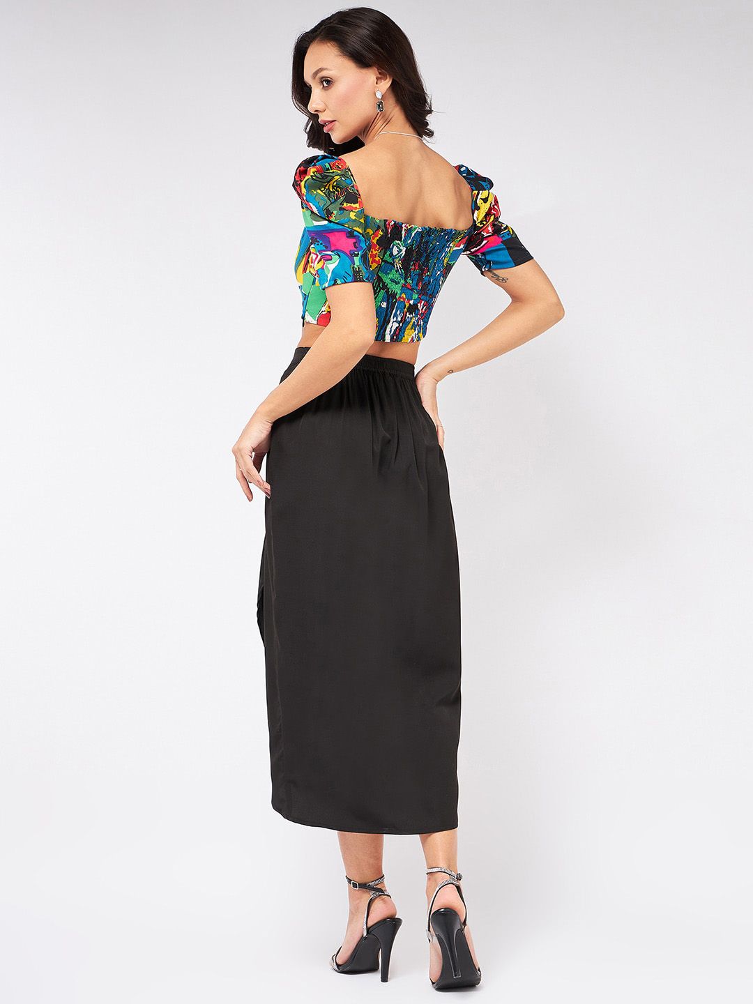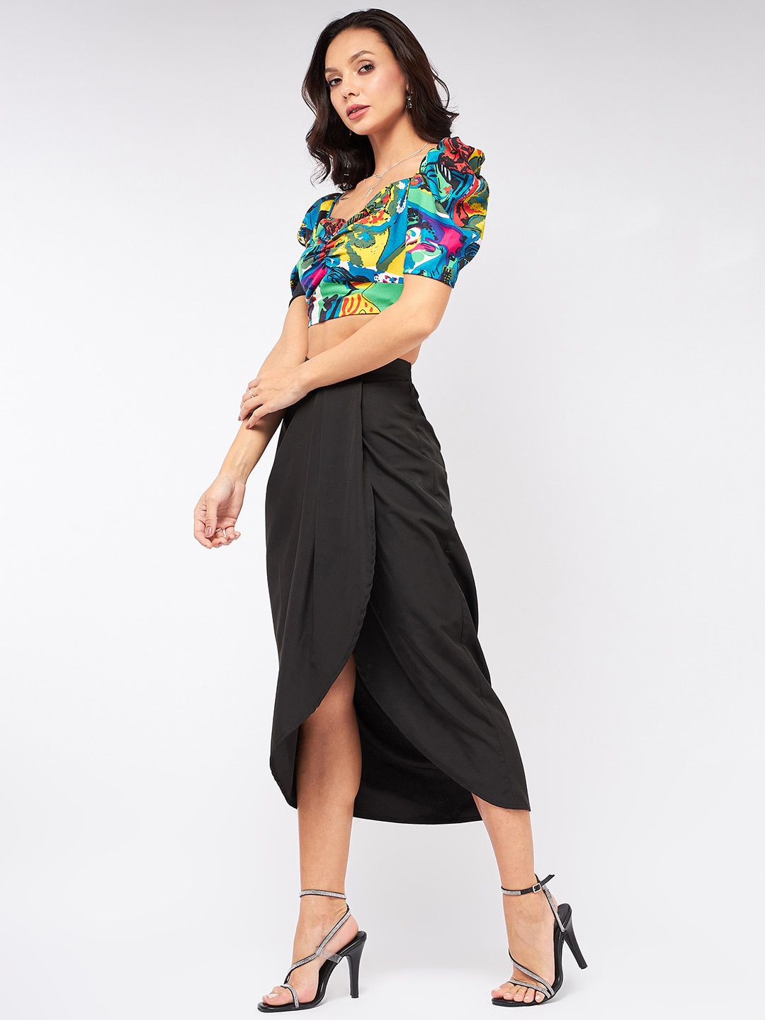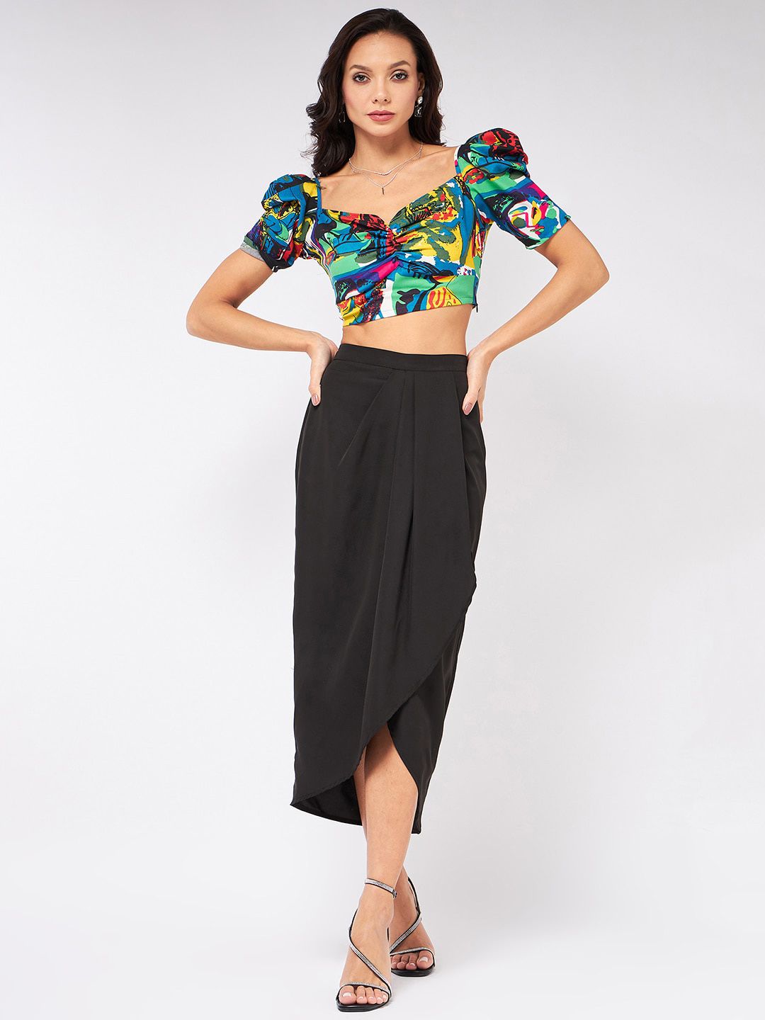 This co-ord set consists of a top and skirt Blue, green, yellow printed crop top, has a sweetheart neck, short puffed sleeves, ruched detail at the front and side zipper closure Black solid dhoti skirt, has a partially elasticated waistband with slip-on closure