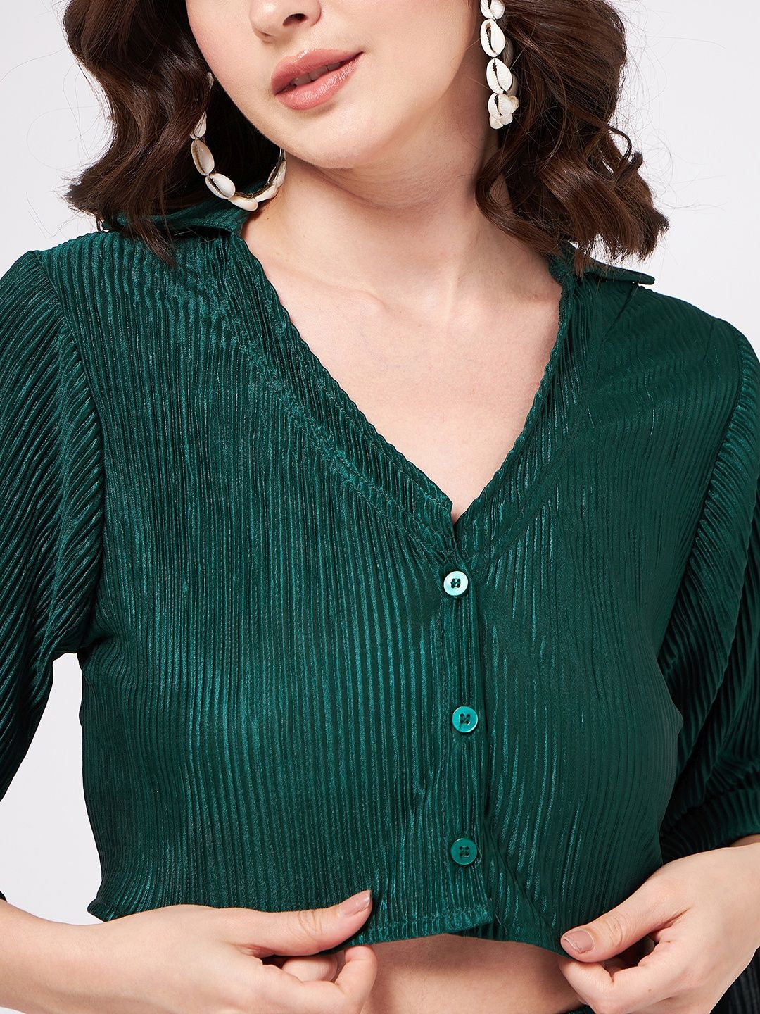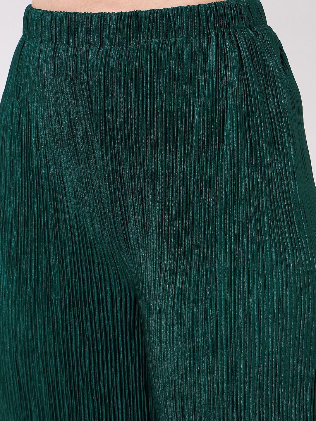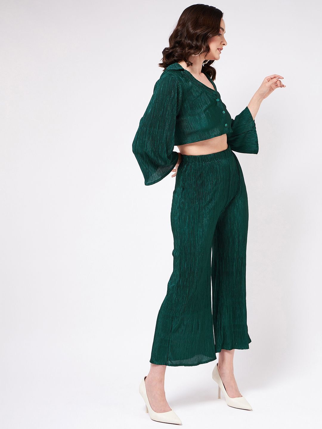 This co-ords consists of a crop-top and palazzosGreen solid pleated crop-top, has a shirt collar, bell sleeves and button closureGreen solid pleated palazzos, has an elasticated waistband with slip-on closure