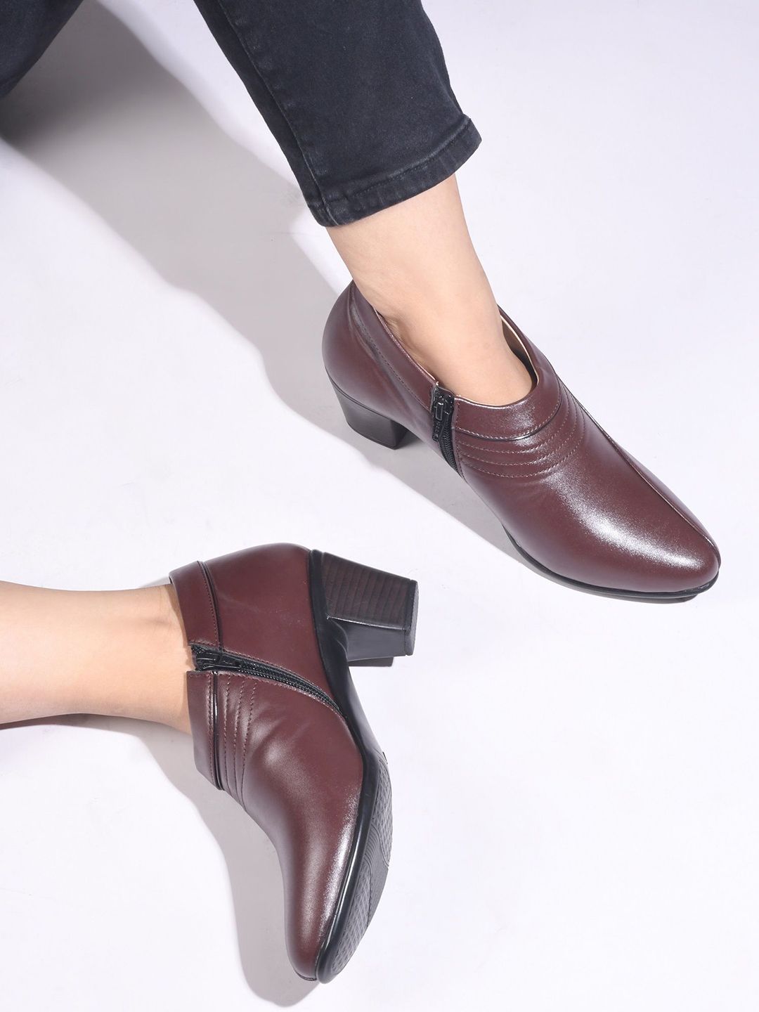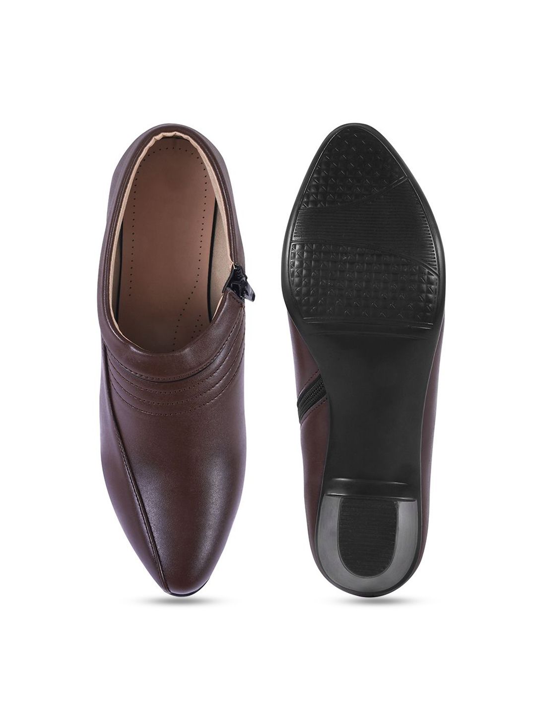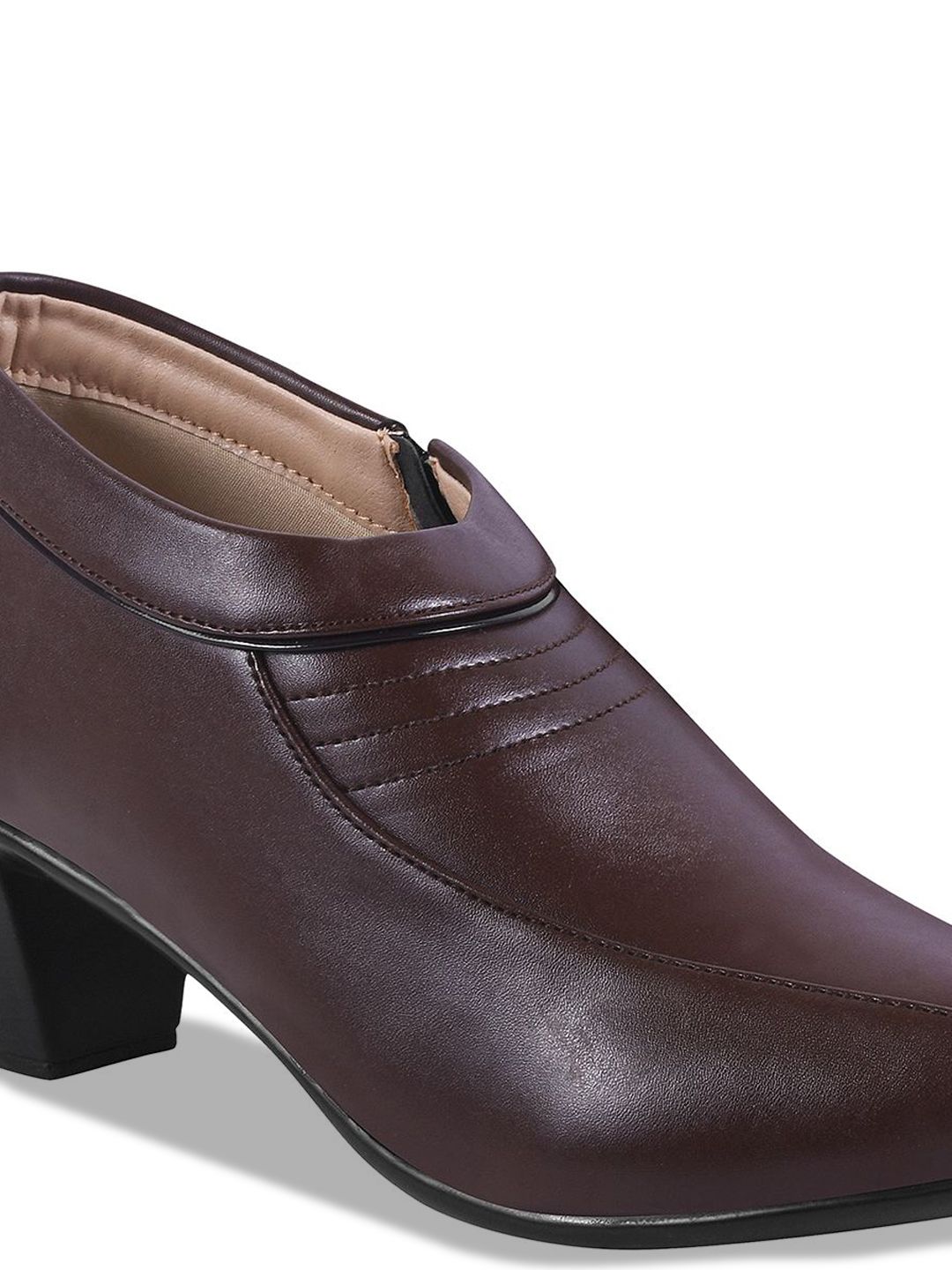 A pair of brown solid regular boots, has mid-top ankle and zip fastening and back detailSynthetic leather Solid upper materialCushioned footbedTextured and patterned TPR outsole, has a block-heeled