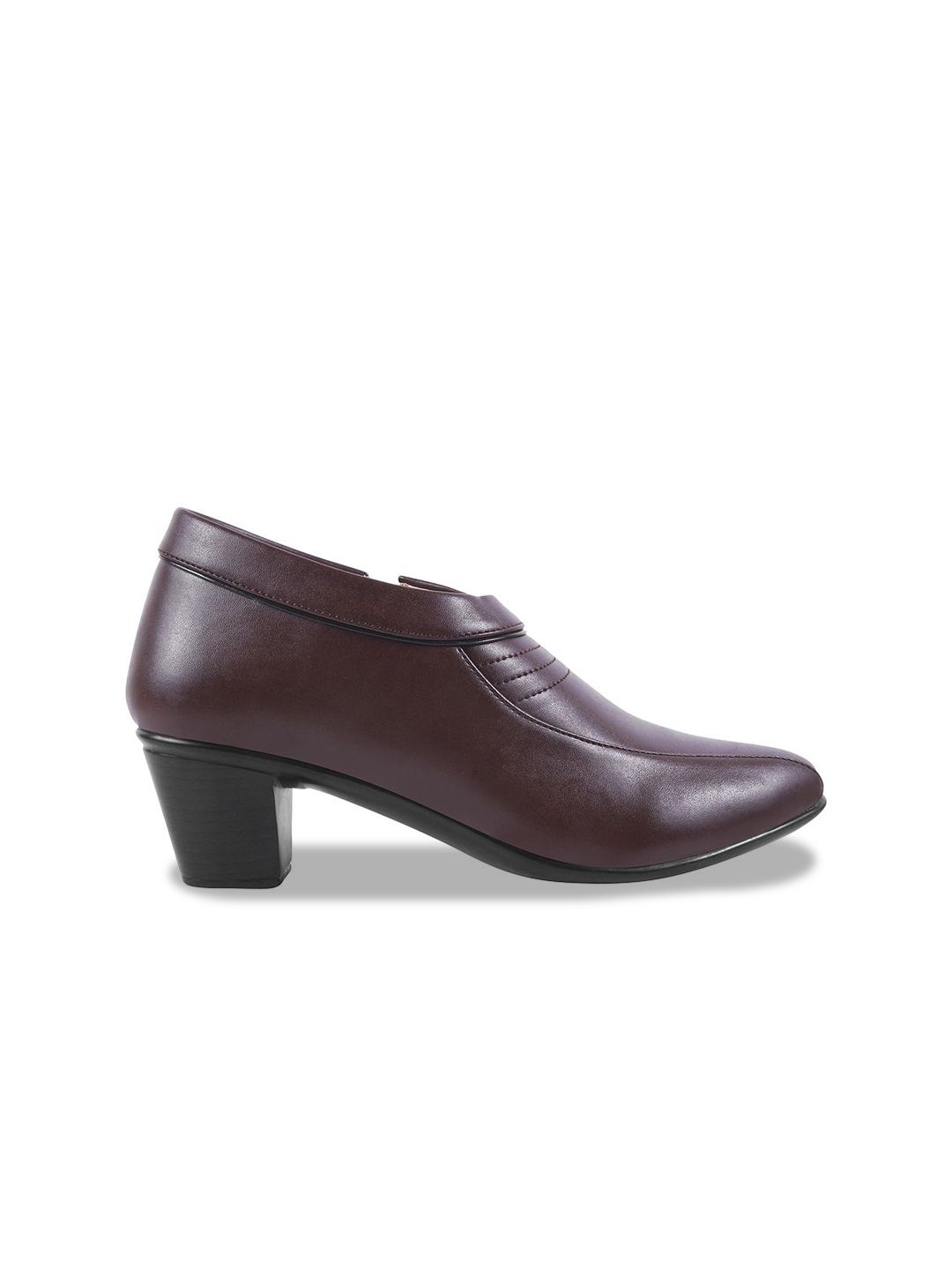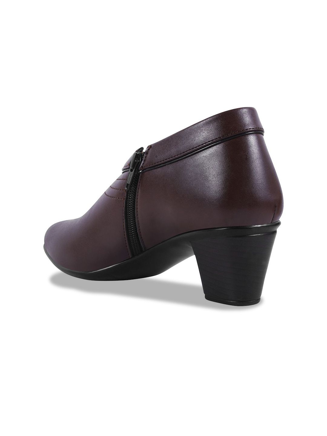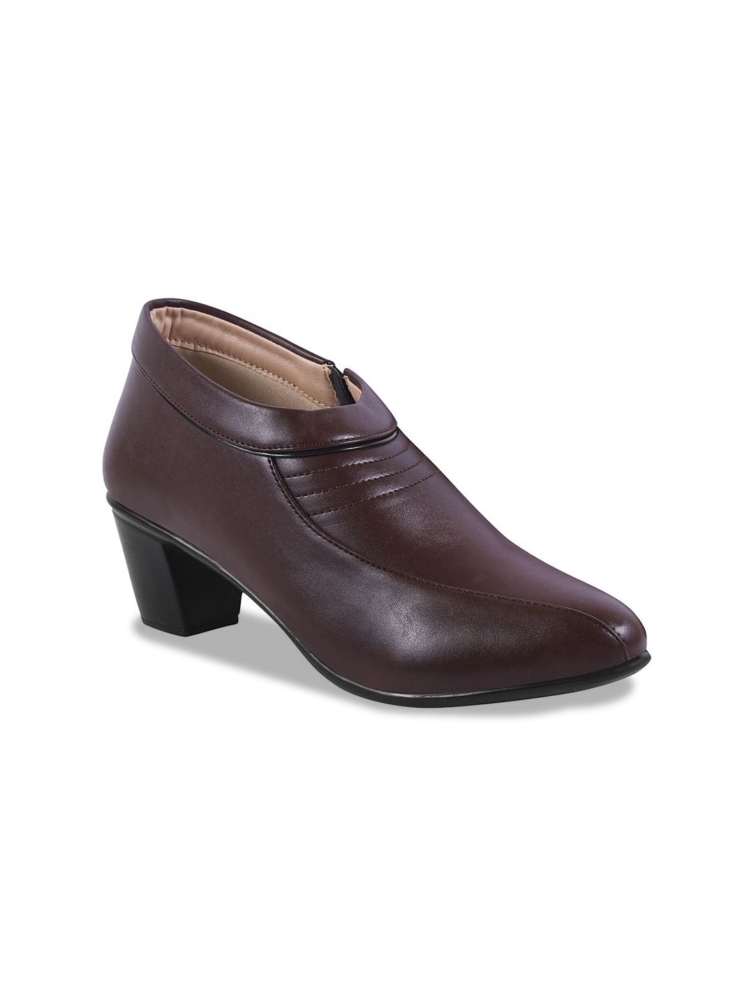 A pair of brown solid regular boots, has mid-top ankle and zip fastening and back detailSynthetic leather Solid upper materialCushioned footbedTextured and patterned TPR outsole, has a block-heeled