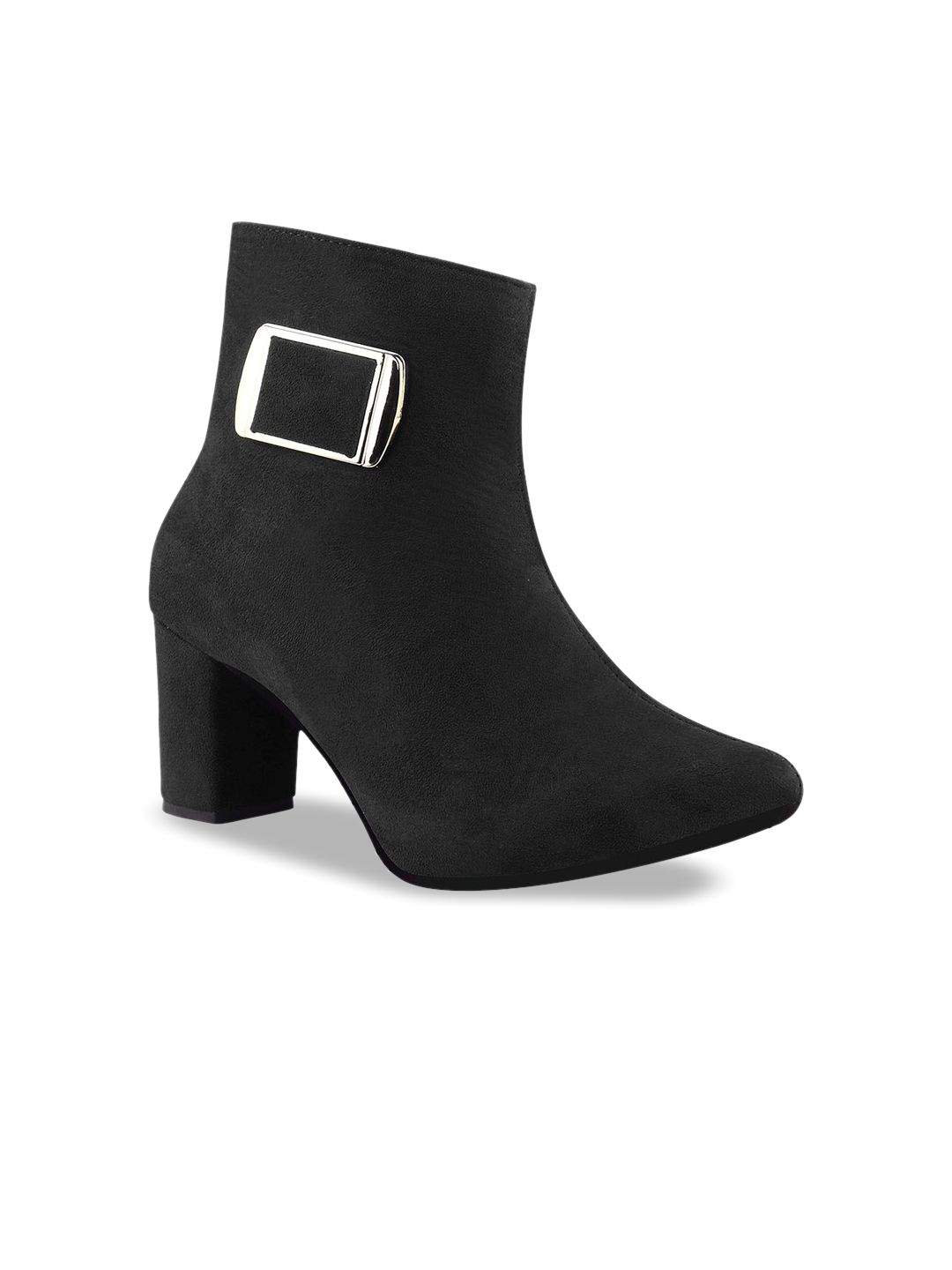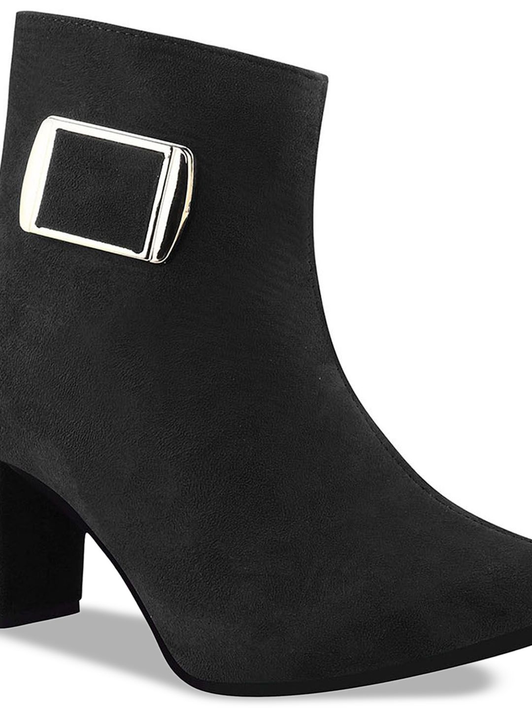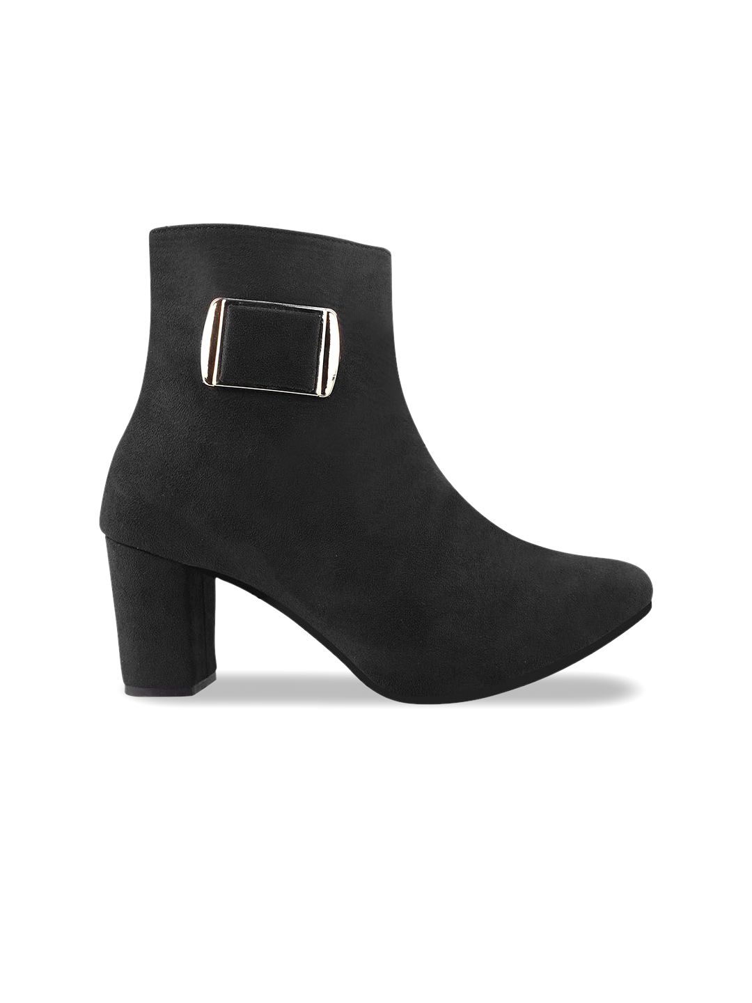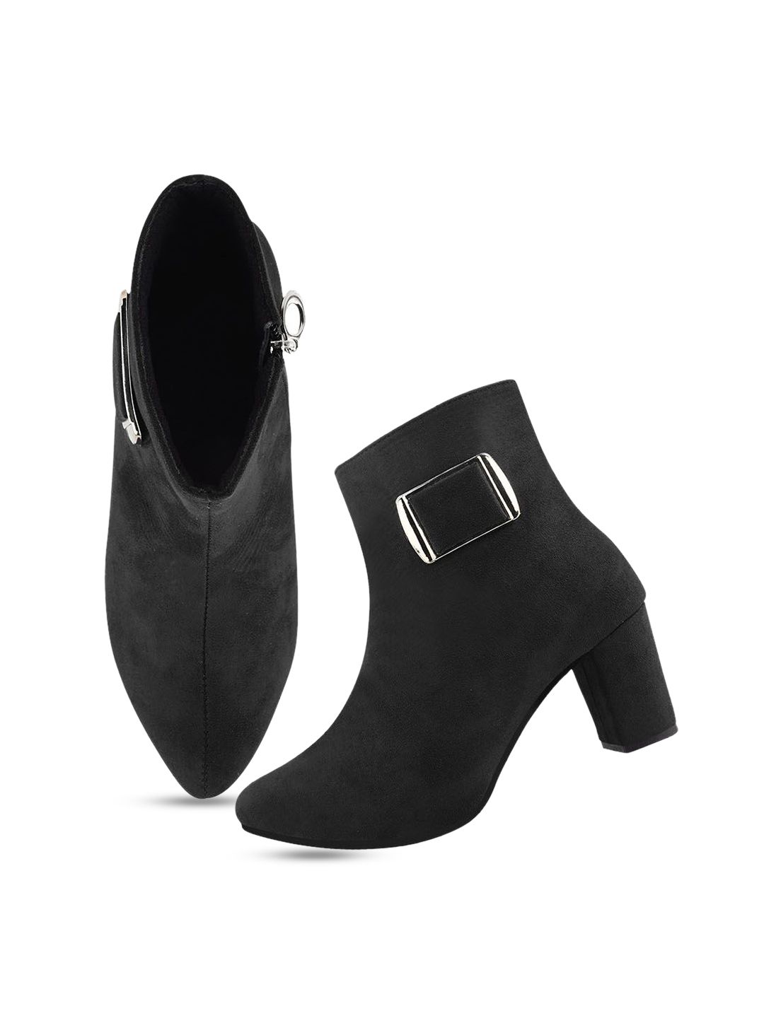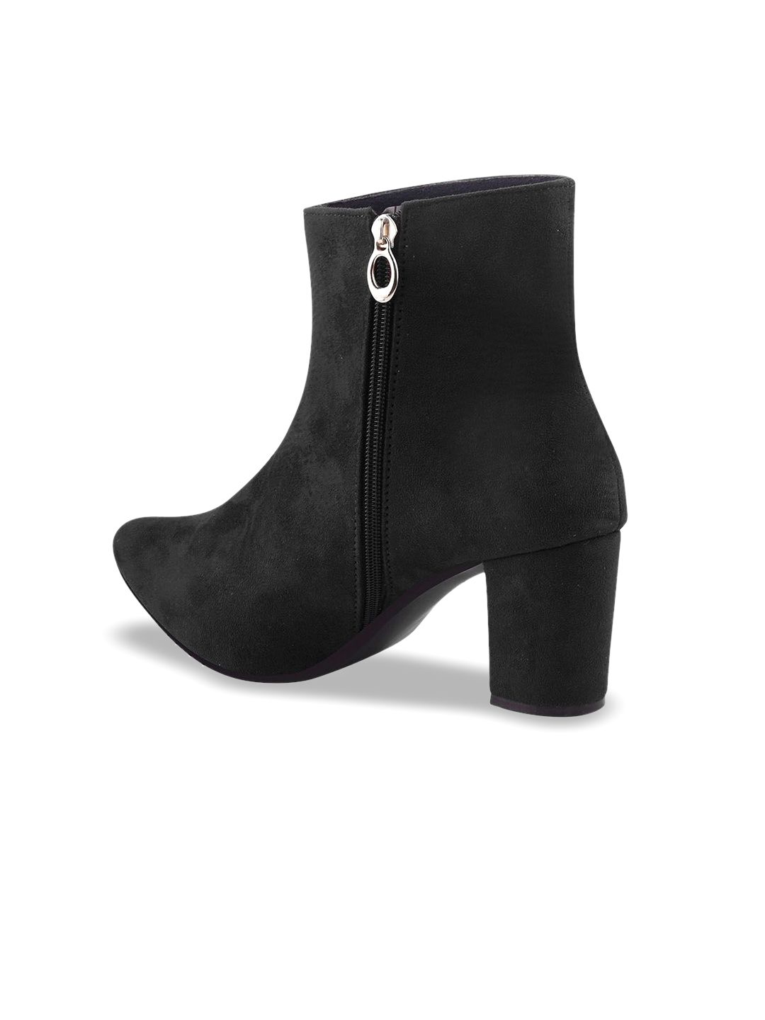 A pair of black regular boots, has mid-top ankle and slip-on fastening and back detailSuede Solid upper materialCushioned footbedTextured and patterned TPR outsole, has a block-heeled