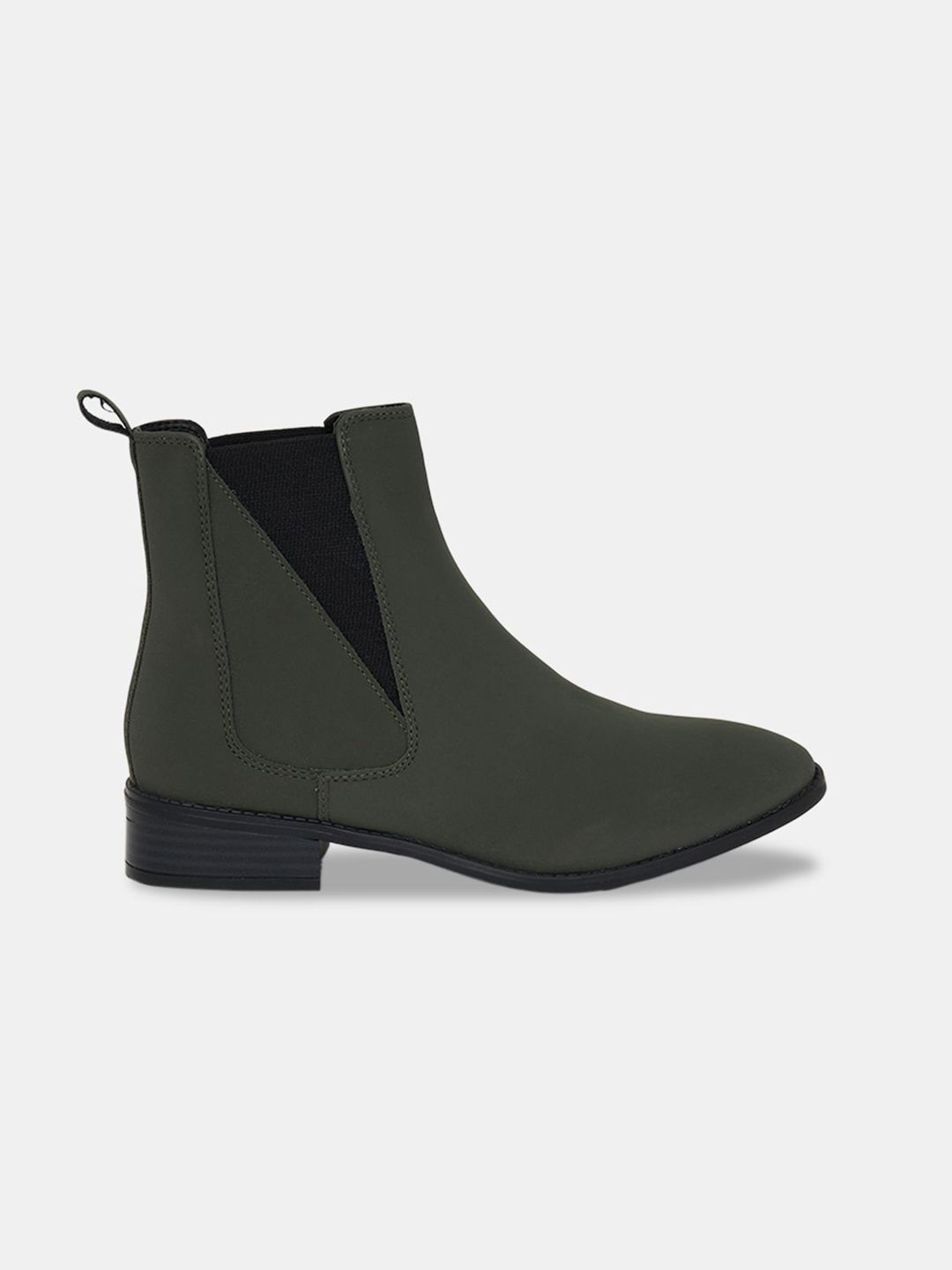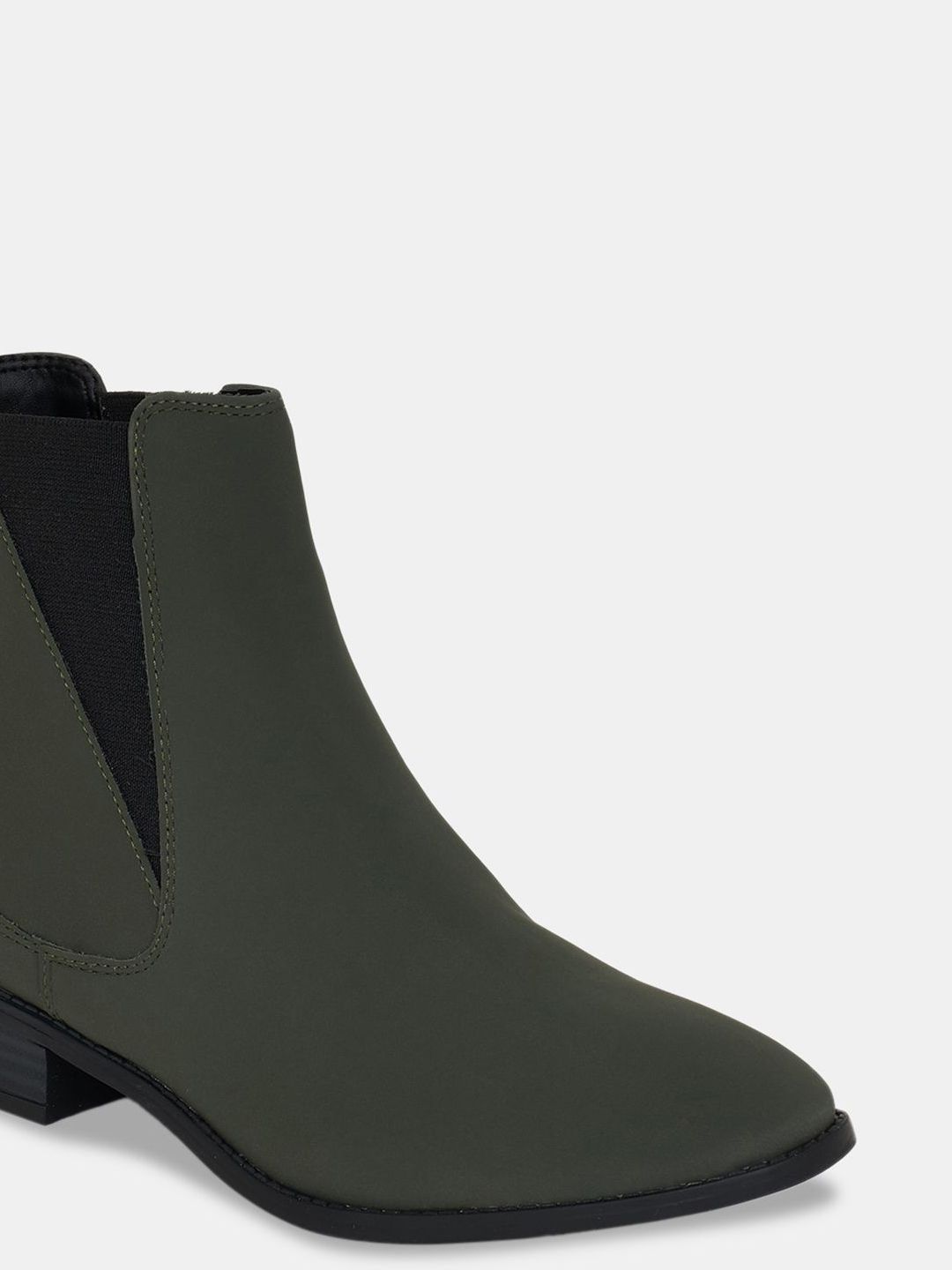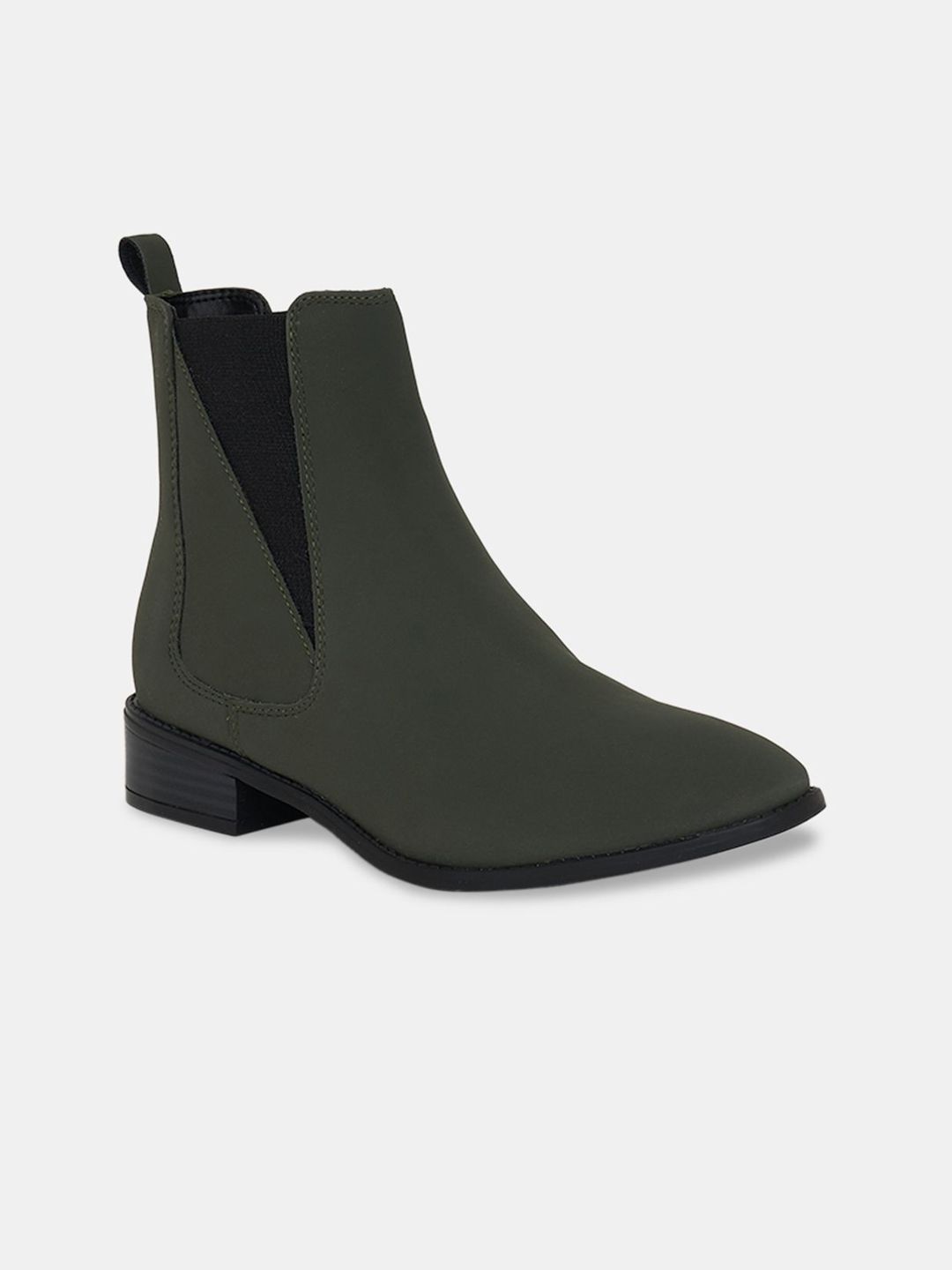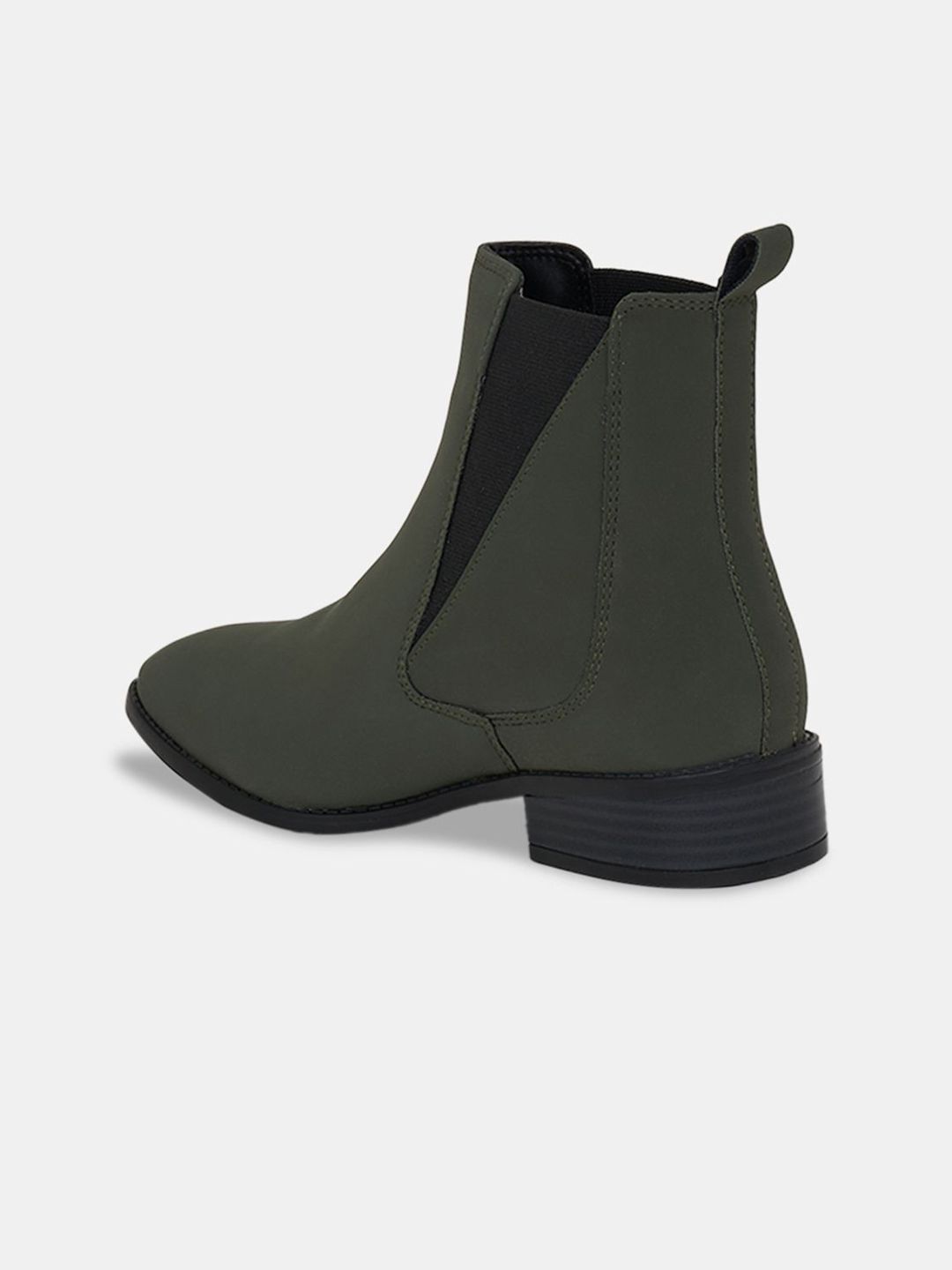 A pair of olive green winter boots, has regular and buckle fastening and back detailPU upper materialCushioned footbedTextured and patterned TPR outsole, has a block-heeled