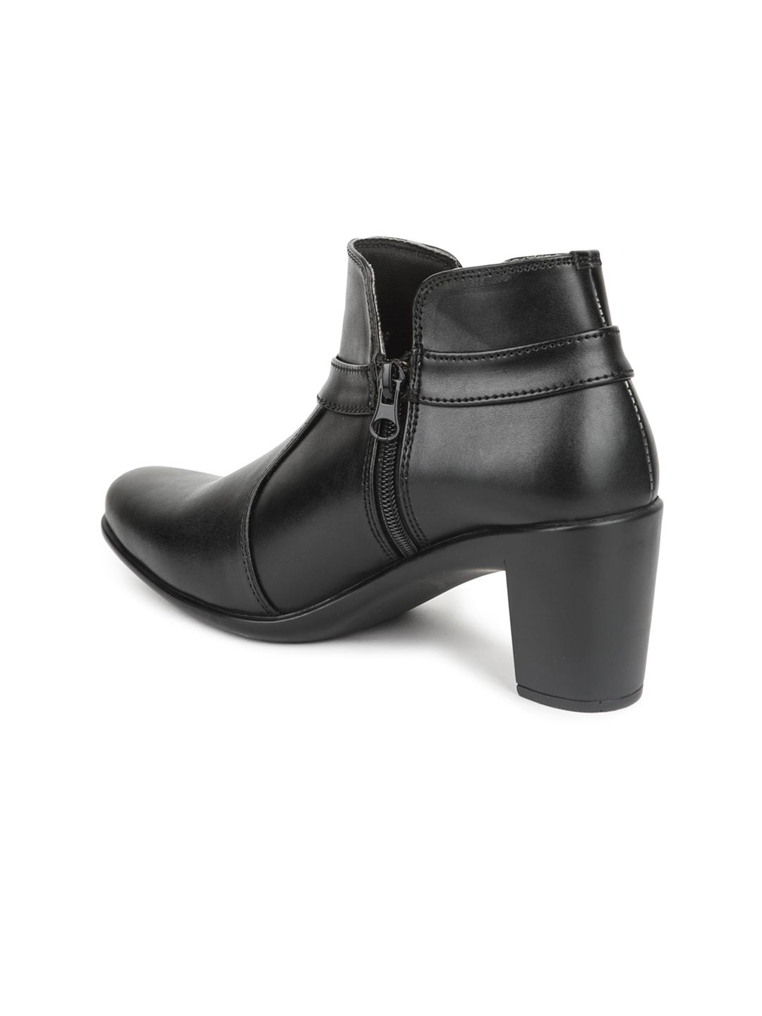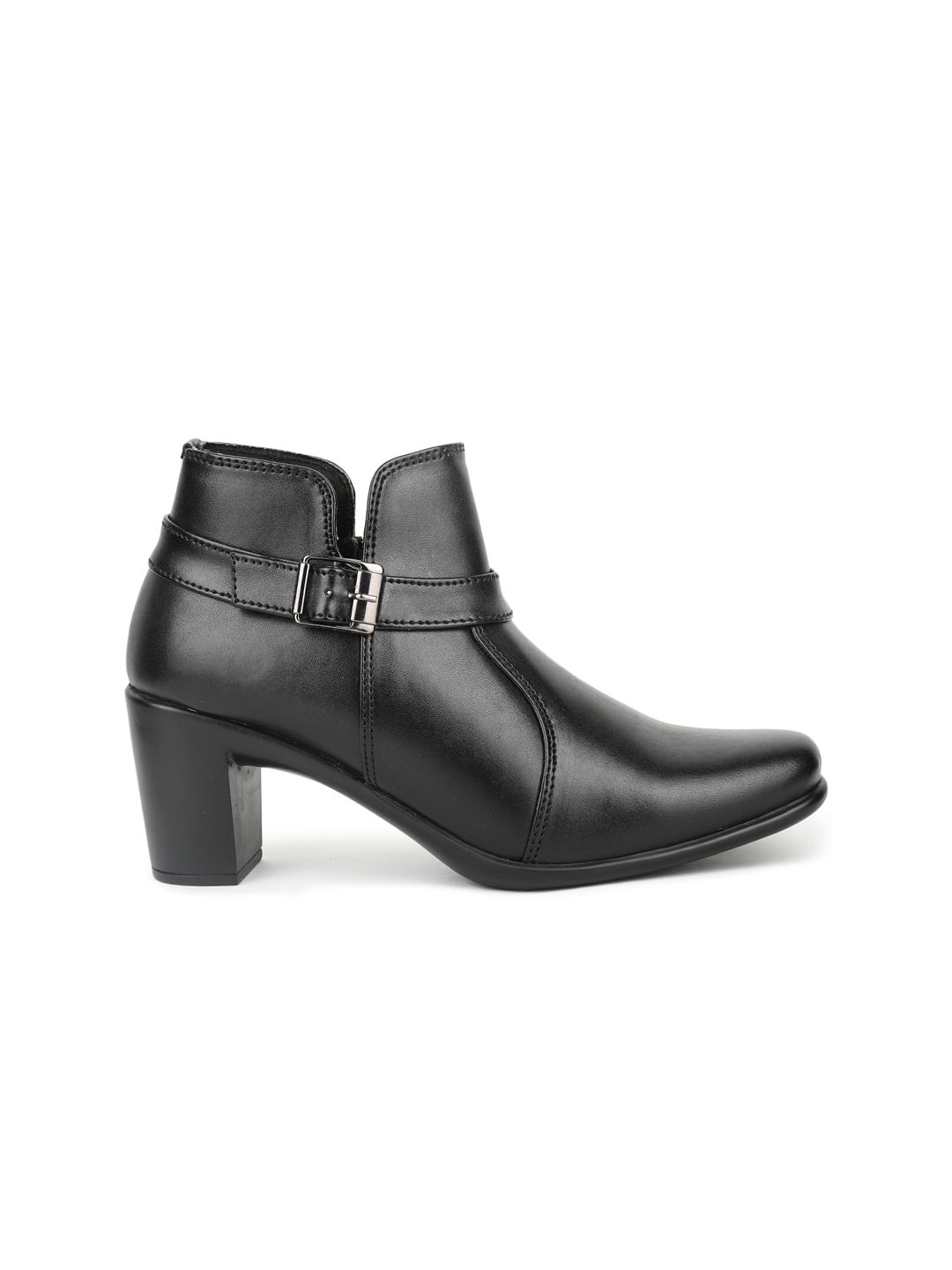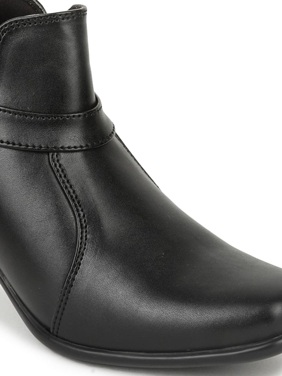 A pair of black solid square-toe ankle cowboy boots ,has mid-top styling, zip closer and buckle detailSynthetic upperLeather InsoleCushioned footbedPU outsole