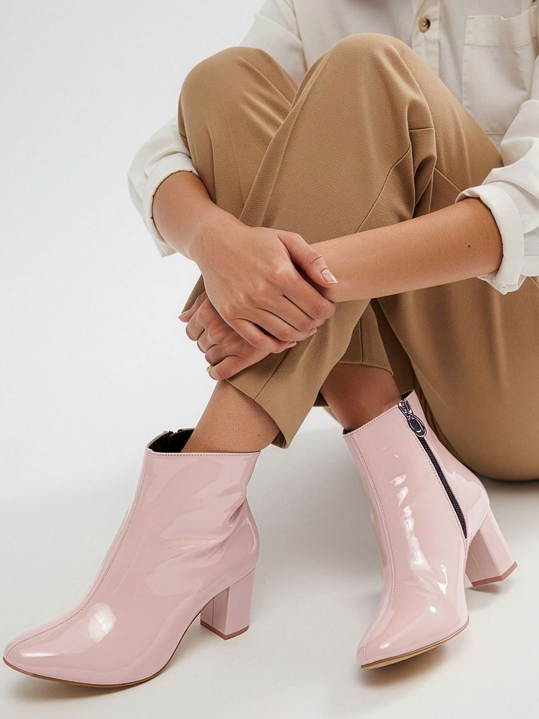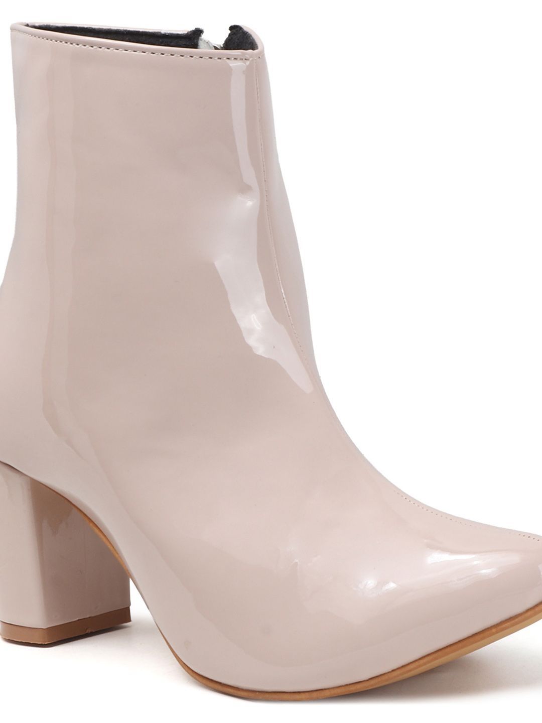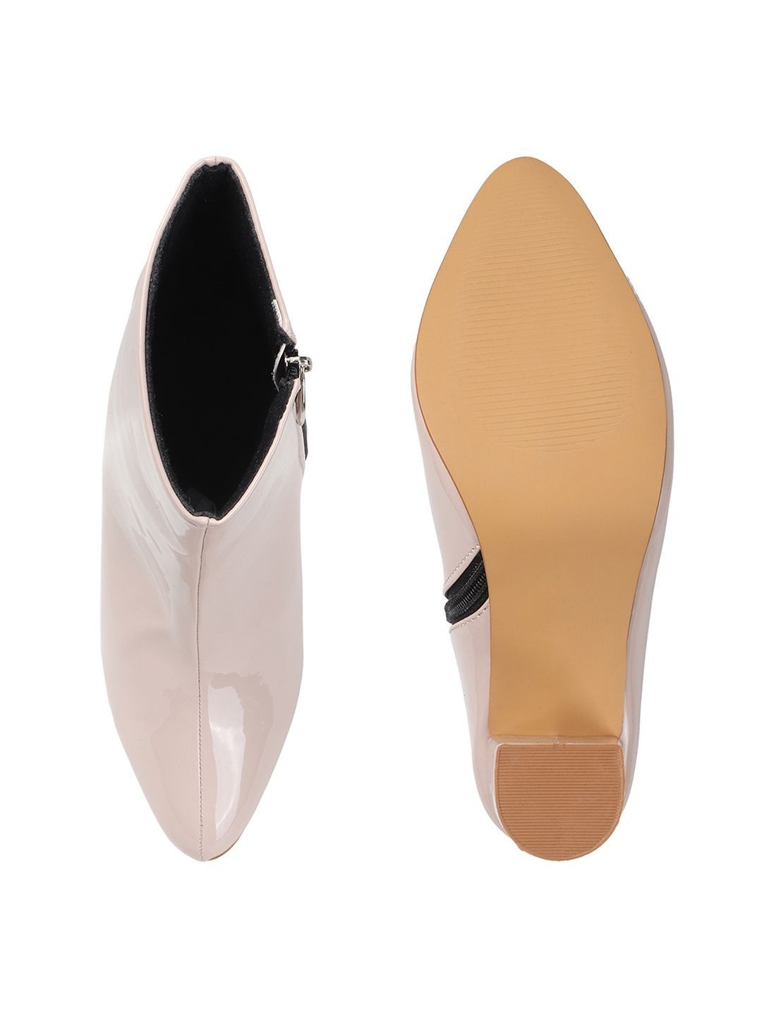 A pair of cream-colored regular boots, has mid-top ankle and zip fastening and back detailSynthetic Solid upper materialCushioned footbedTextured and patterned TPR outsole, has a block-heeled