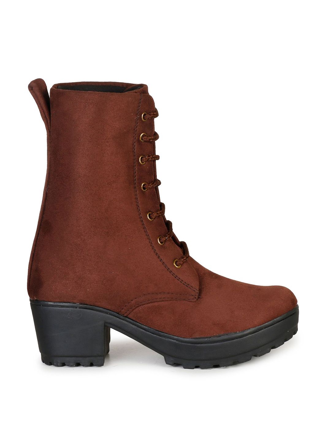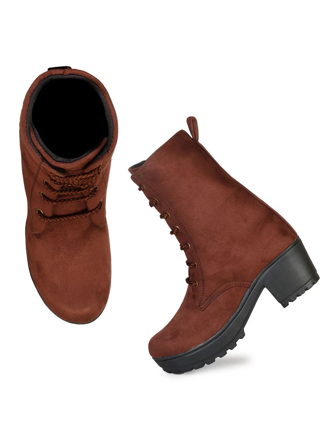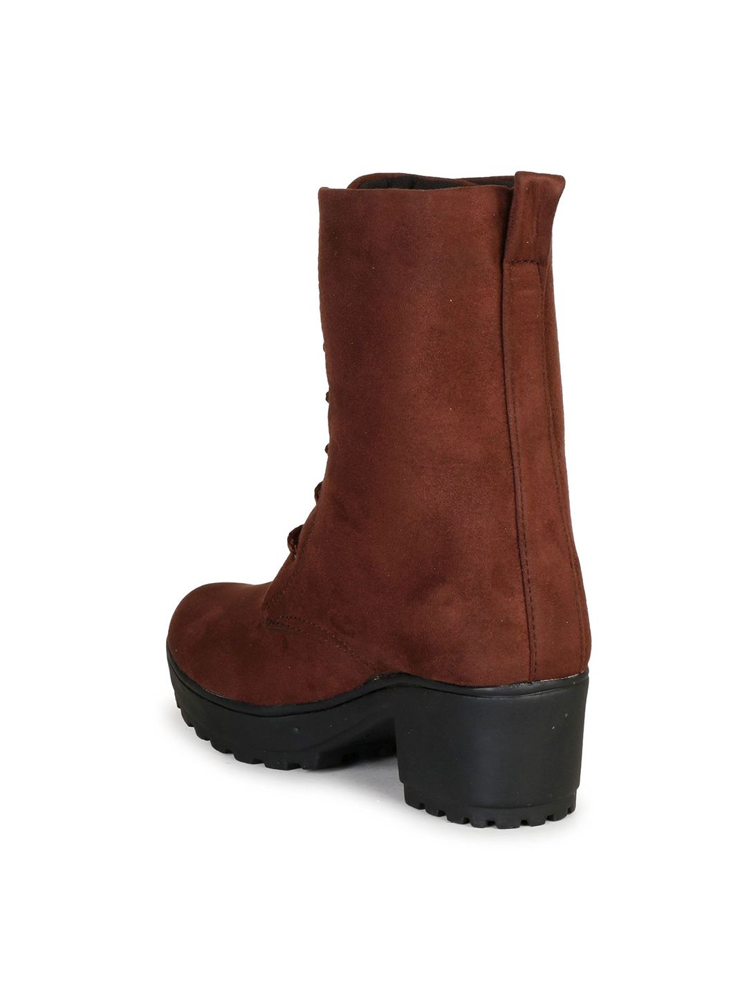 A pair of brown regular boots, has mid-top ankle and slip-on fastening and back detailSuede Solid upper materialCushioned footbedTextured and patterned rubber outsole, has a block-heeled