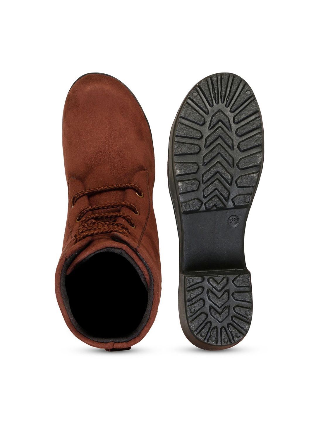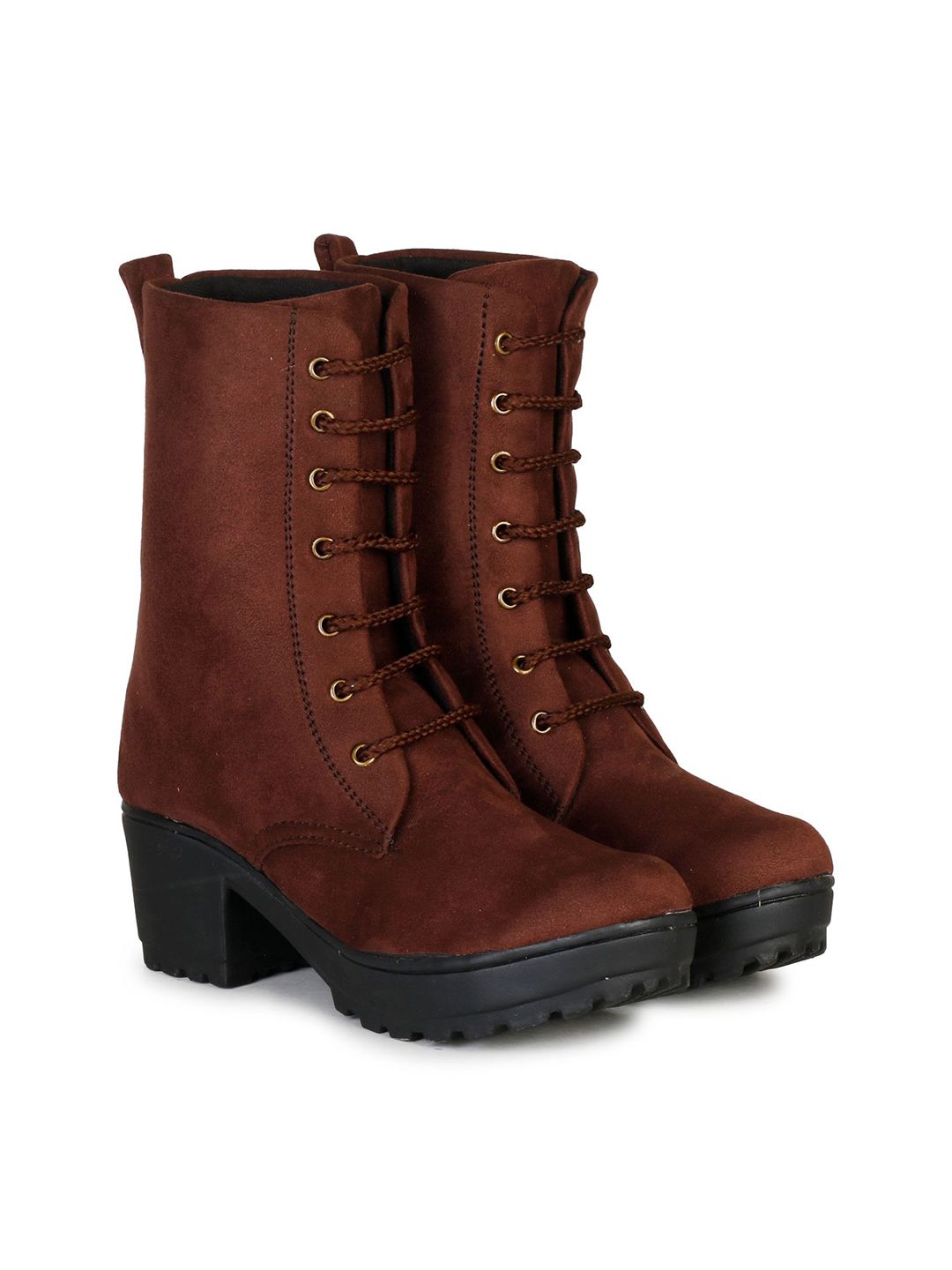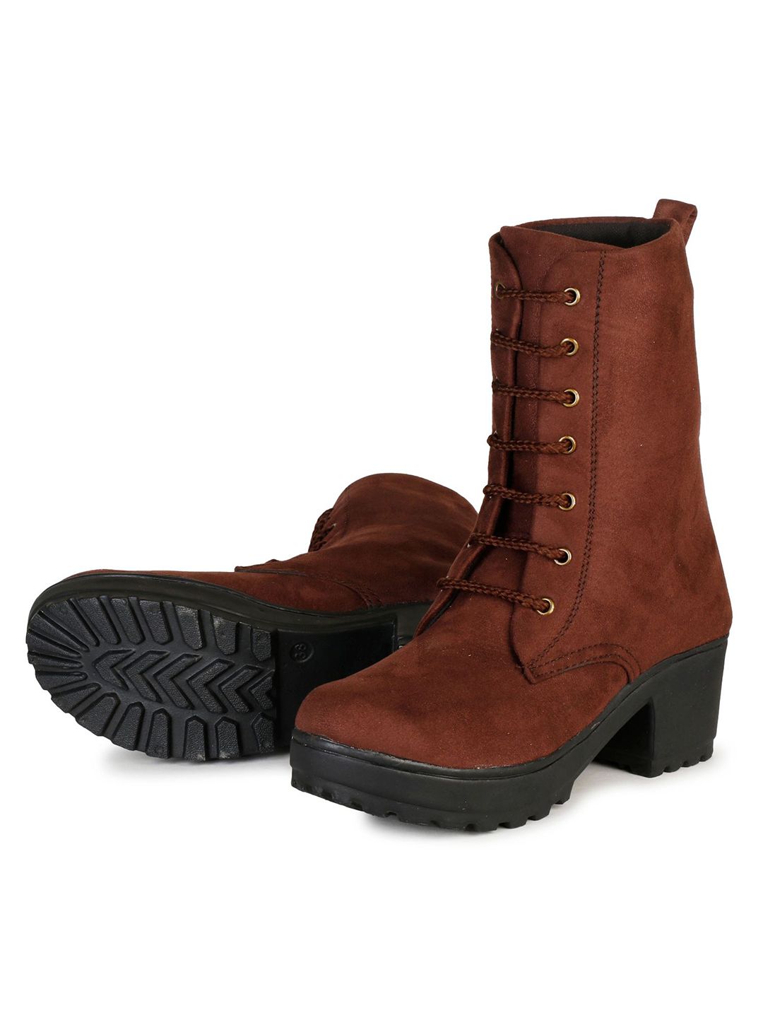 A pair of brown regular boots, has mid-top ankle and slip-on fastening and back detailSuede Solid upper materialCushioned footbedTextured and patterned rubber outsole, has a block-heeled
