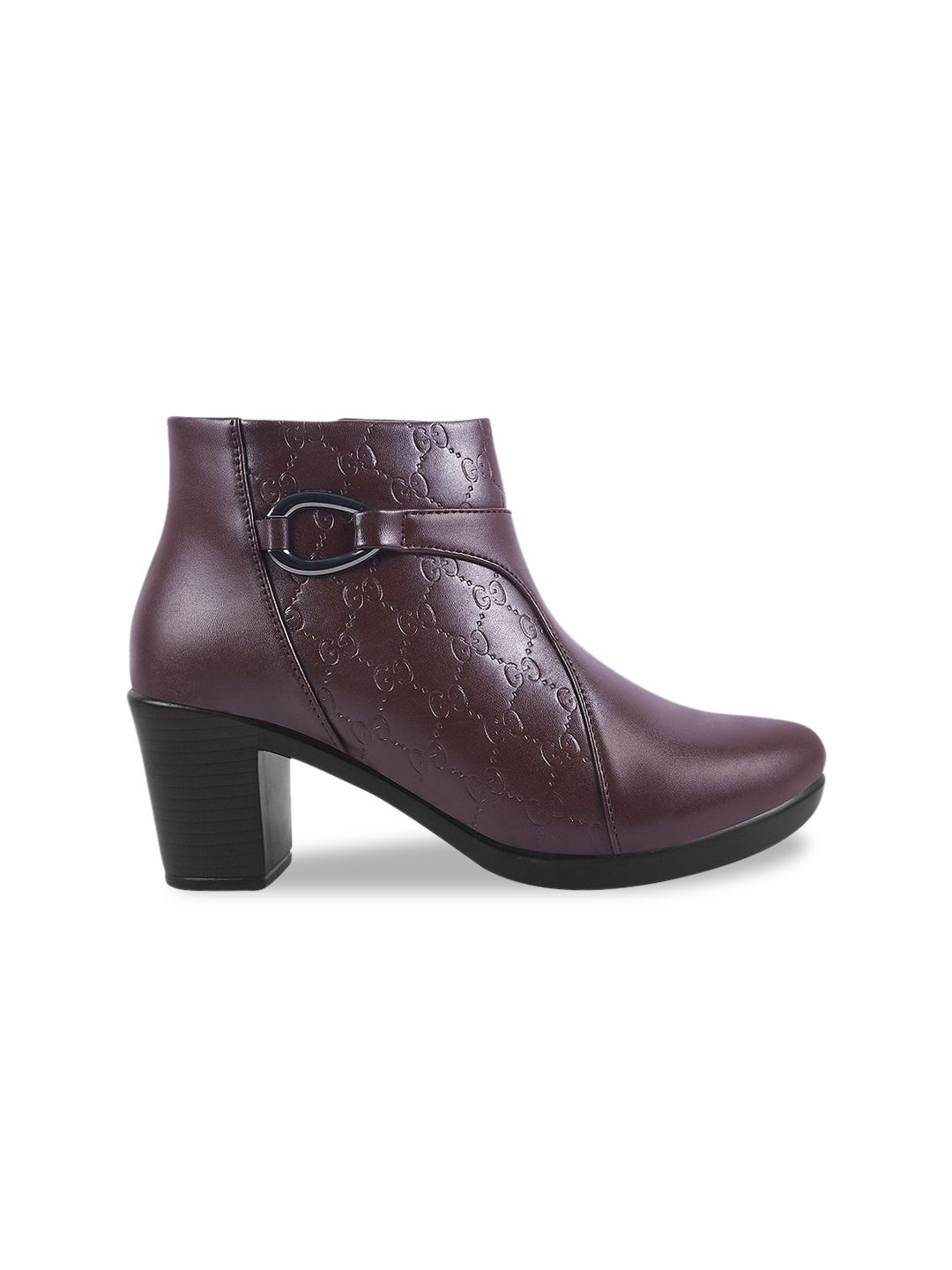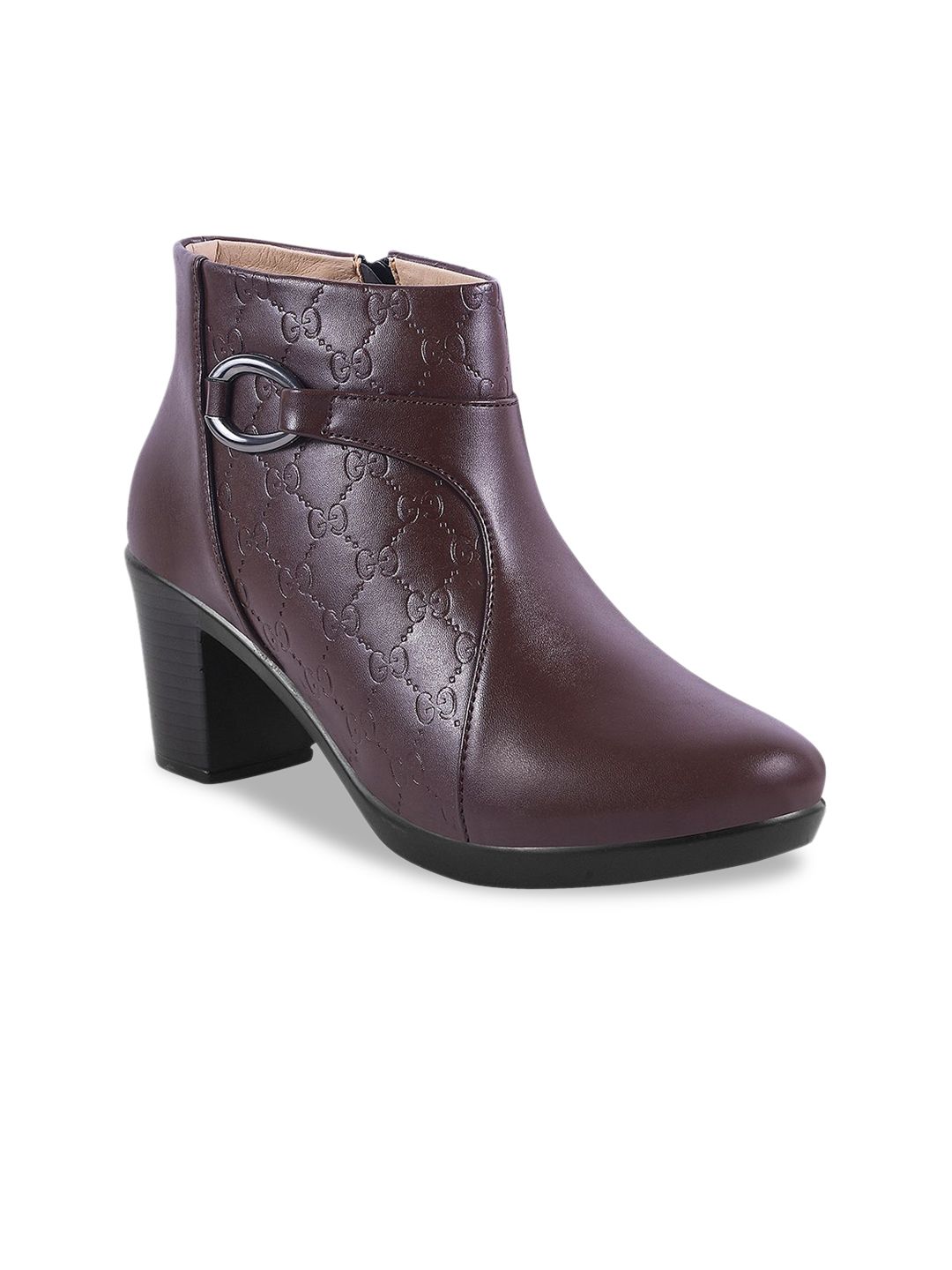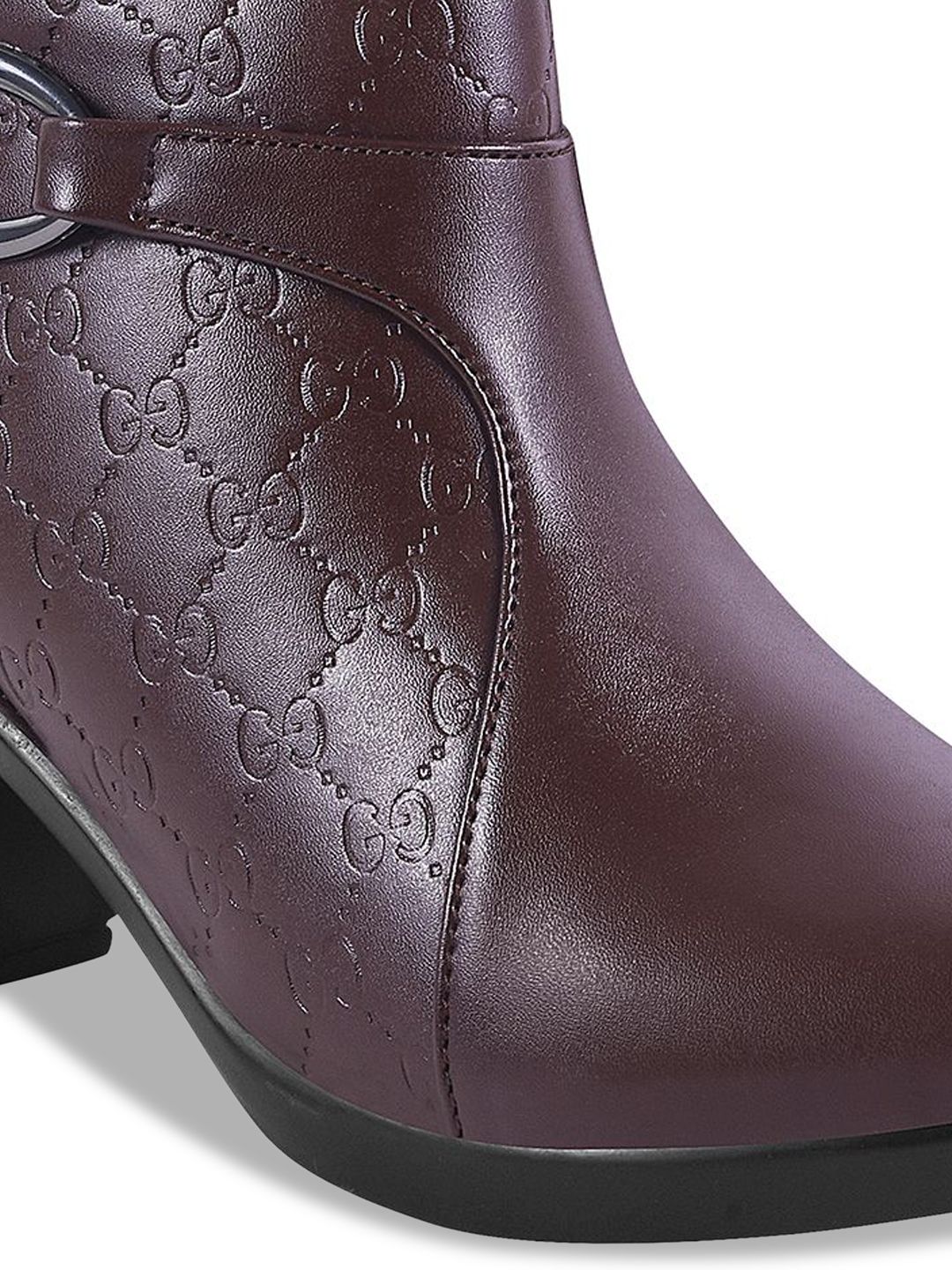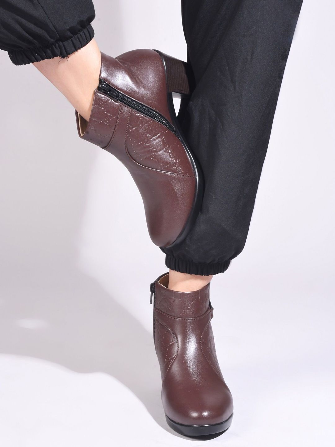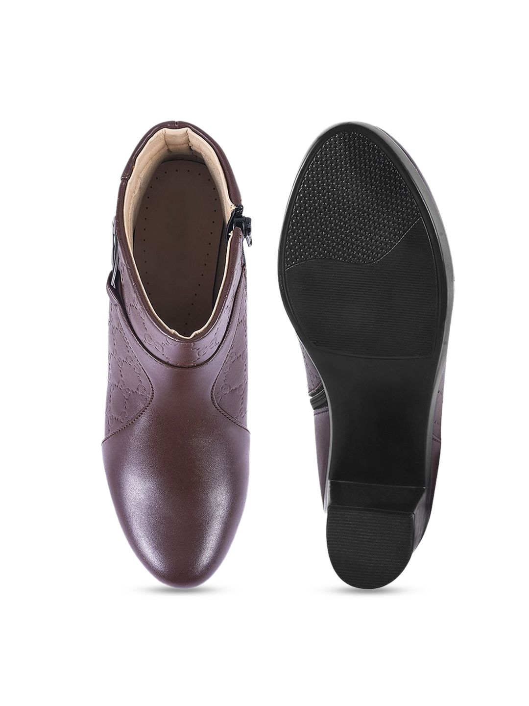 A pair of brown solid regular boots, has mid-top ankle and zip fastening and back detailSynthetic leather Solid upper materialCushioned footbedTextured and patterned TPR outsole, has a block-heeled