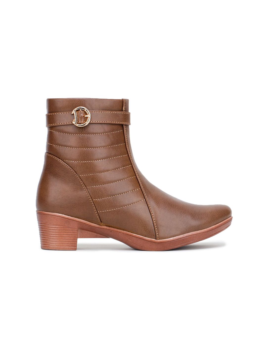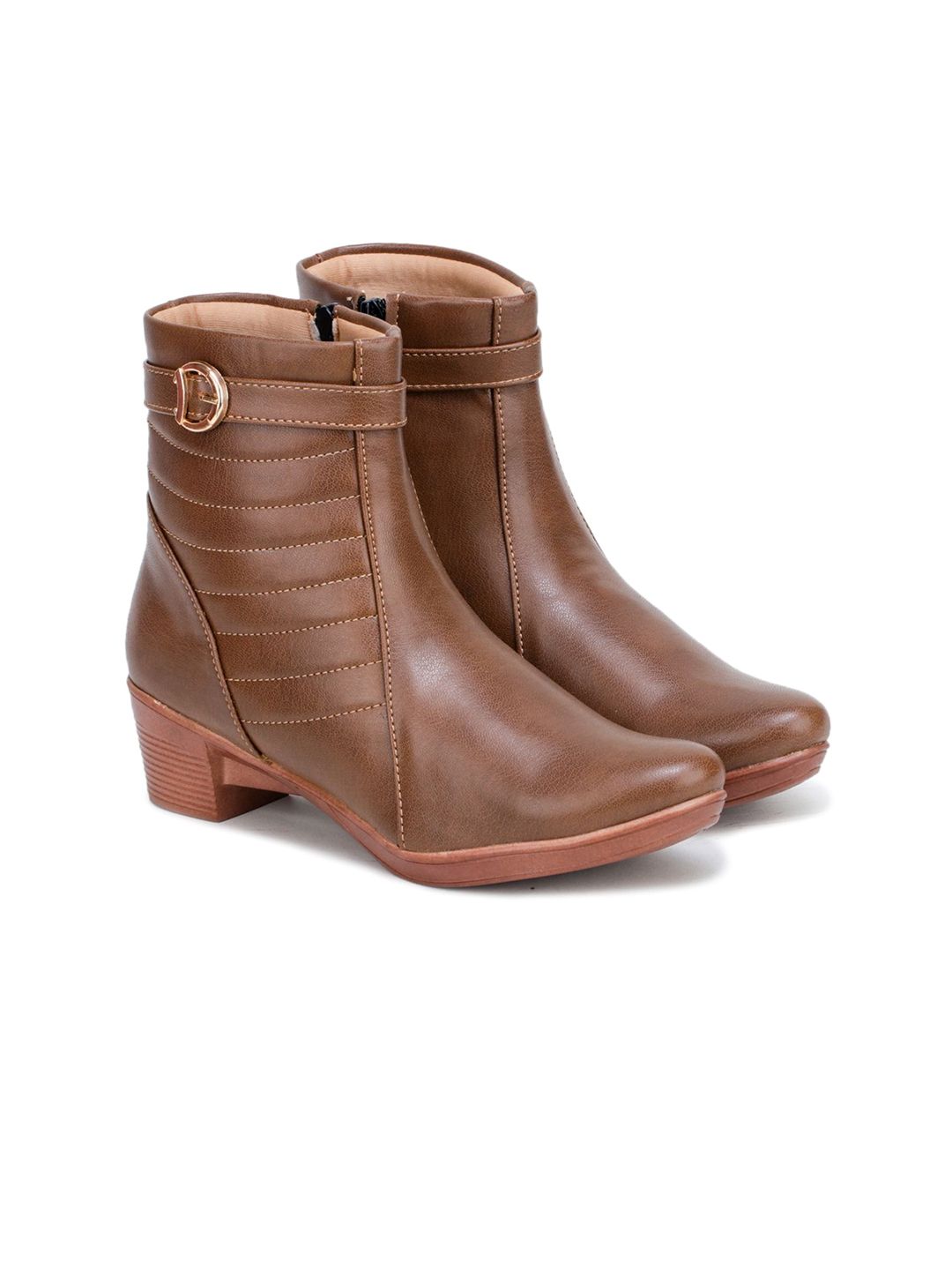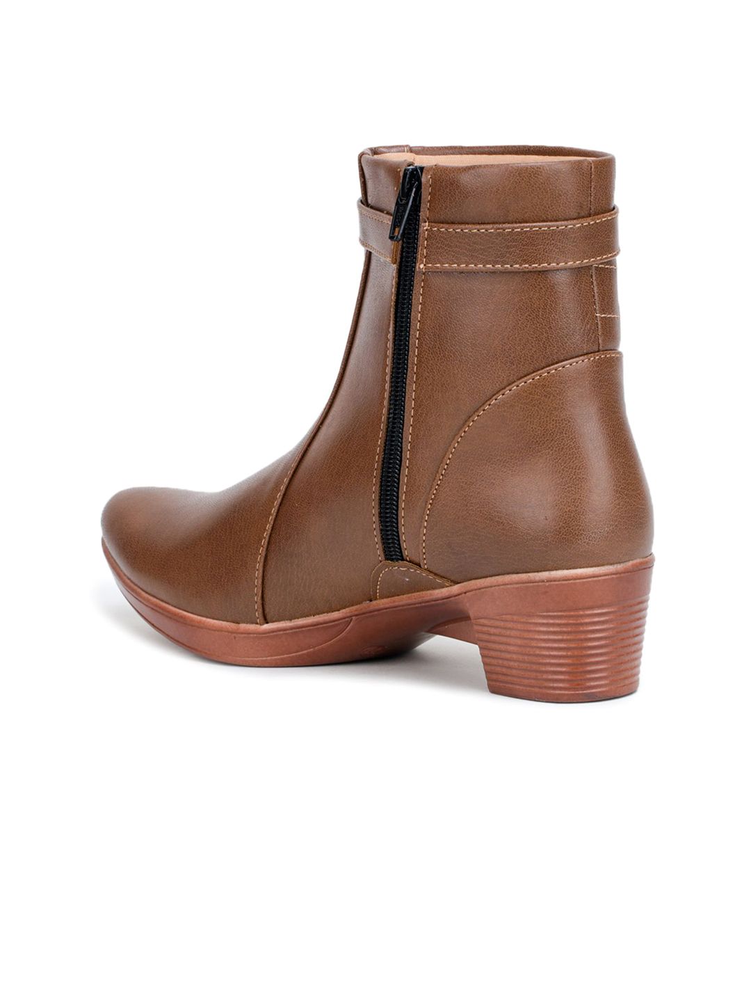 A pair of brown solid regular boots has round toe, zip fastening and back detailSynthetic Leather upper materialCushioned foot bedTextured and patterned PU outsole, has a block heelsWarranty: 1 MonthWarranty provided by brand/manufacturer
