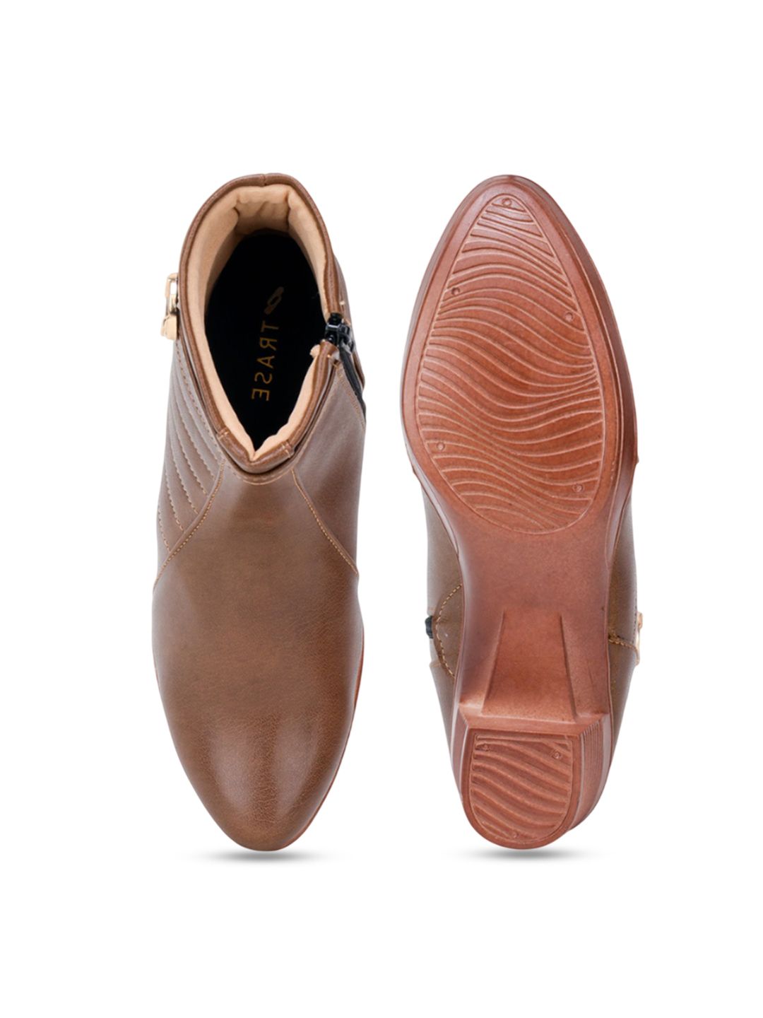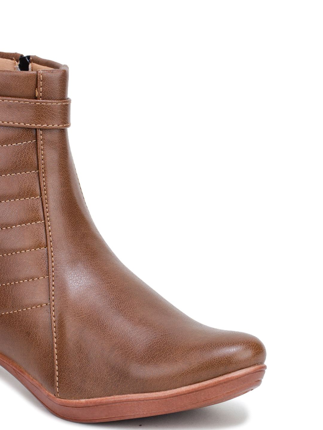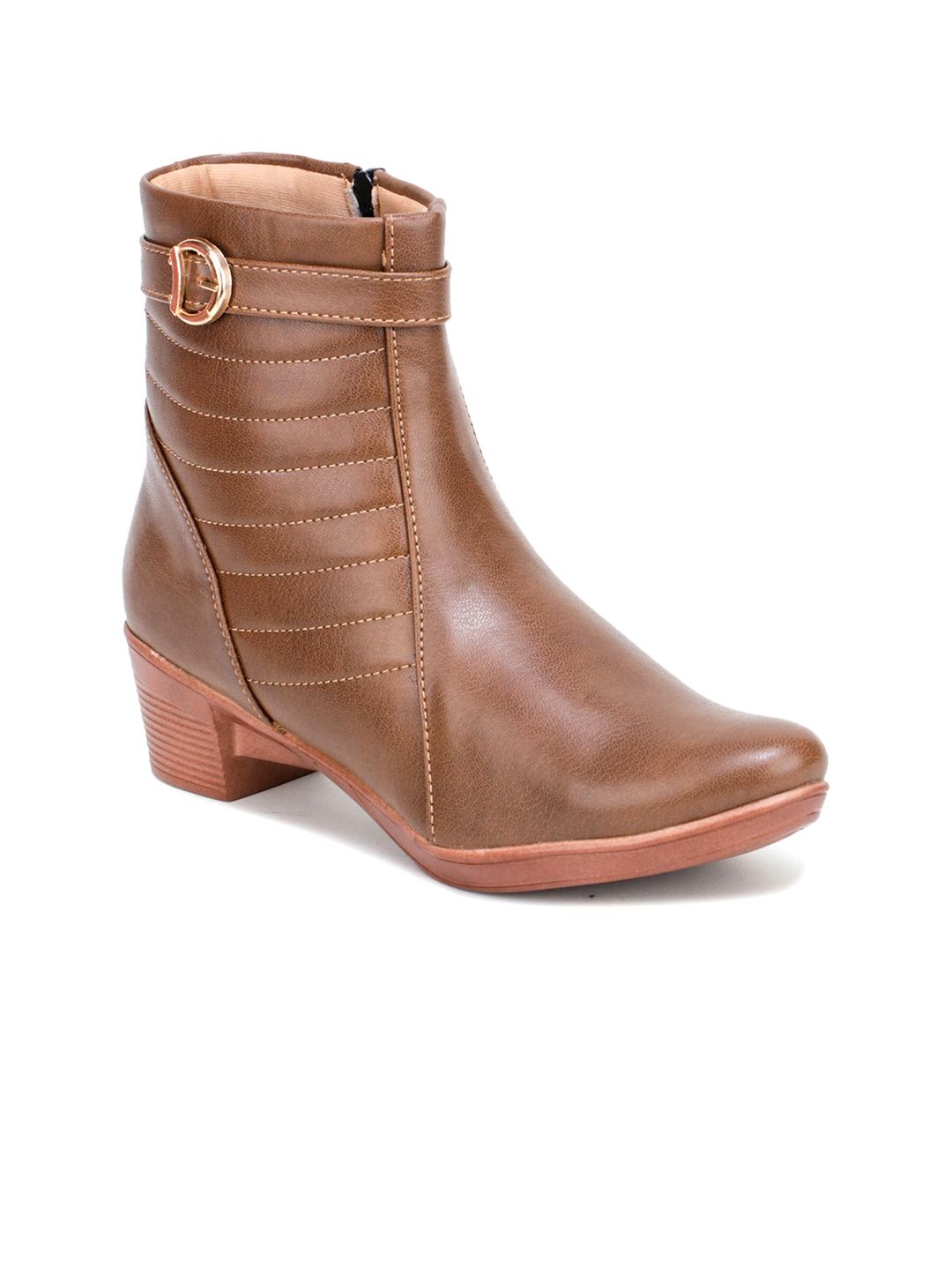 A pair of brown solid regular boots has round toe, zip fastening and back detailSynthetic Leather upper materialCushioned foot bedTextured and patterned PU outsole, has a block heelsWarranty: 1 MonthWarranty provided by brand/manufacturer