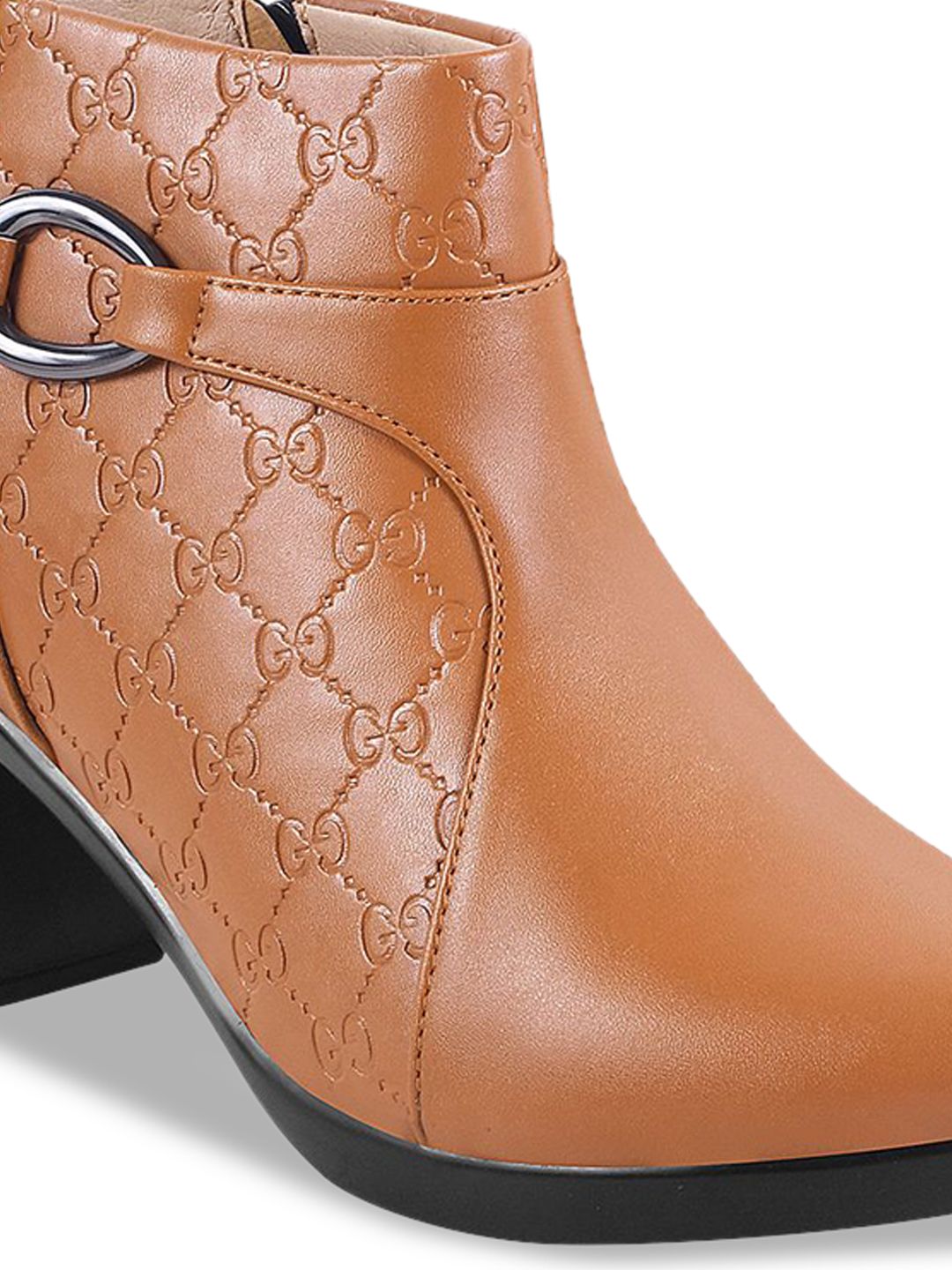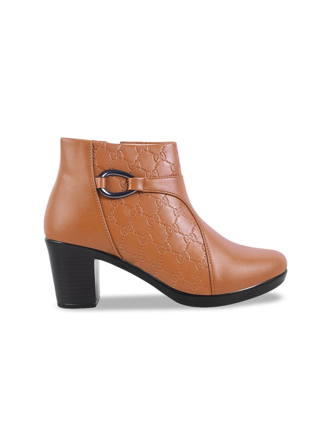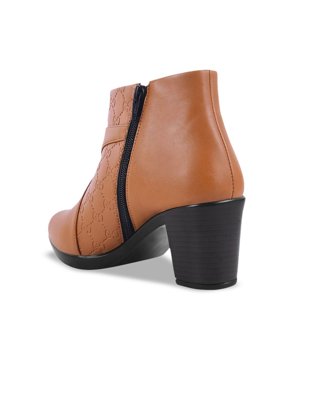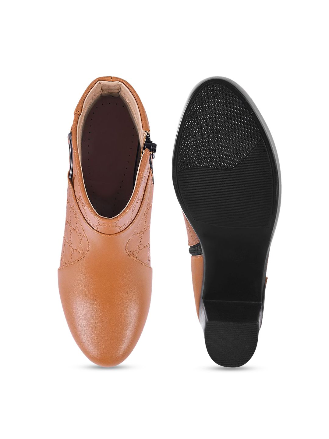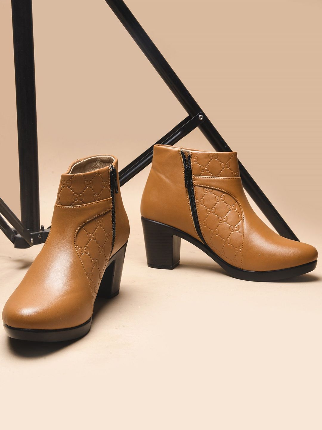 A pair of tan regular boots, has high-top ankle and zip fastening and back detailSynthetic leather solid upper materialCushioned footbedTextured and patterned TPR outsole, has a block-heeled