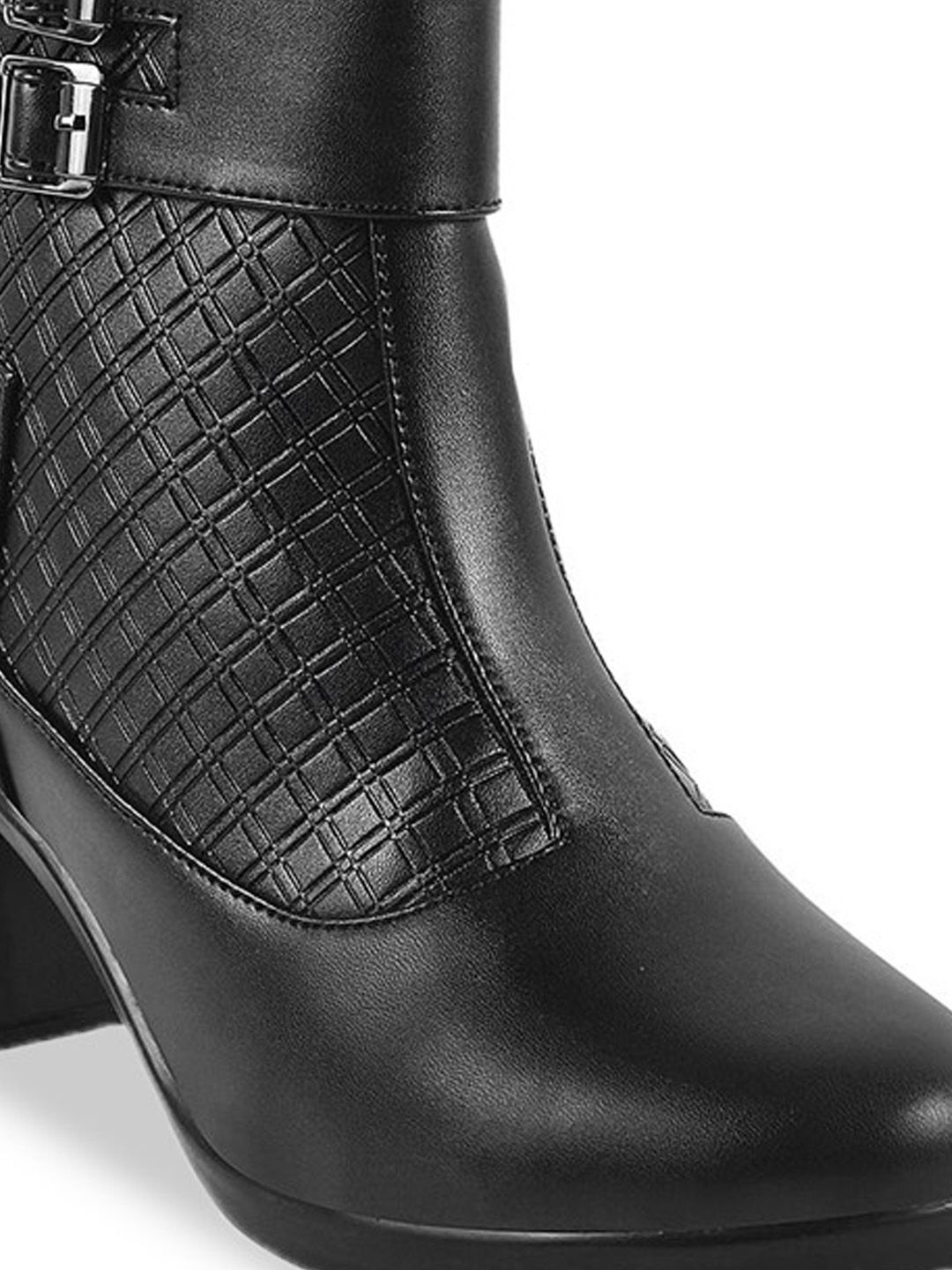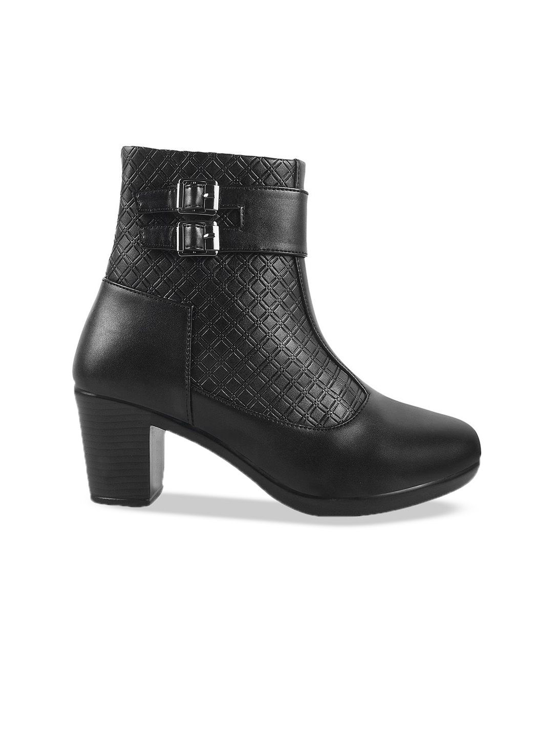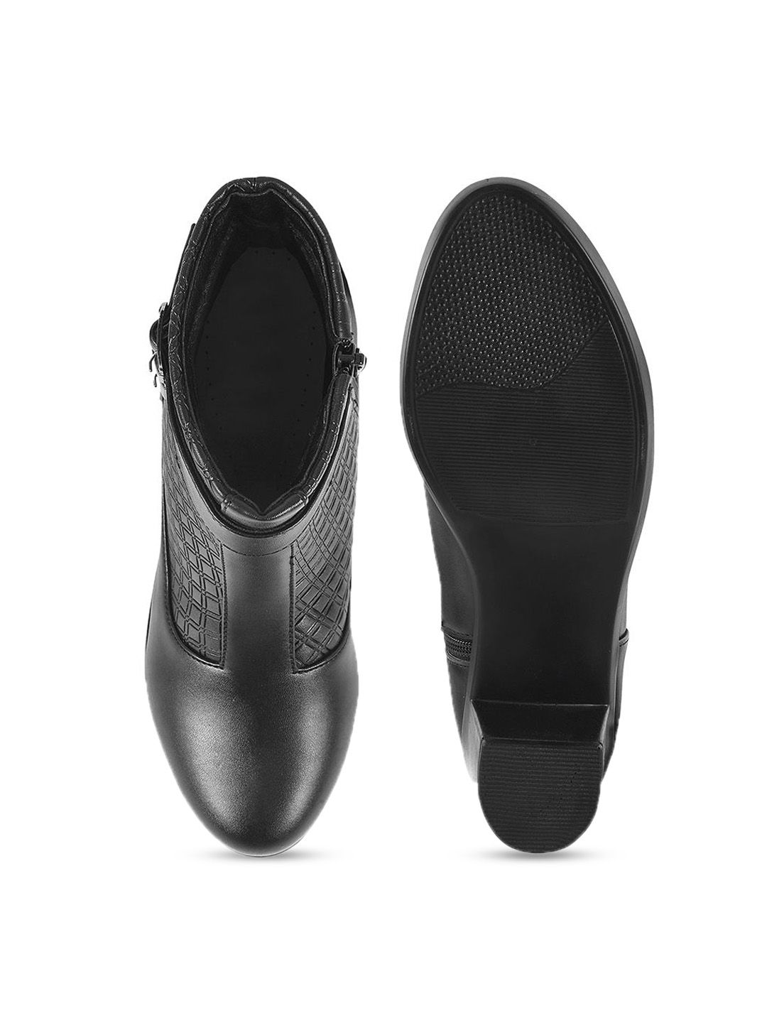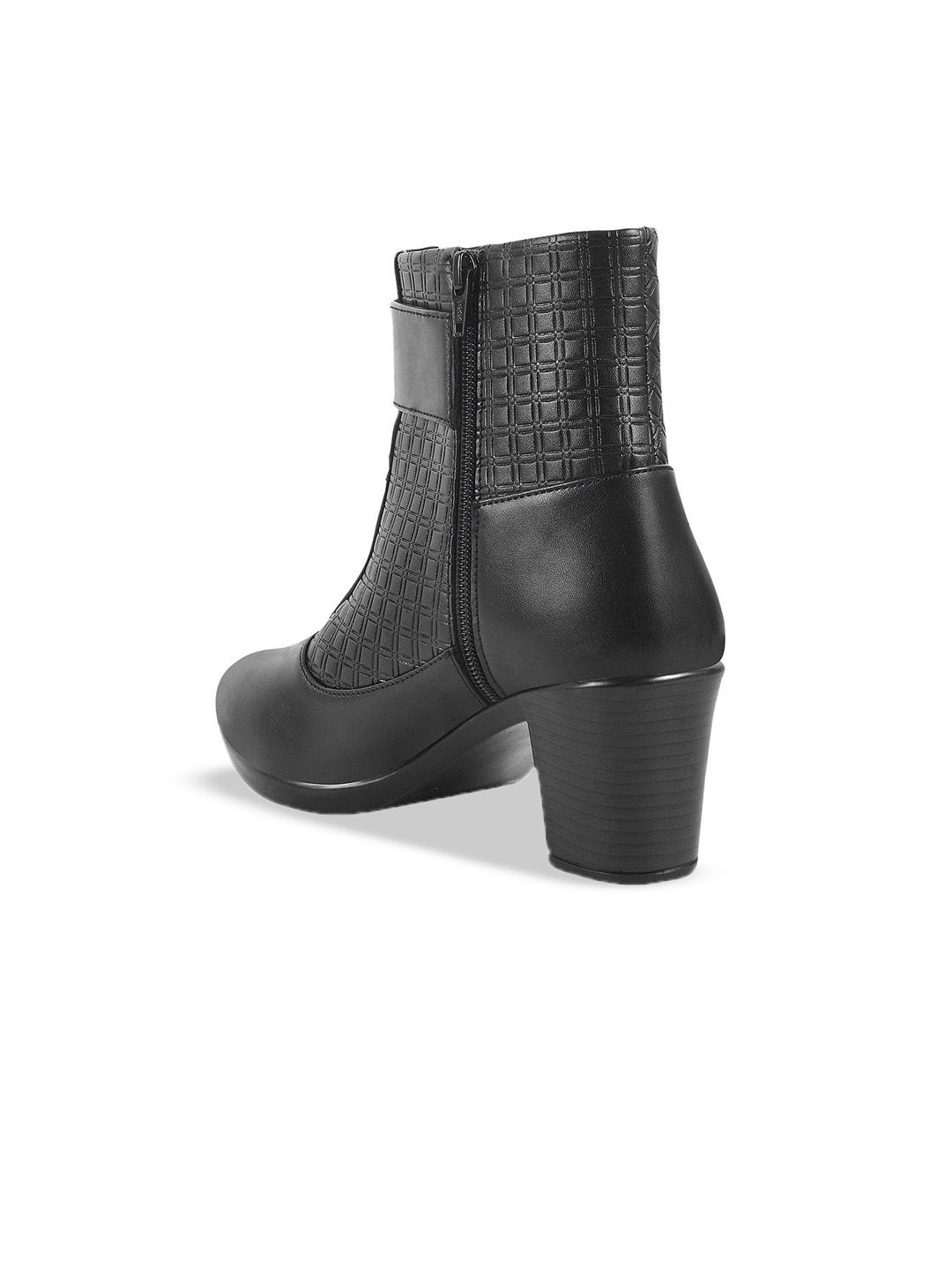 A pair of black regular boots, has high-top ankle and zip fastening and back detailSynthetic leather solid upper materialCushioned footbedTextured and patterned TPR outsole, has a block-heeled