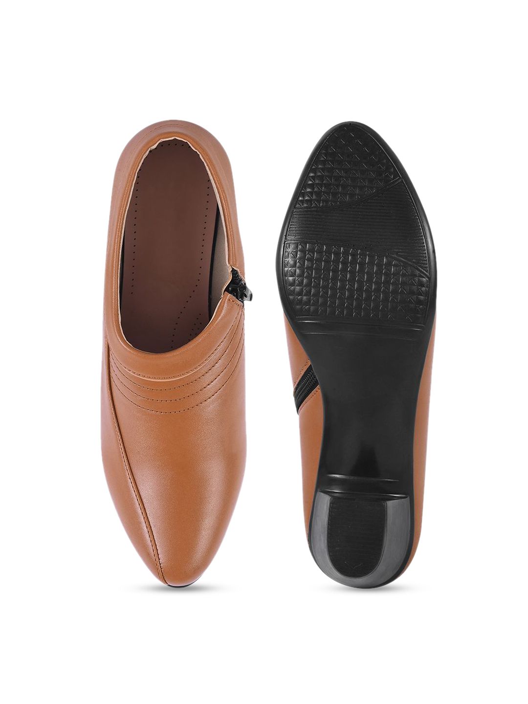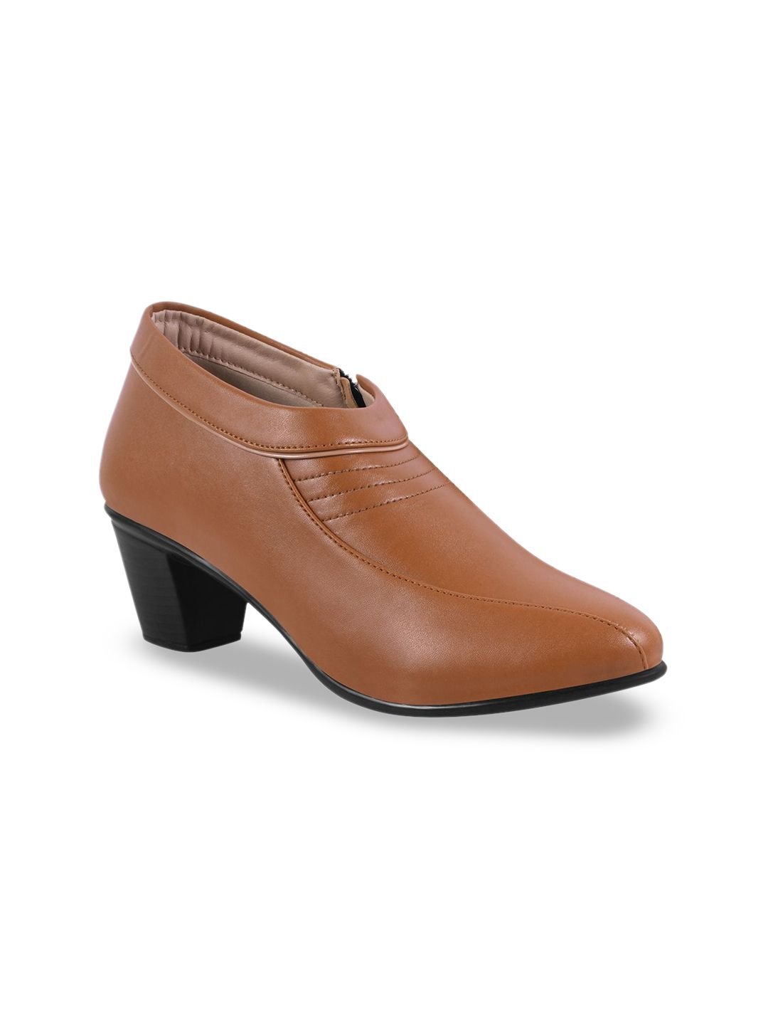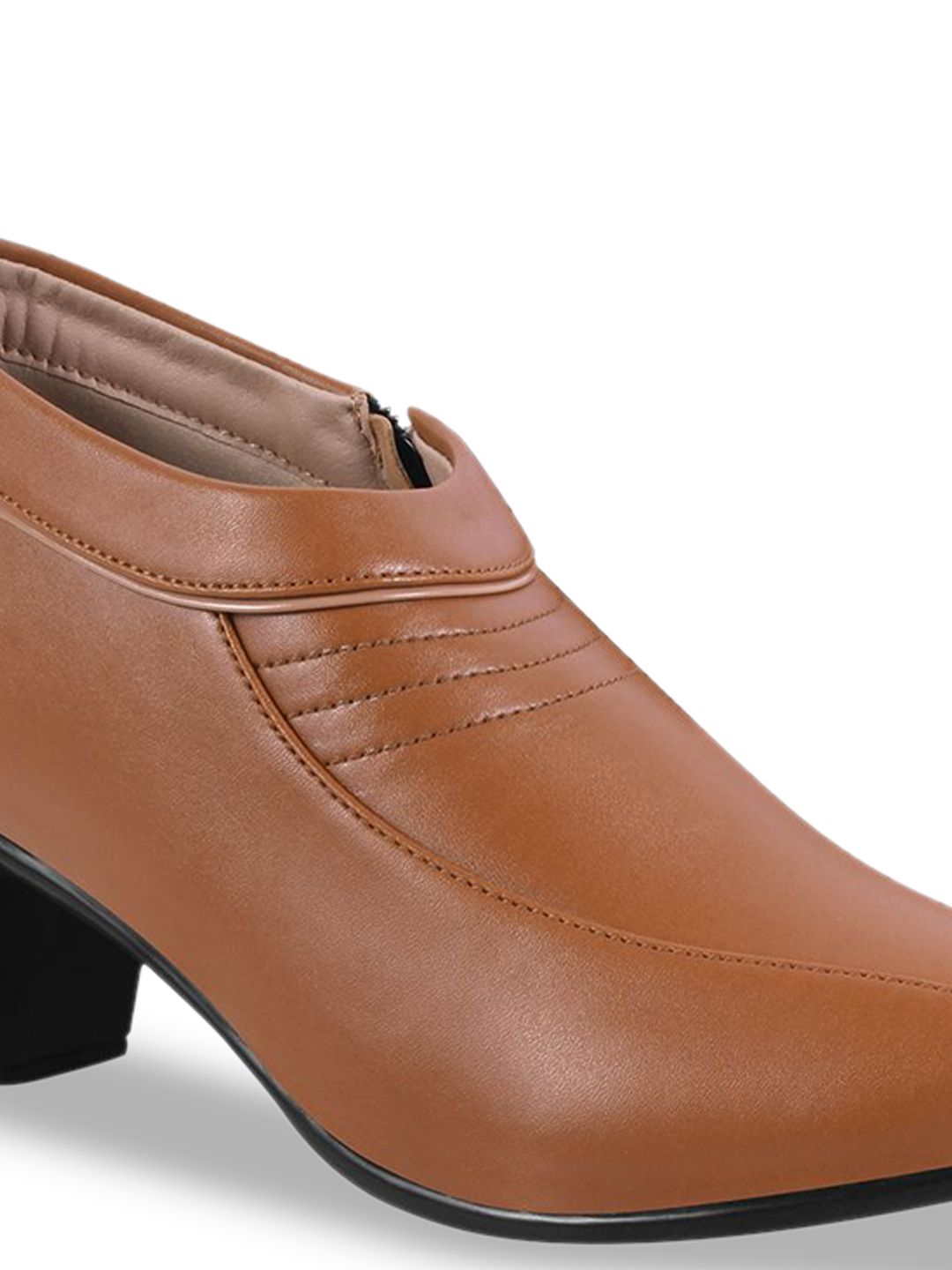 A pair of tan regular boots, has high-top ankle and zip fastening and back detailSynthetic leather solid upper materialCushioned footbedTextured and patterned TPR outsole, has a block-heeled