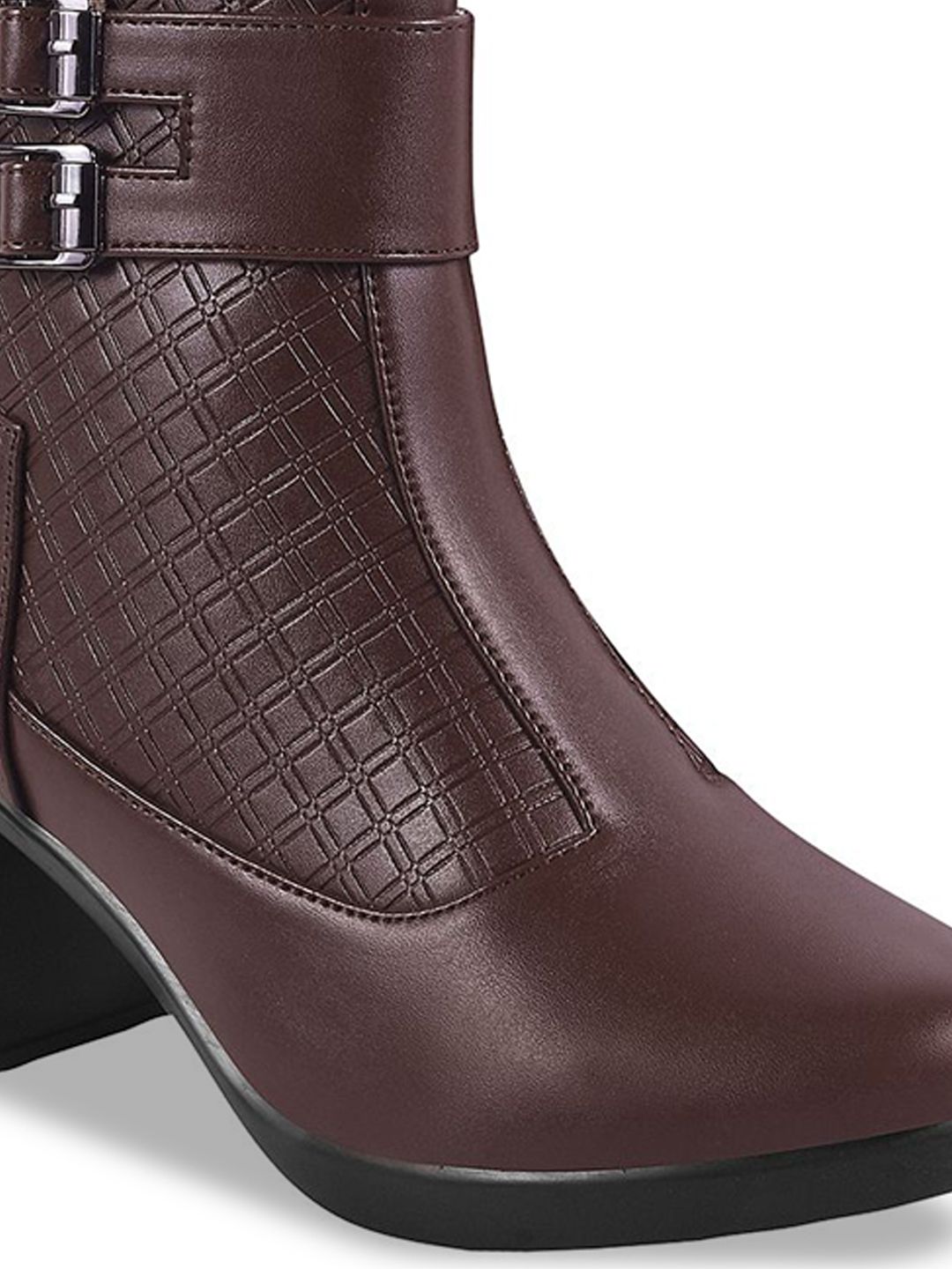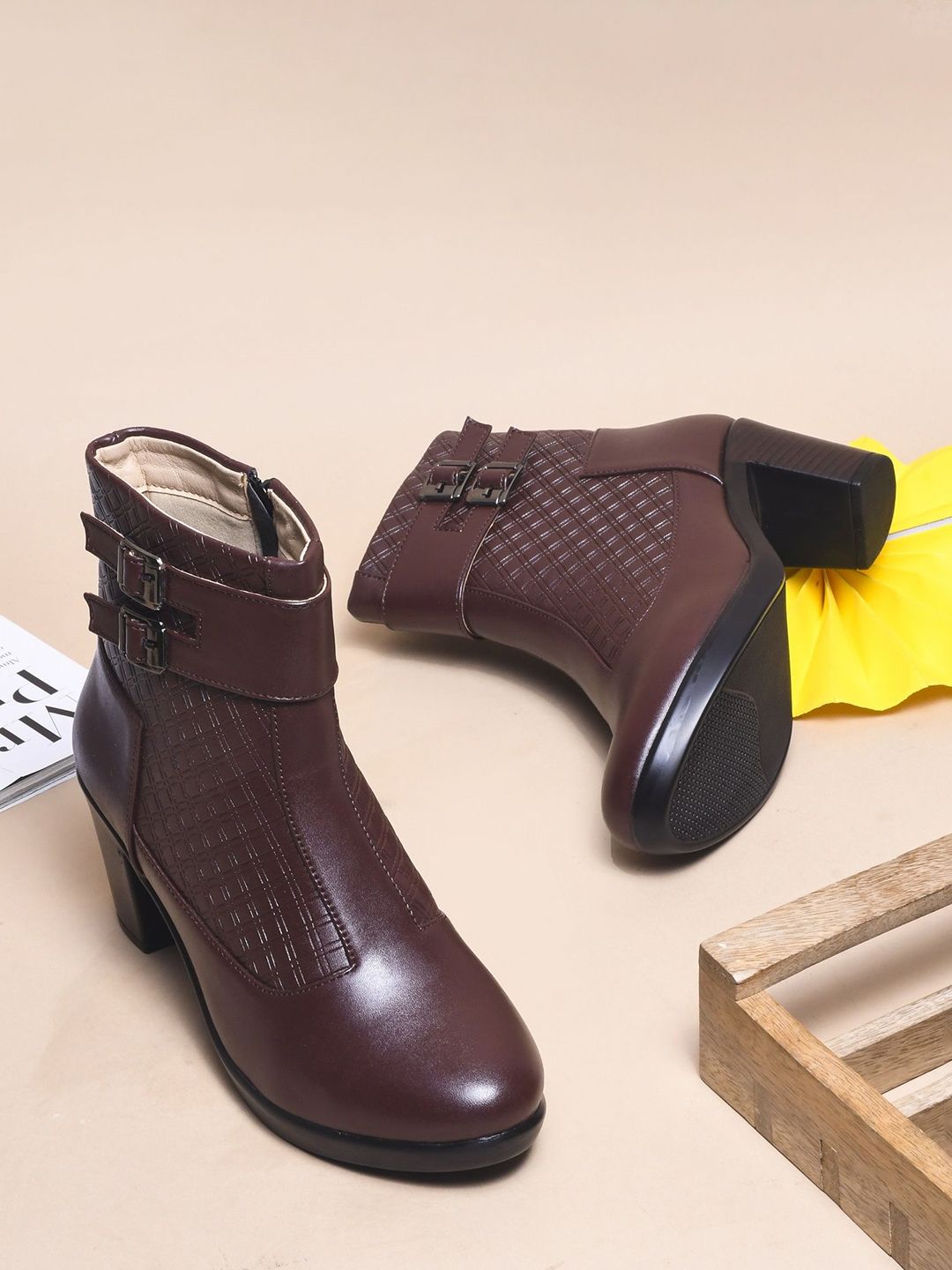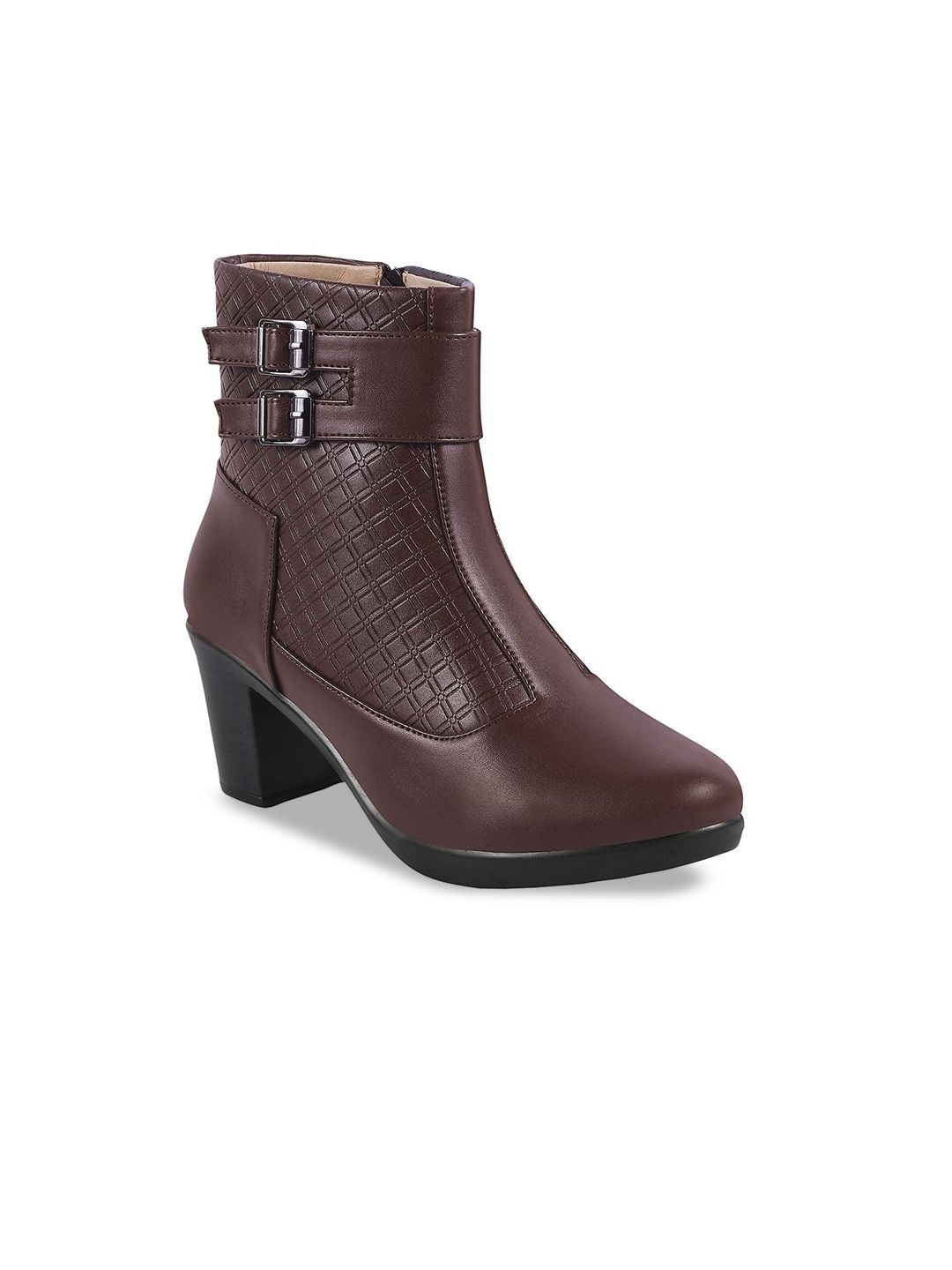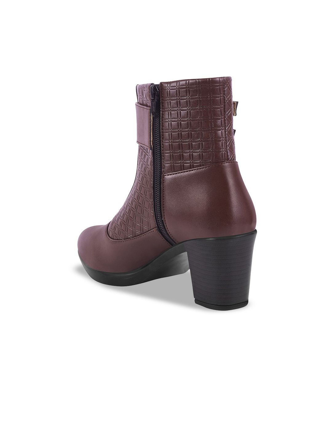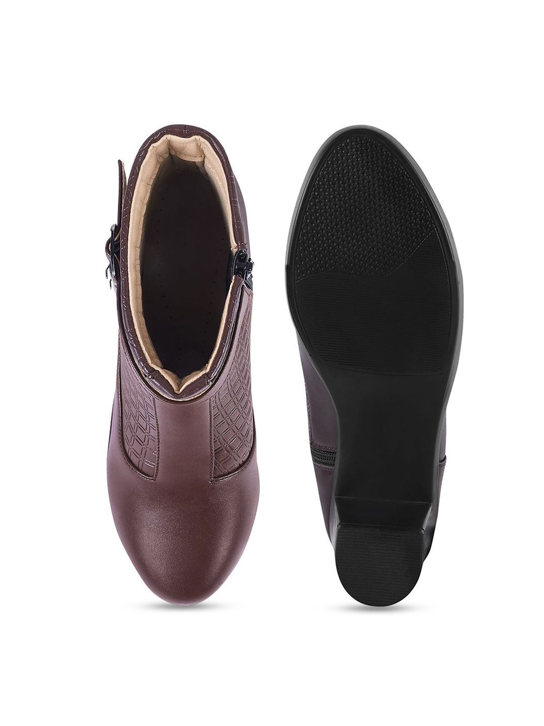 A pair of brown regular boots, has high-top ankle and zip fastening and back detailSynthetic leather solid upper materialCushioned footbedTextured and patterned TPR outsole, has a block-heeled