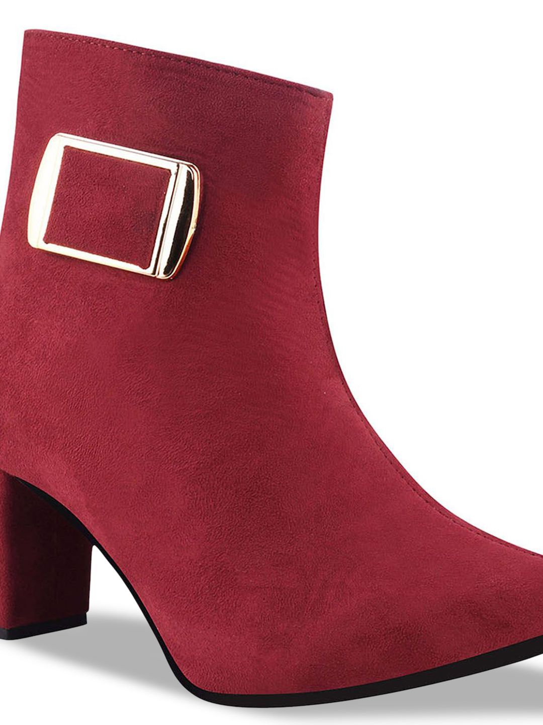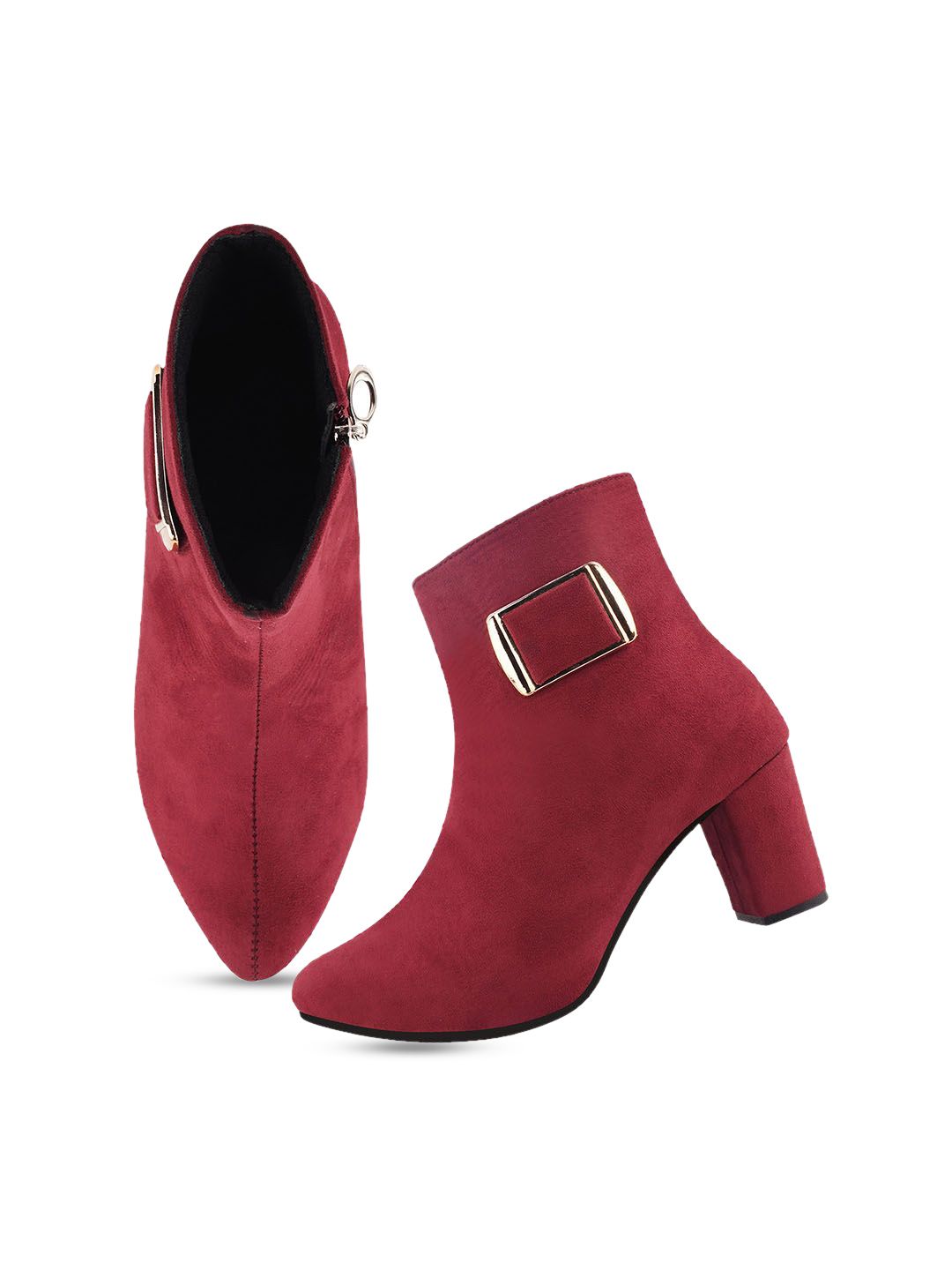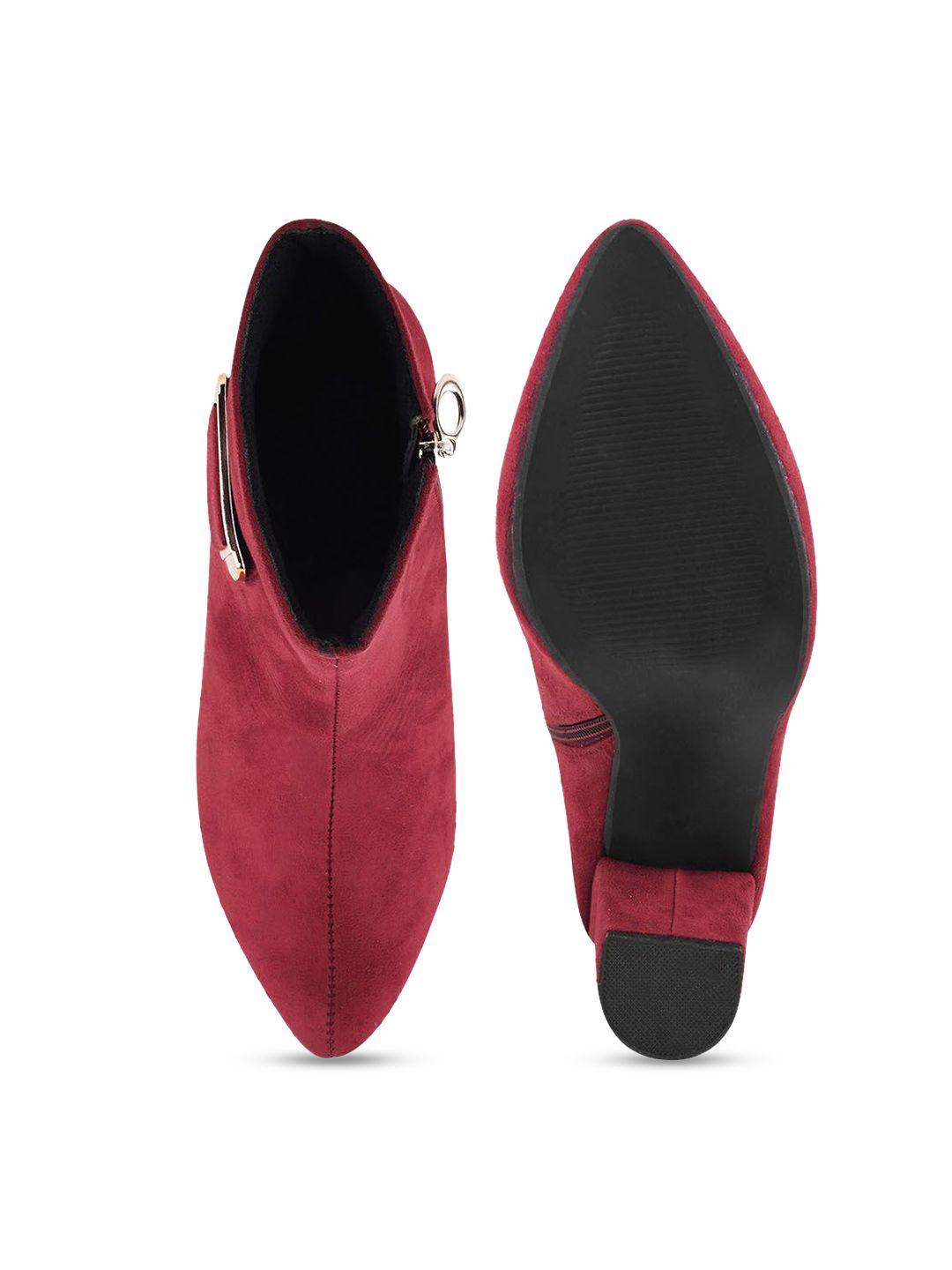 A pair of maroon regular boots, has mid-top ankle and zip up fastening and back detailSuede Solid upper materialCushioned footbedTextured and patterned TPR outsole, has a block-heeled