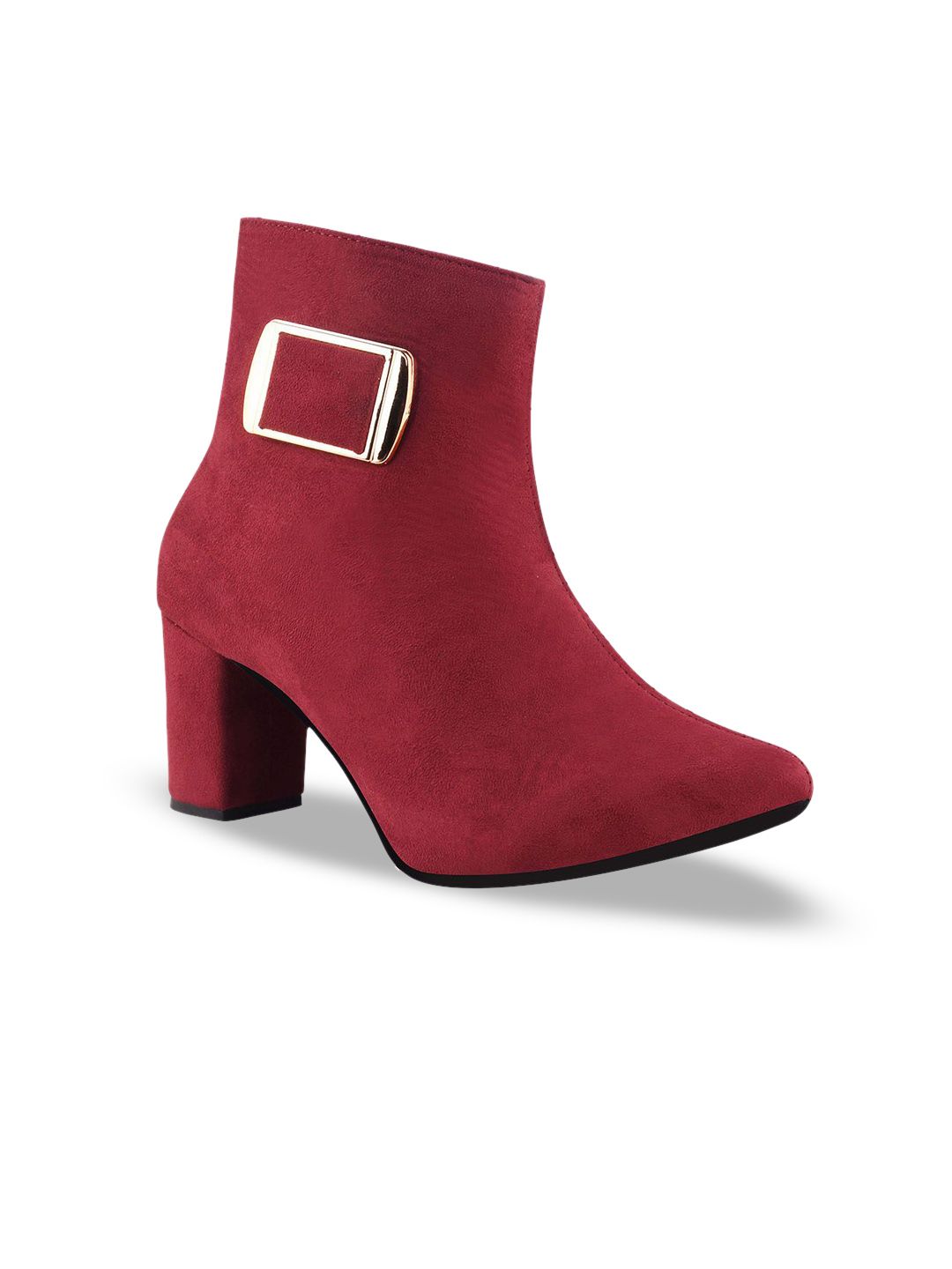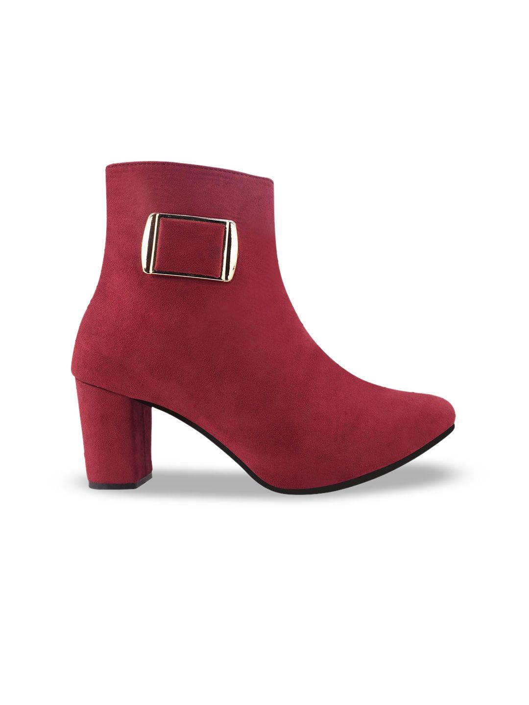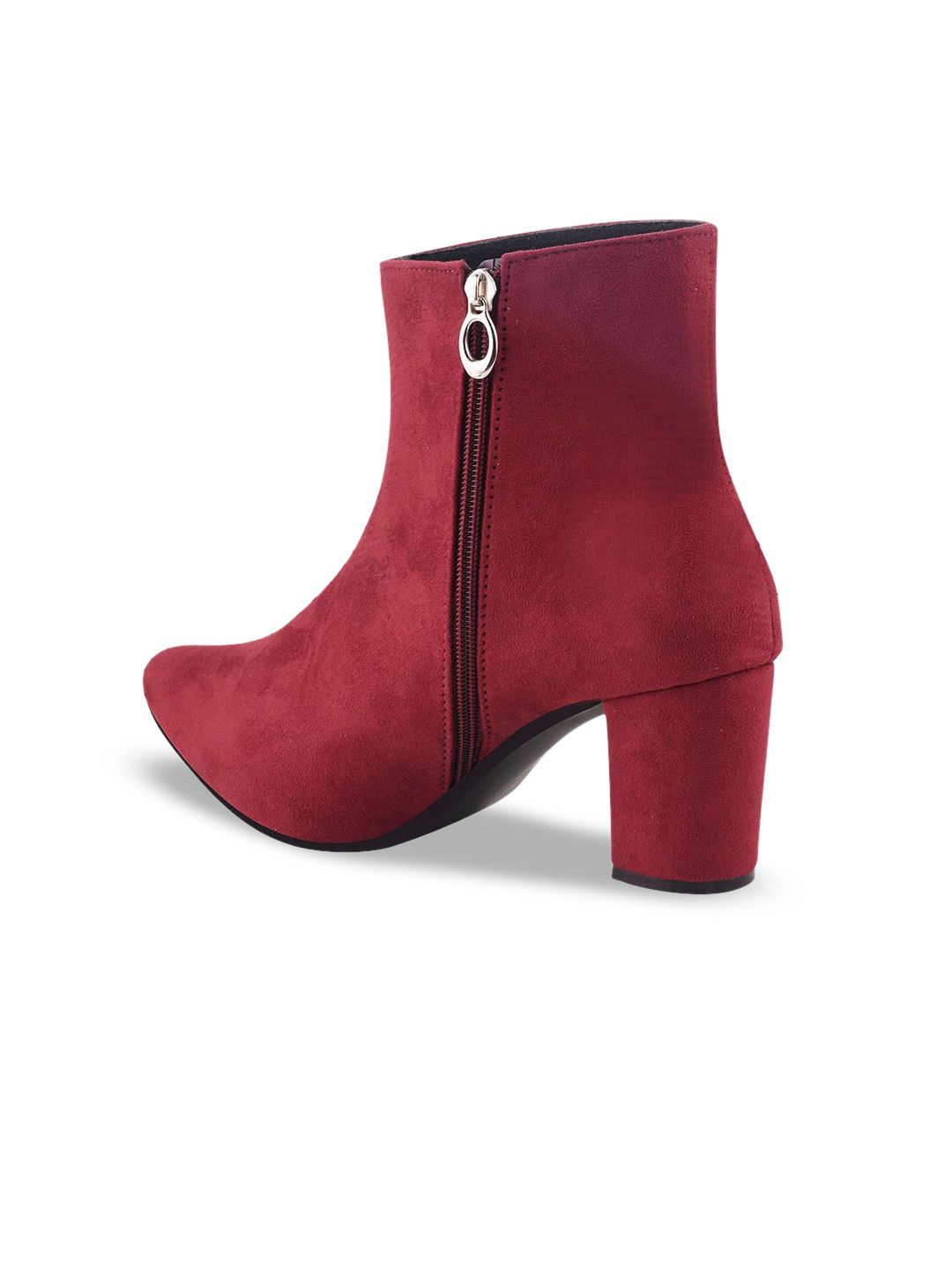 A pair of maroon regular boots, has mid-top ankle and zip up fastening and back detailSuede Solid upper materialCushioned footbedTextured and patterned TPR outsole, has a block-heeled