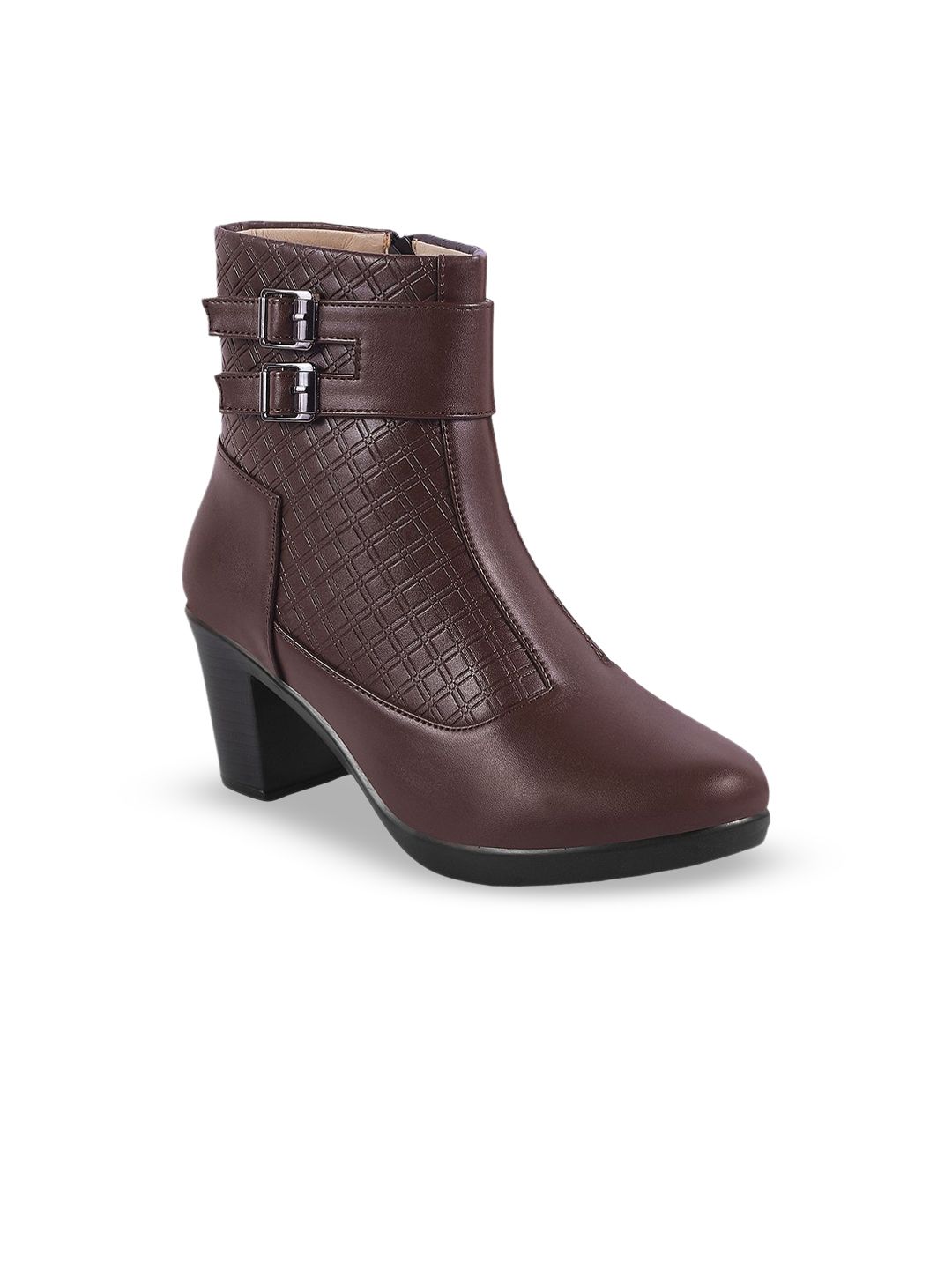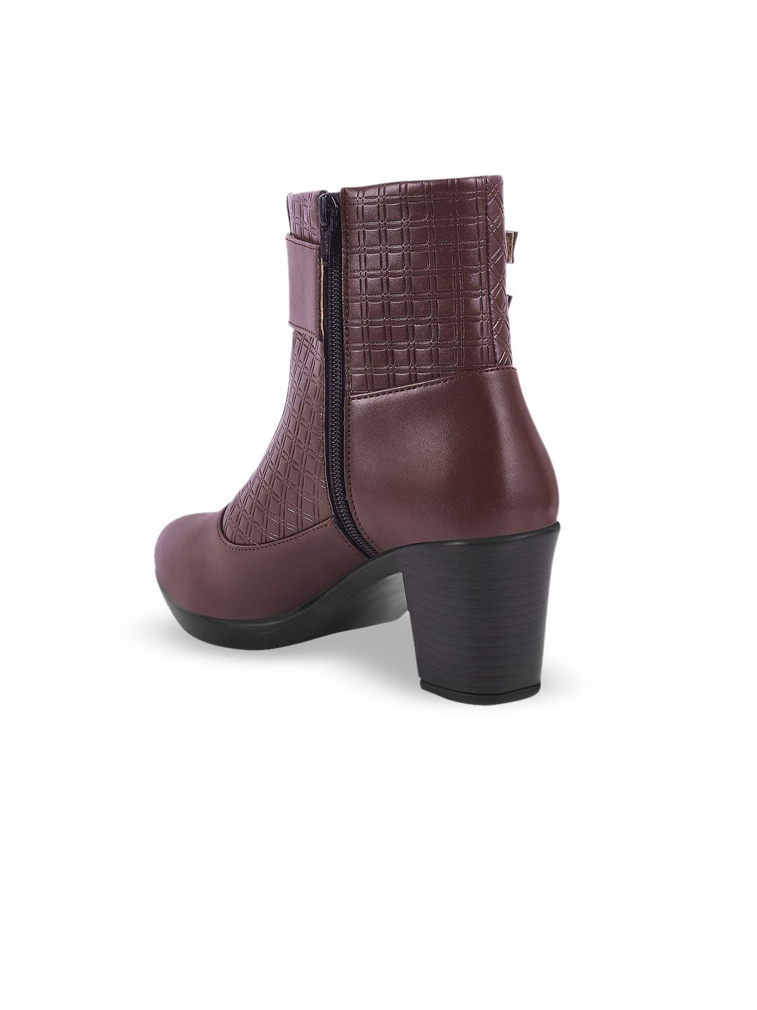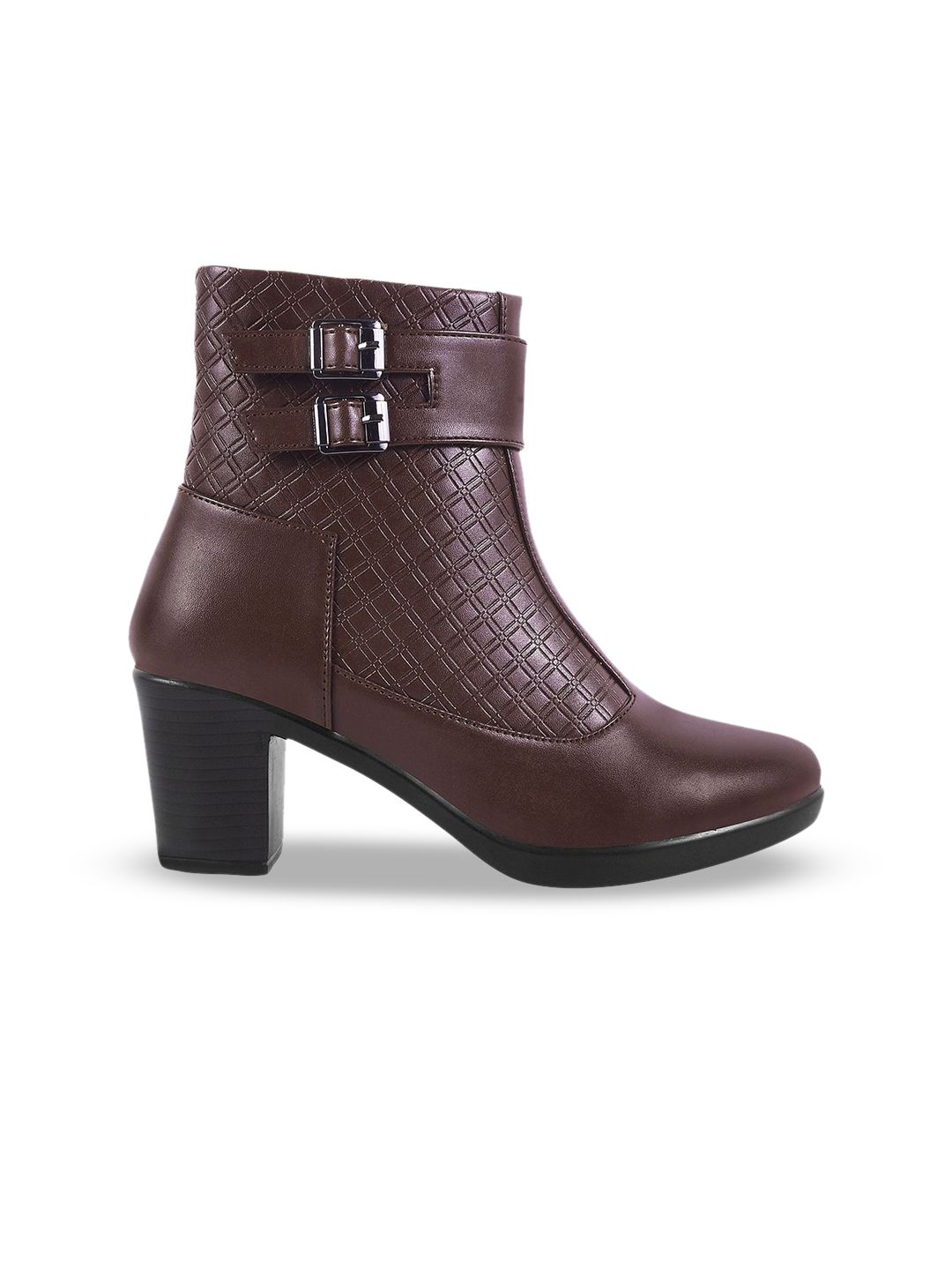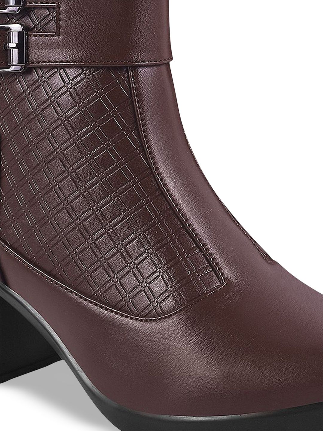 A pair of brown solid regular boots, has high-top ankle and zip fastening and back detailSynthetic leather Solid upper materialCushioned footbedTextured and patterned TPR outsole, has a block-heeled