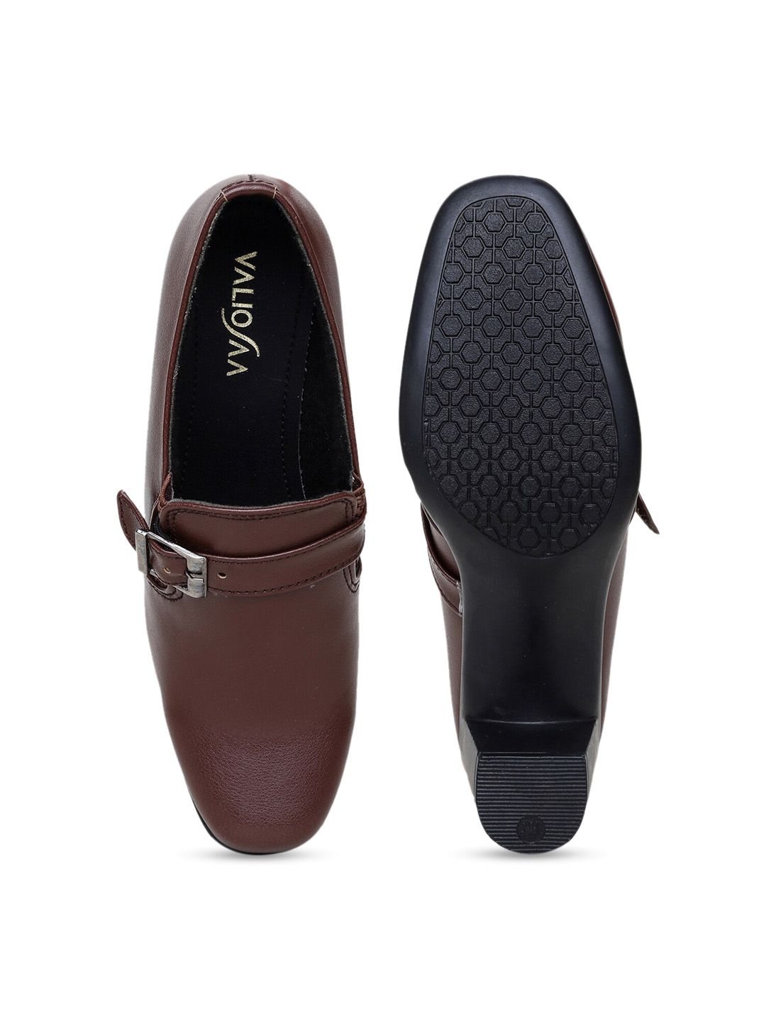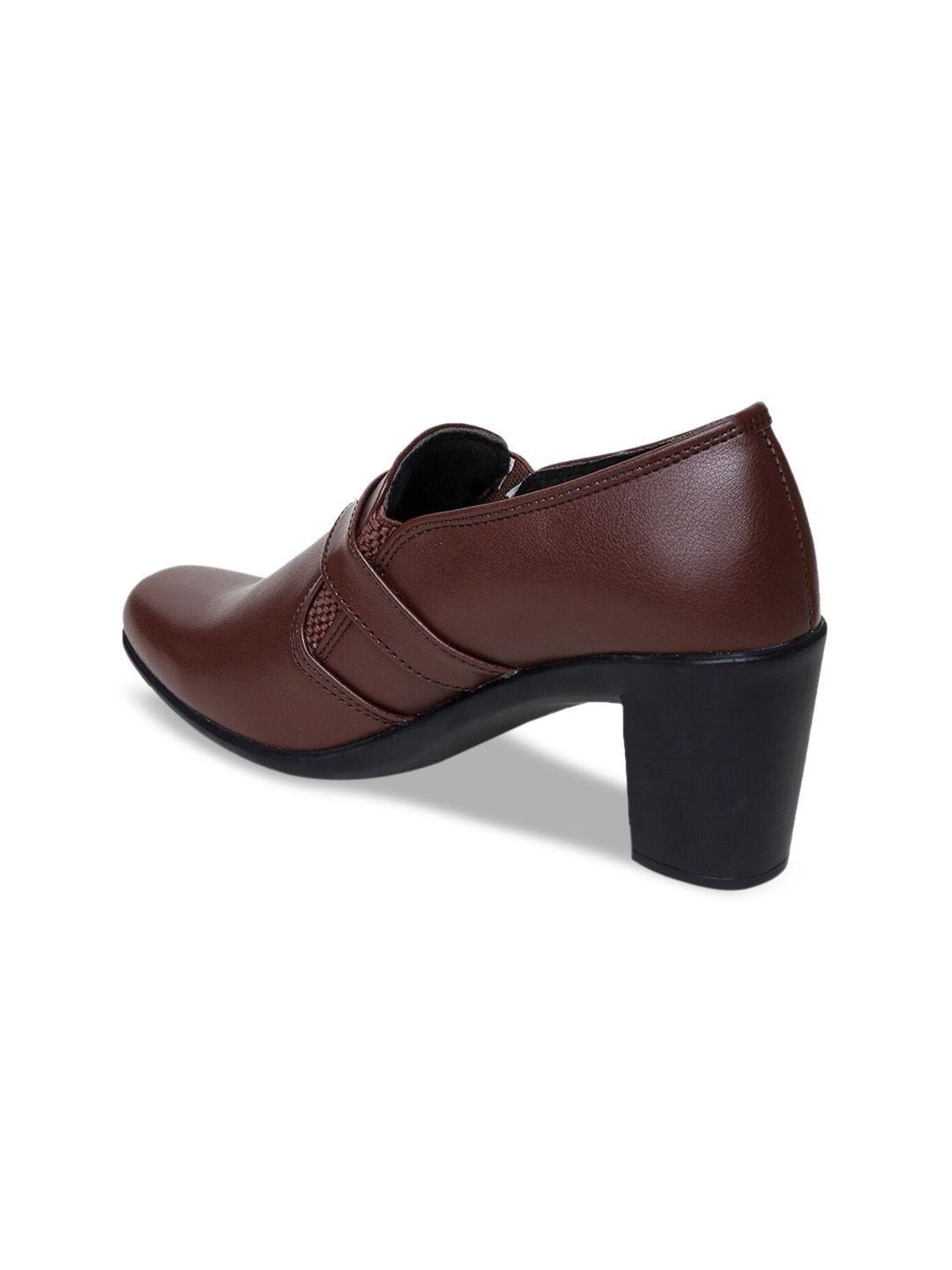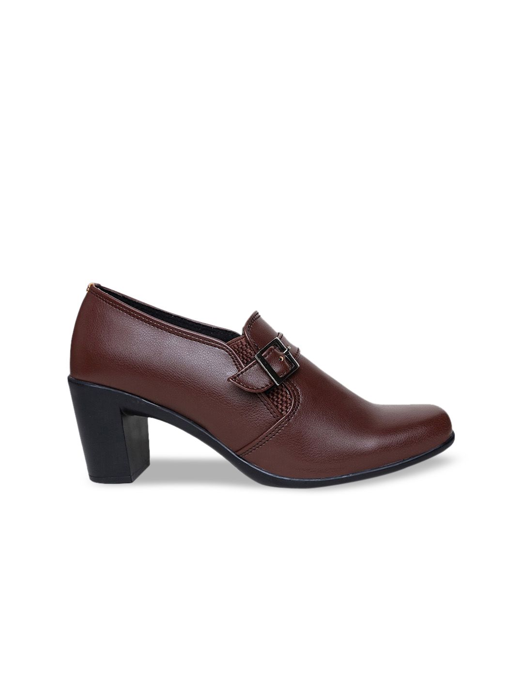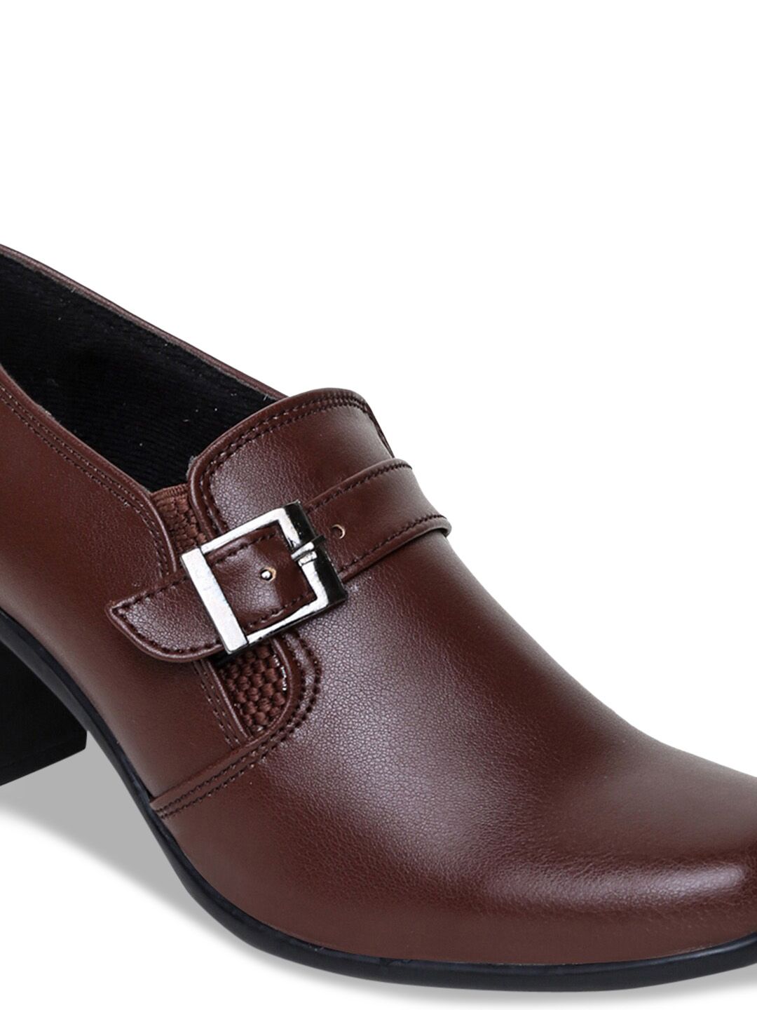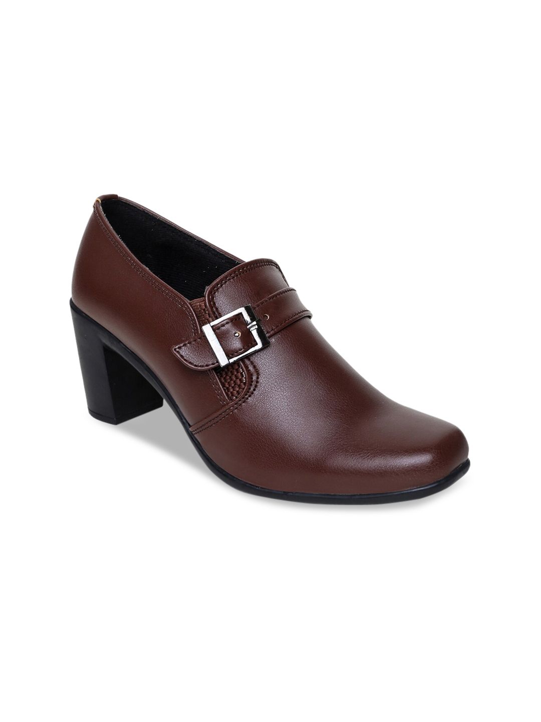 A pair of brown solid square toe boots ,has mid-top styling and buckle detailSynthetic upperCushioned footbedPU outsole