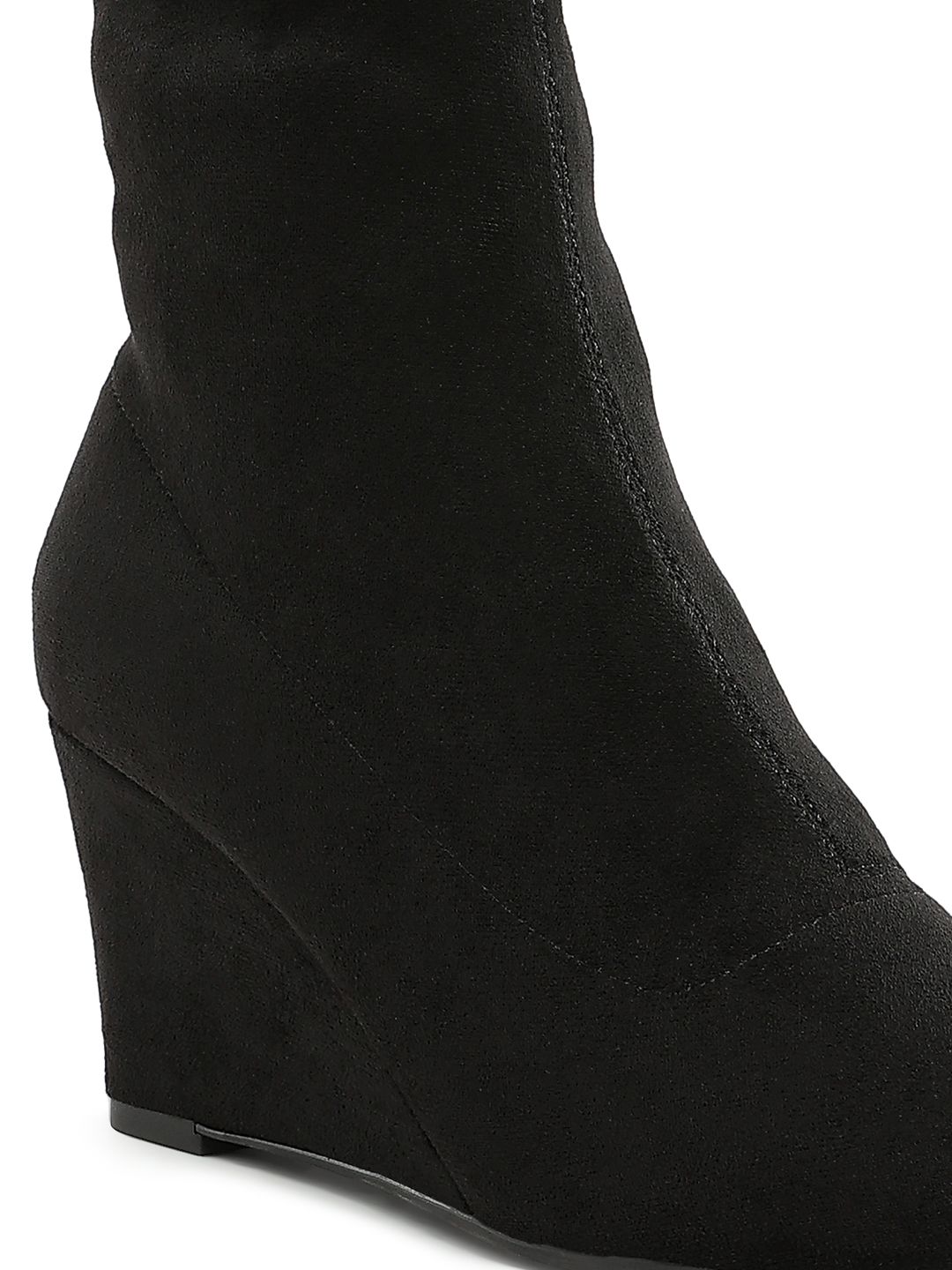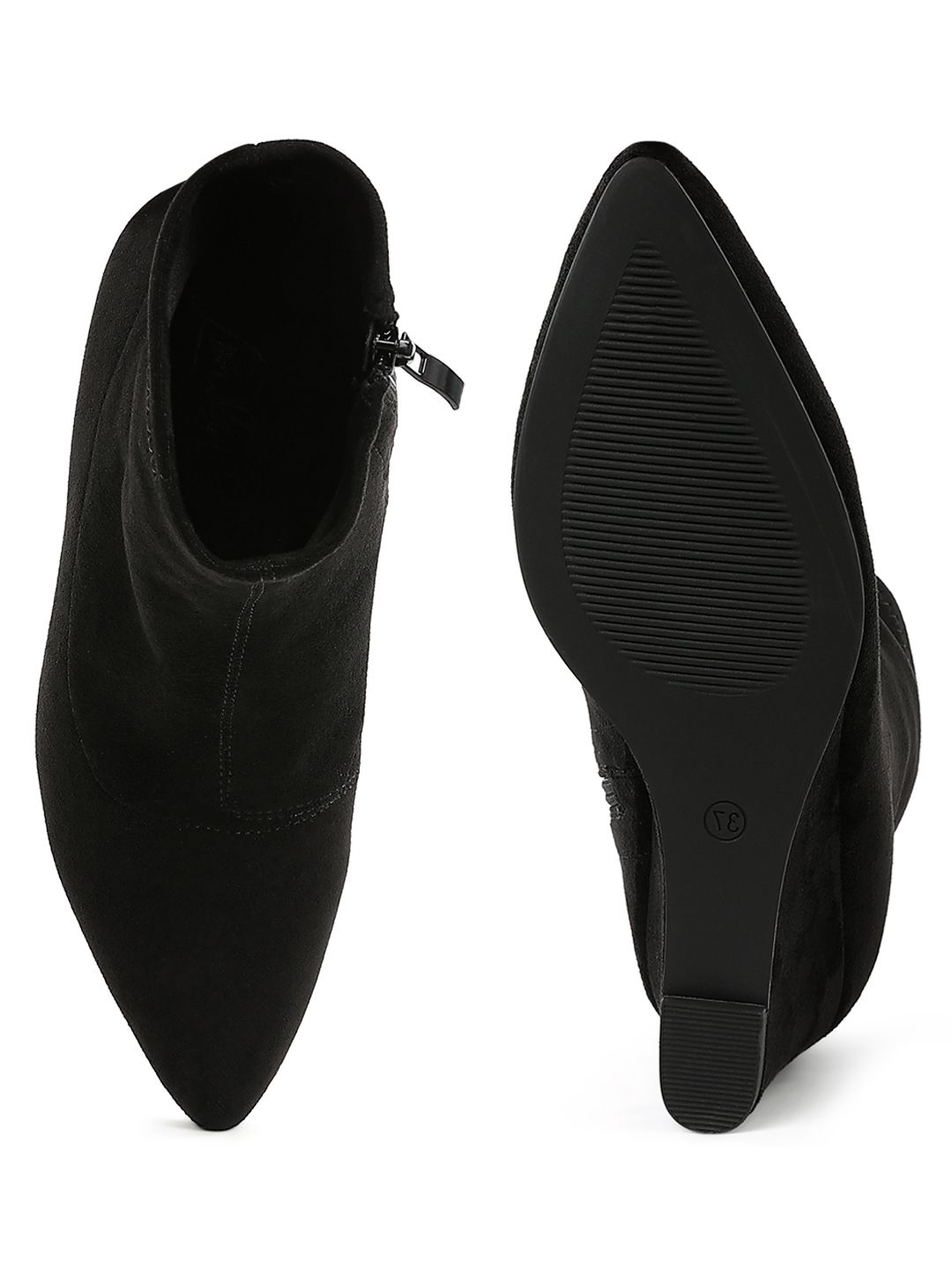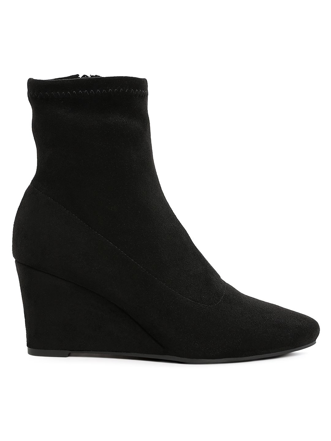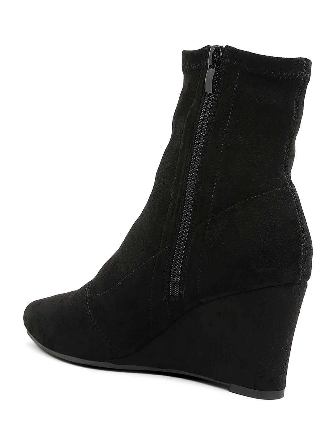 A pair of black regular boots, has mid-top ankle and zip fastening and back detailStretchable Microfiber solid upper materialCushioned footbedTextured and patterned TPR outsole, has a Platform-heeled