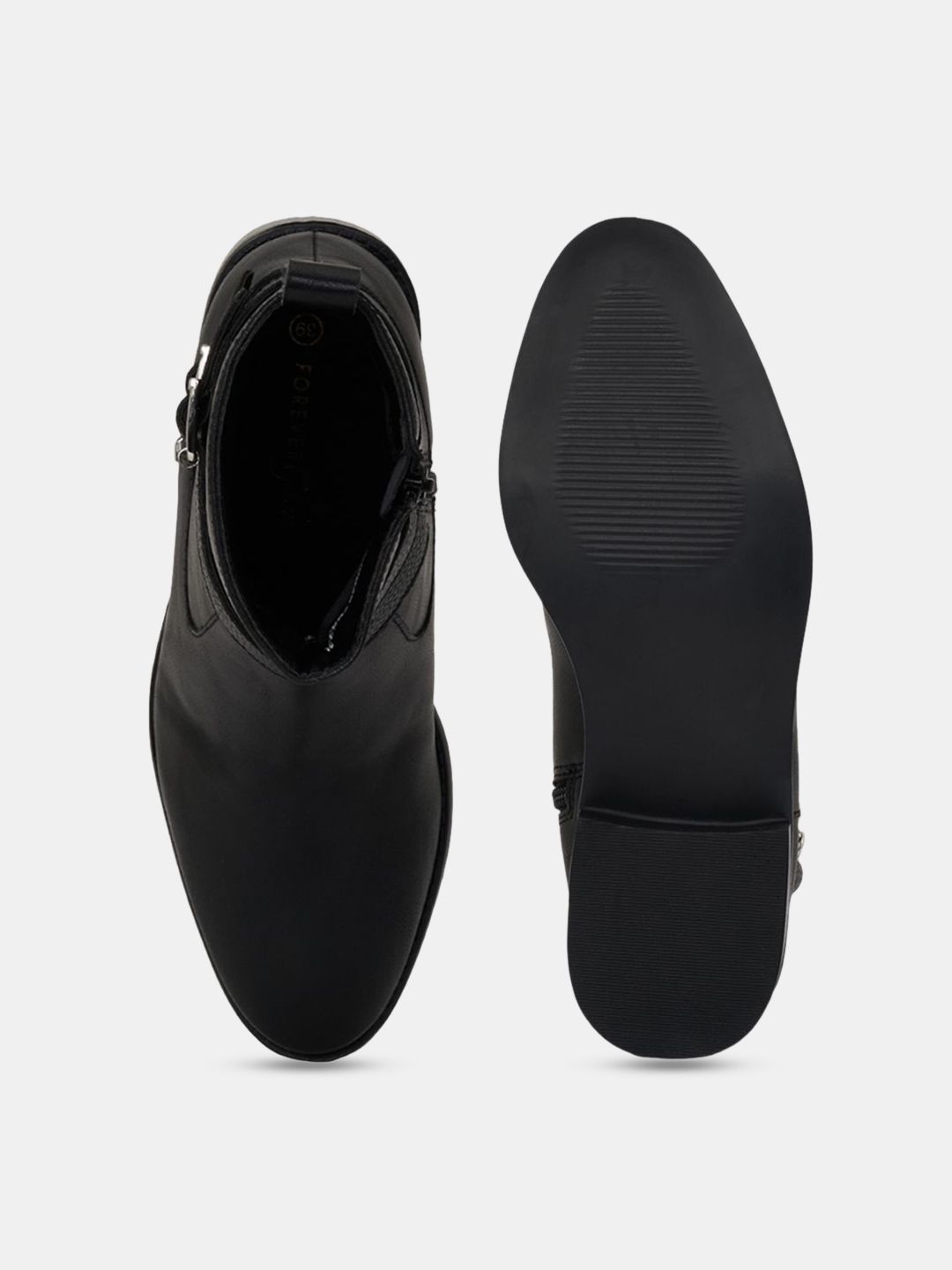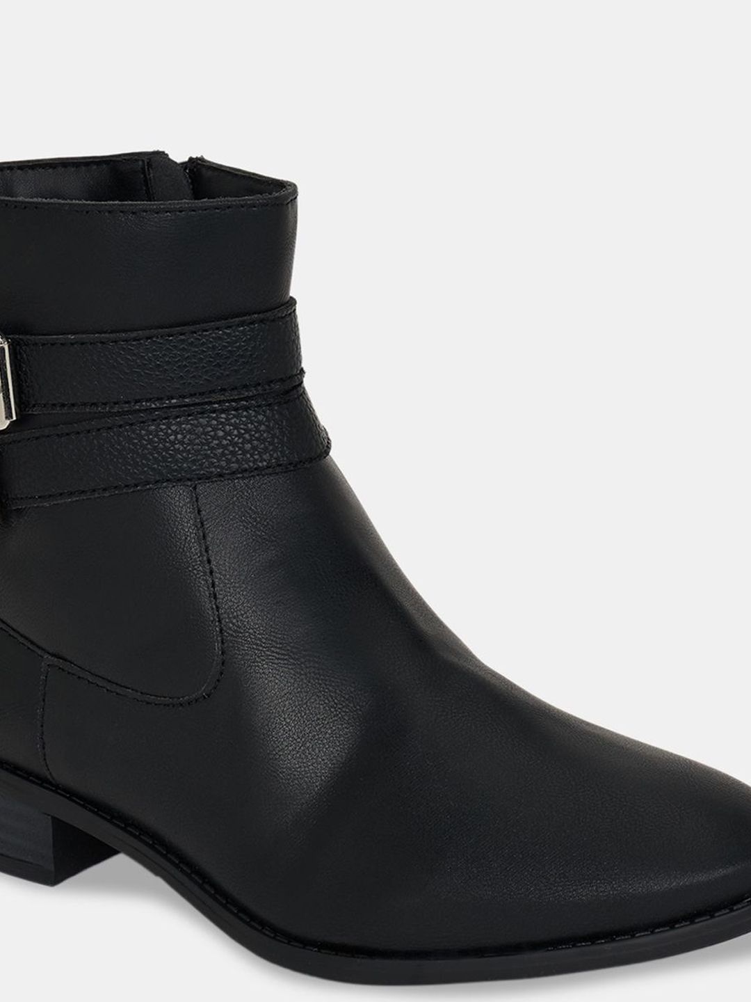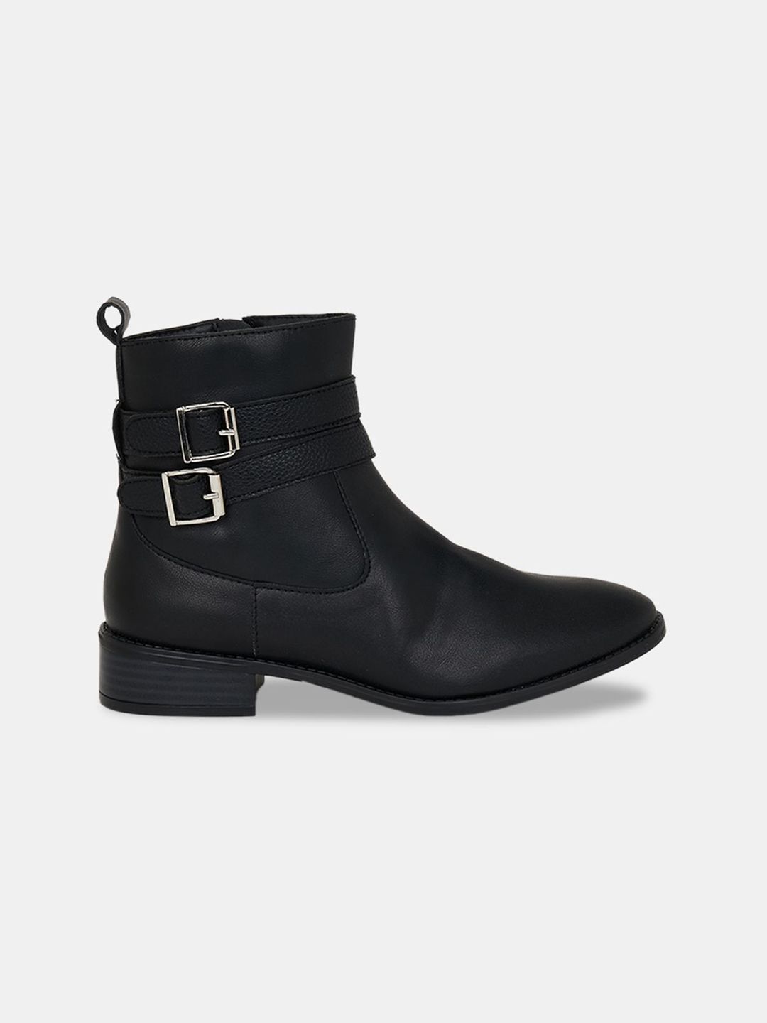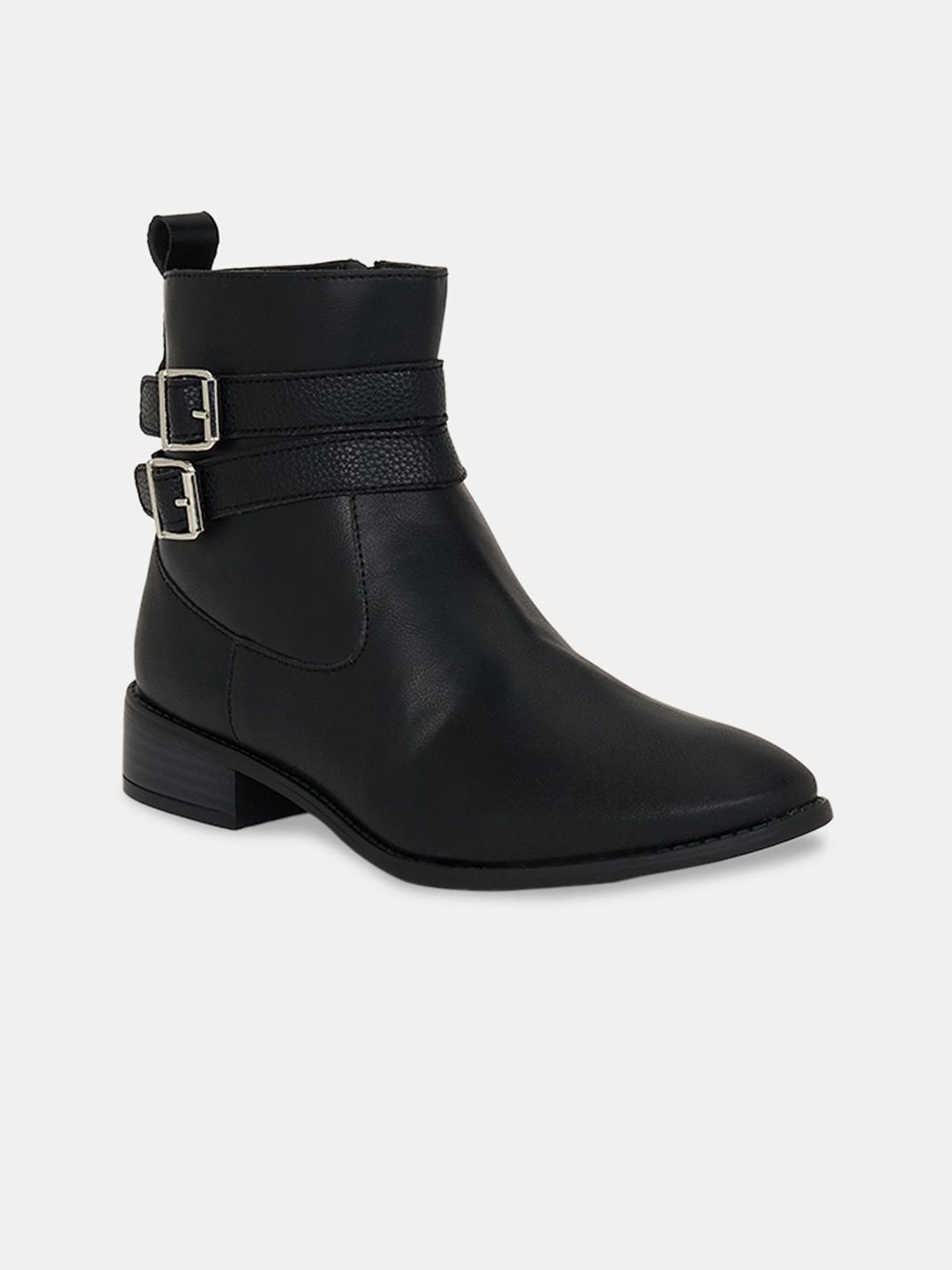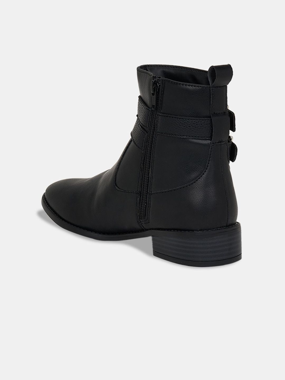 A pair of black winter boots, has regular and buckle fastening and back detailPU upper materialCushioned footbedTextured and patterned TPR outsole, has a block-heeled