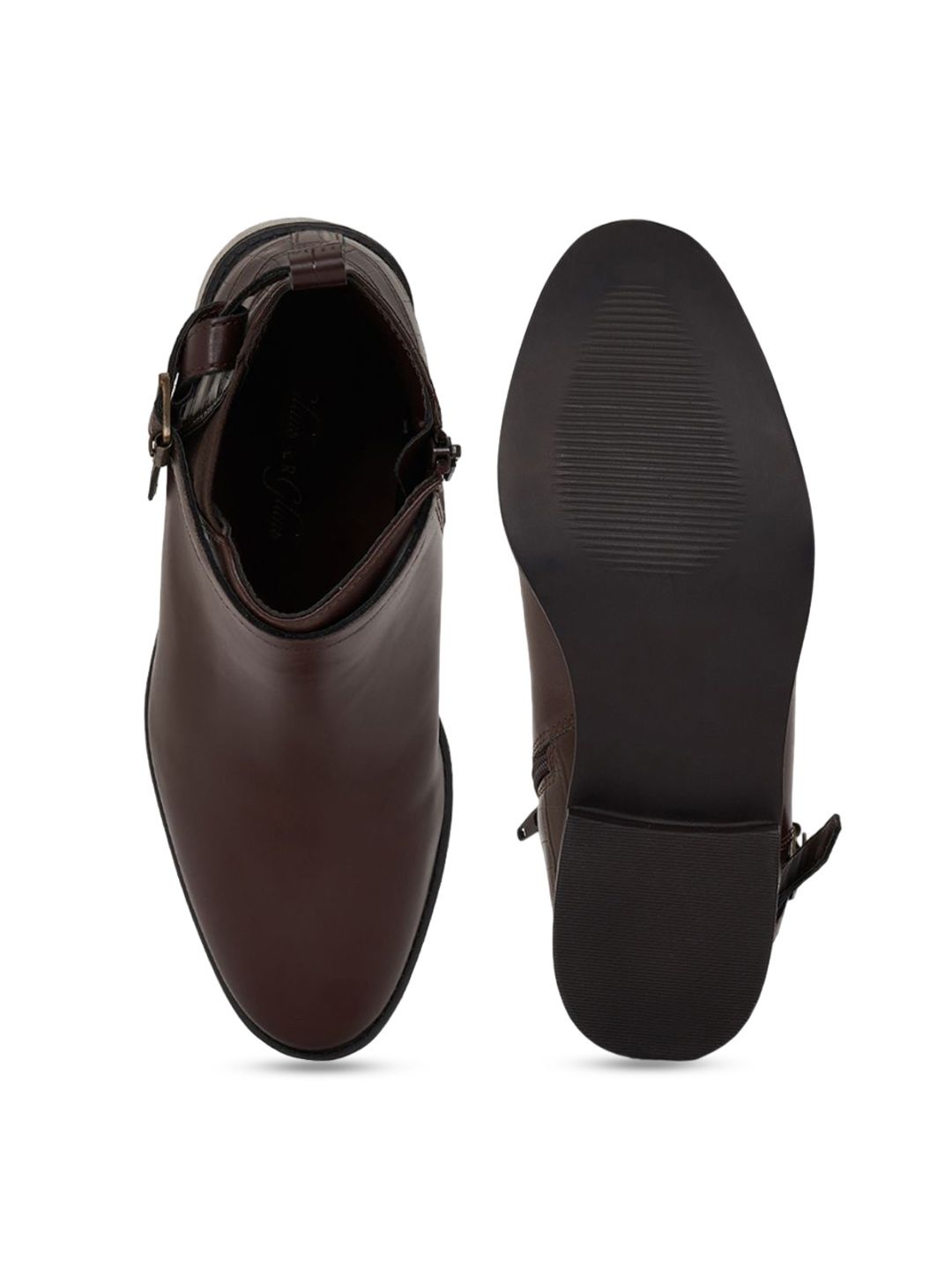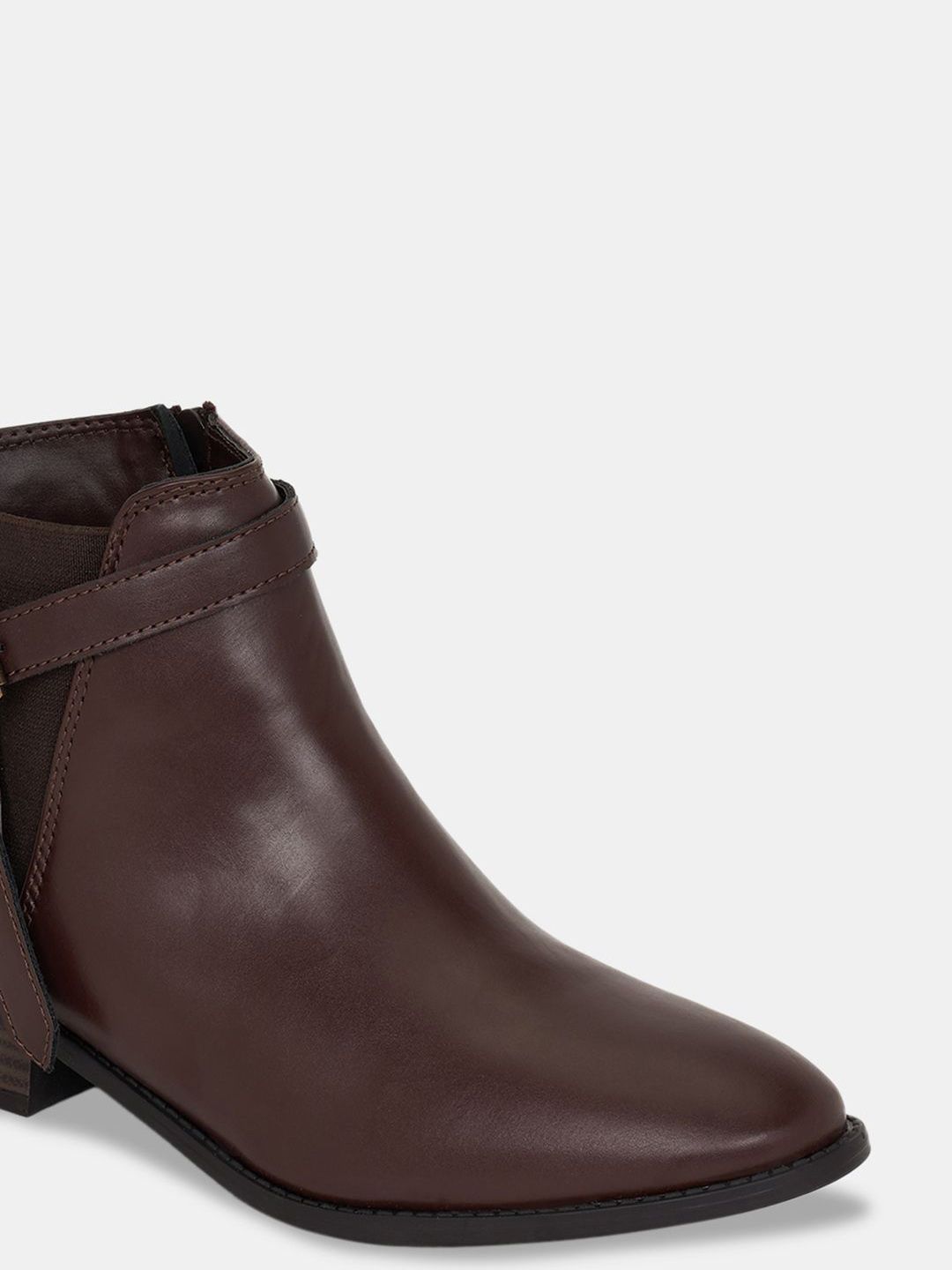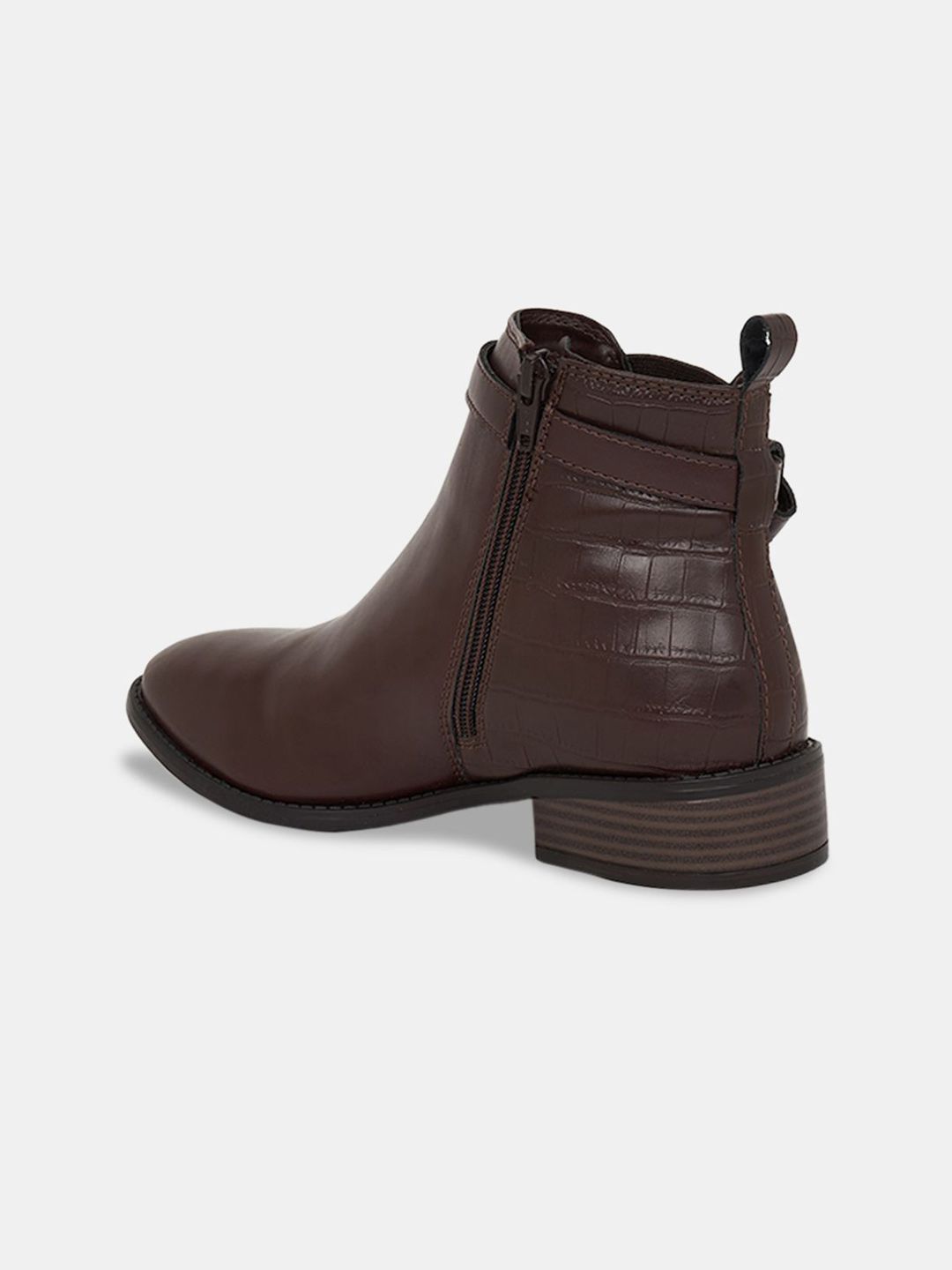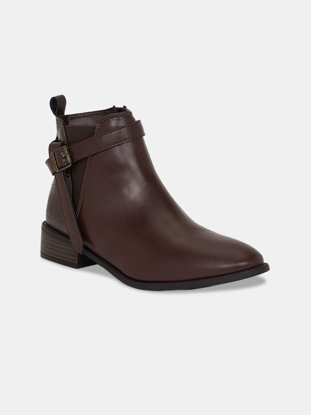 A pair of brown winter boots, has regular and buckle fastening and back detailPU upper materialCushioned footbedTextured and patterned TPR outsole, has a block-heeled