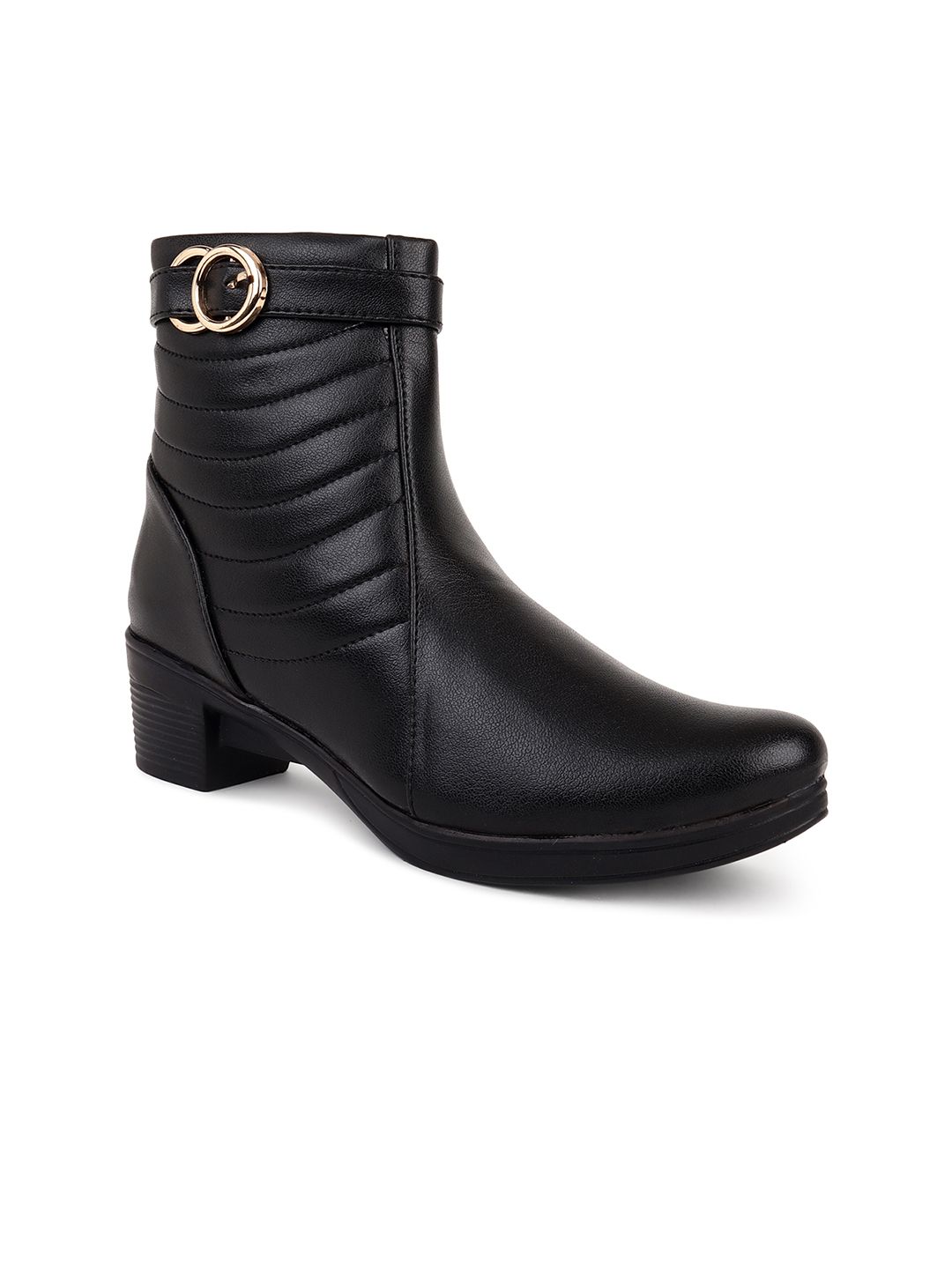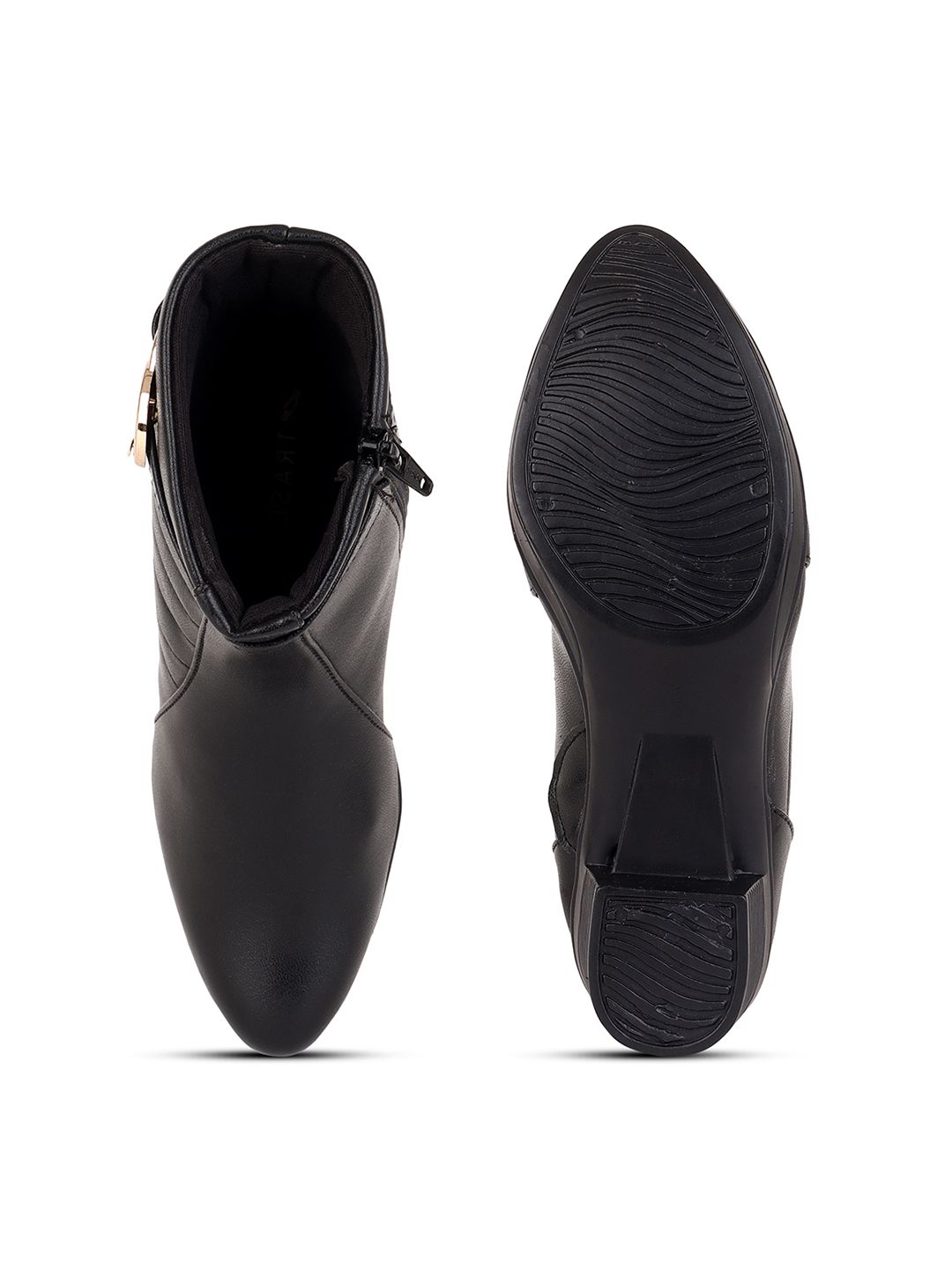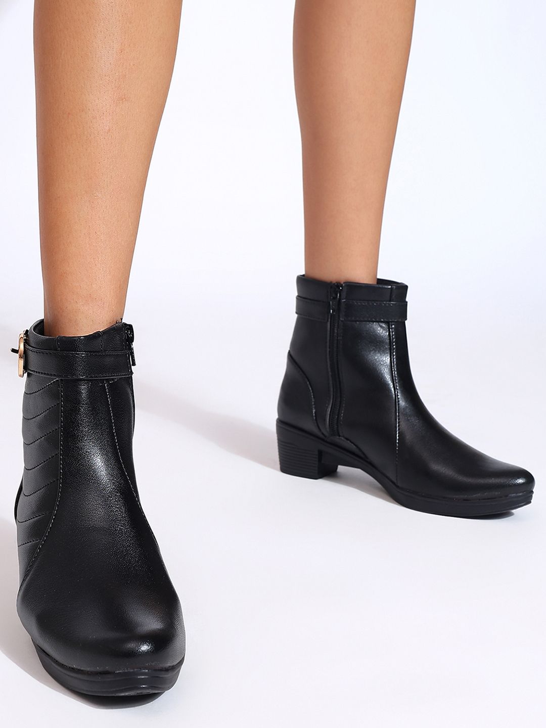 A pair of black solid pointed-toe ankle high heel boots ,has mid-top styling and buckle detail Synthetic Leather upperWarranty: 1 month WarrantyWarranty provided by brand/manufacturer