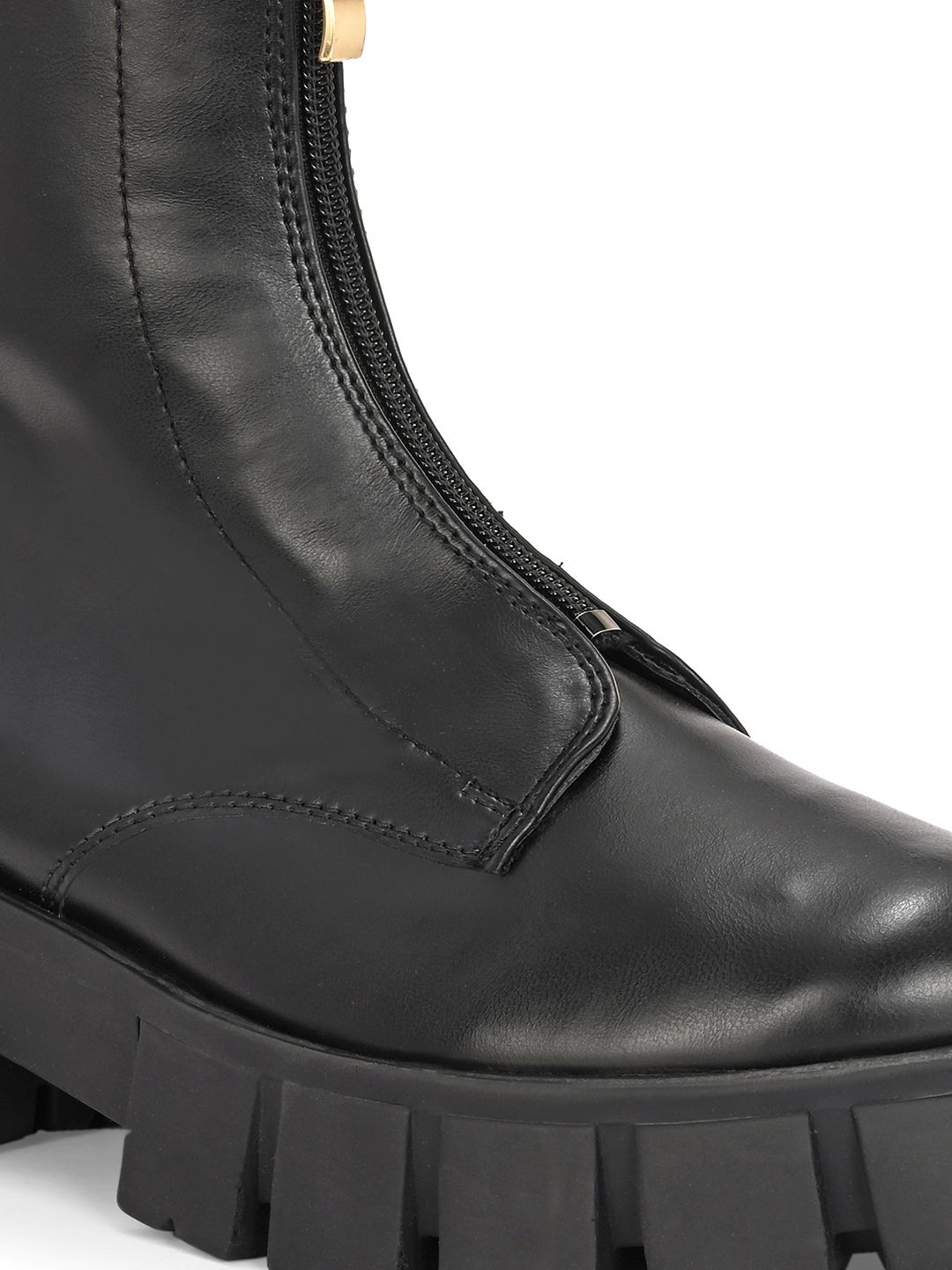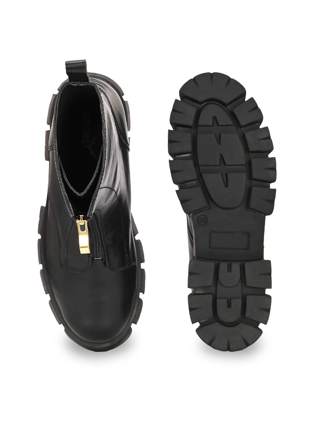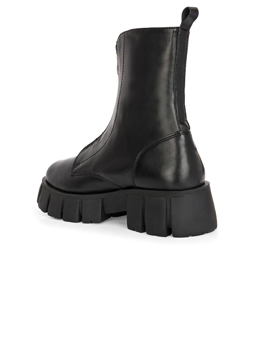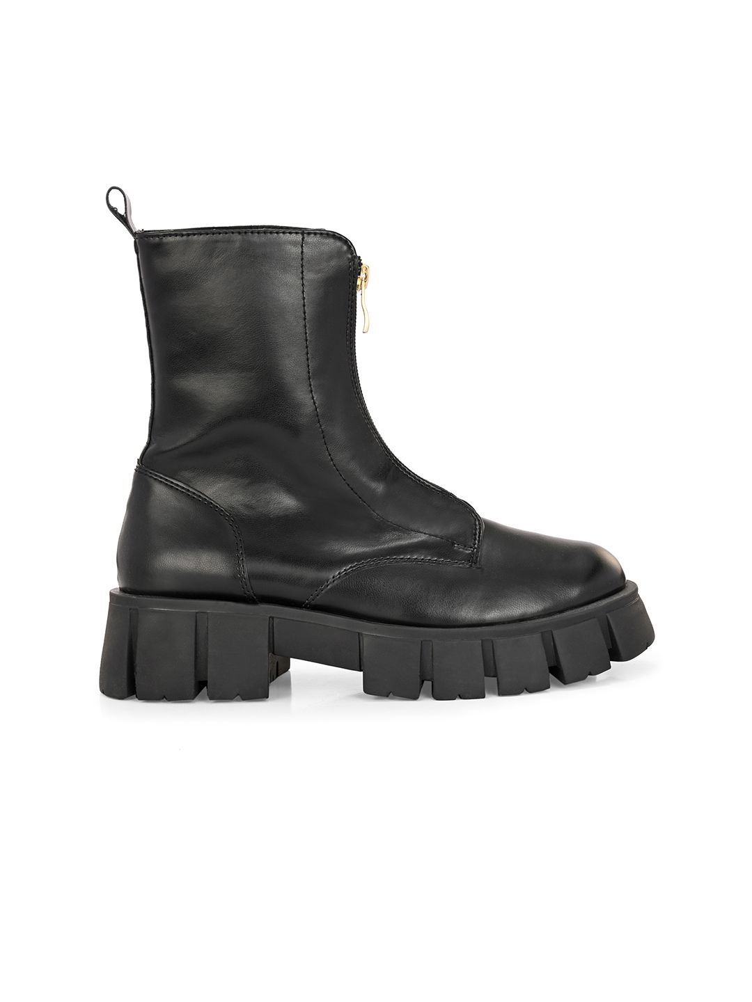 A pair of black chunky boots, has mid-top ankle and zipper fastening and back detailSynthetic solid upper materialCushioned footbedTextured and patterned rubber outsole, has a platform heeled