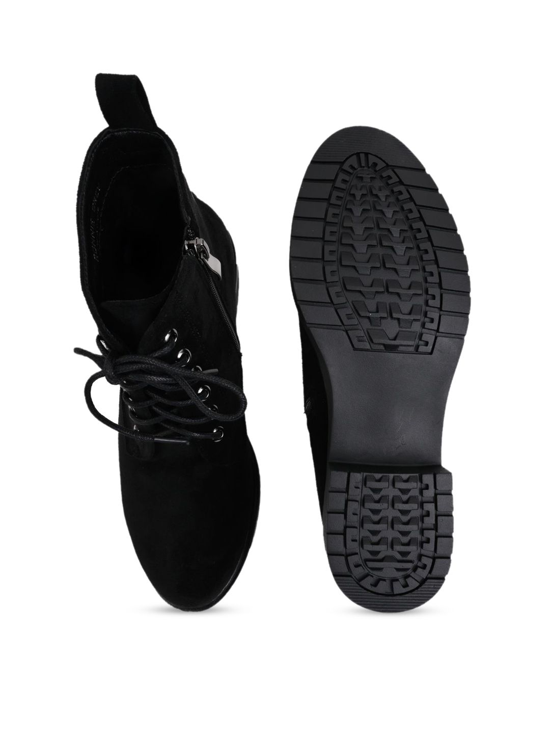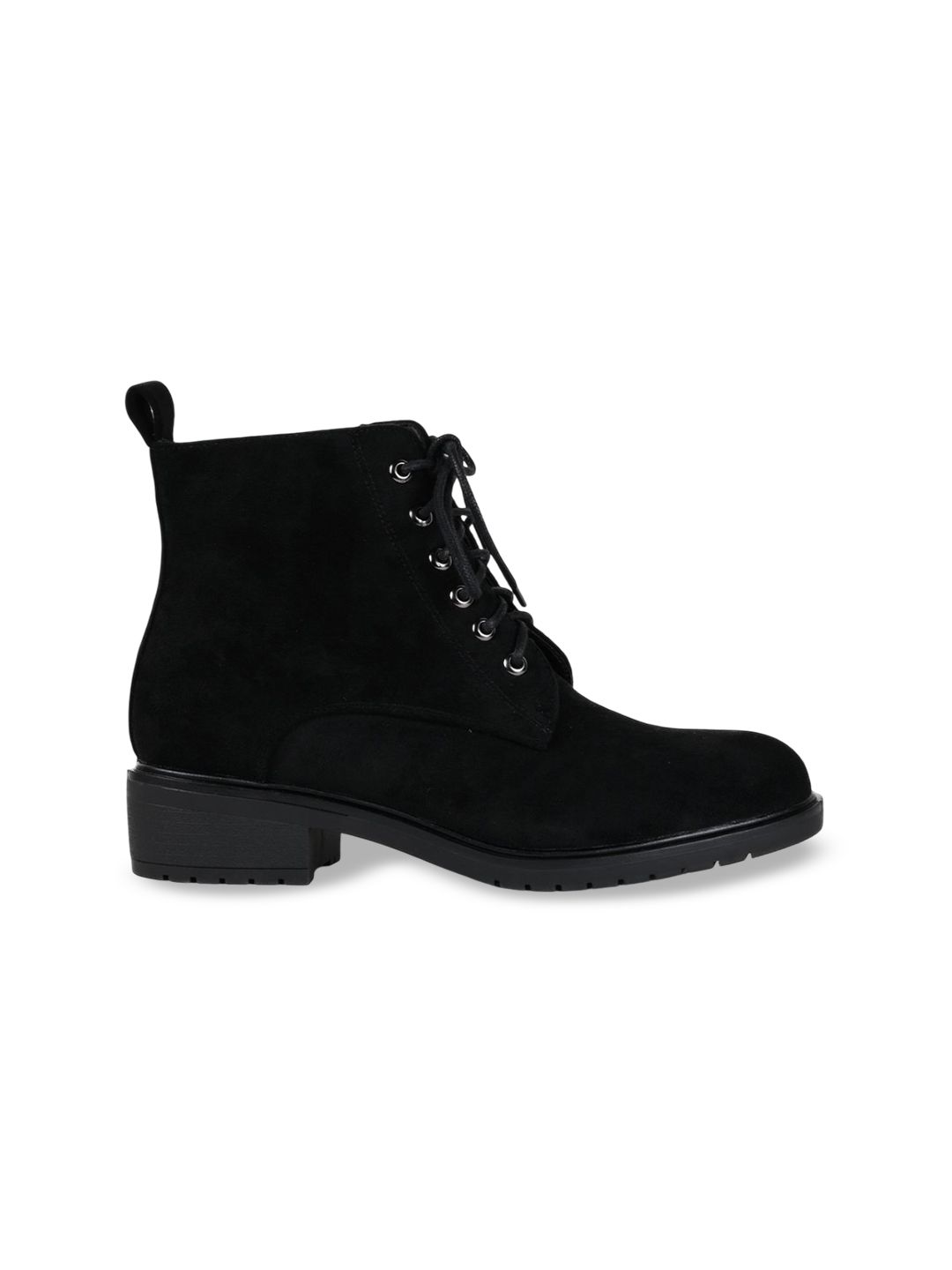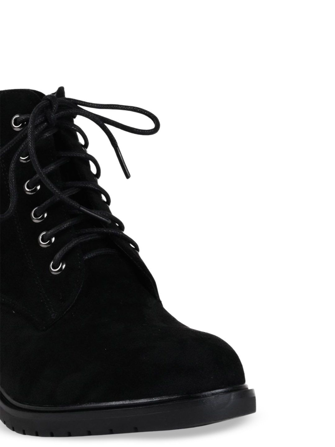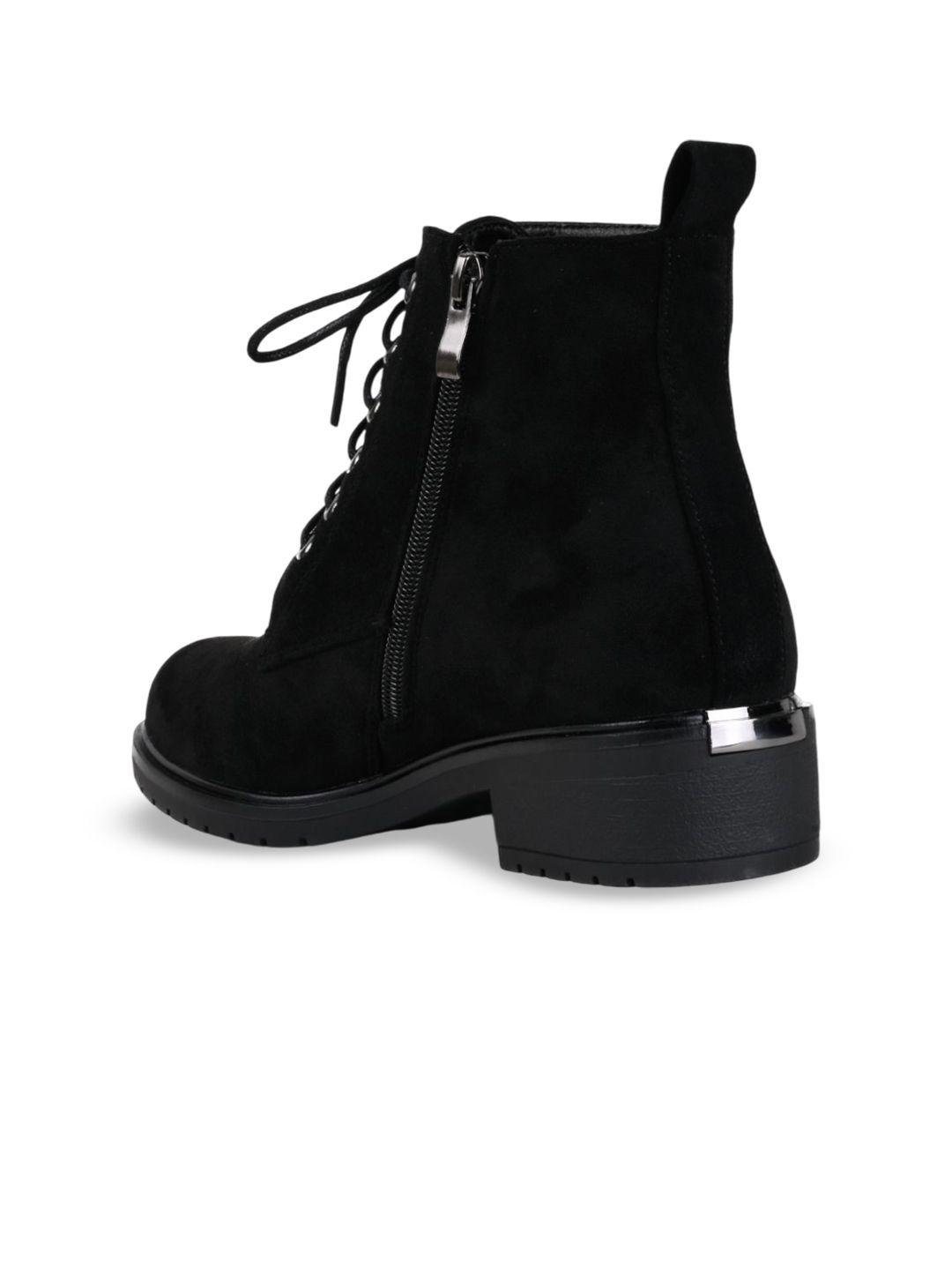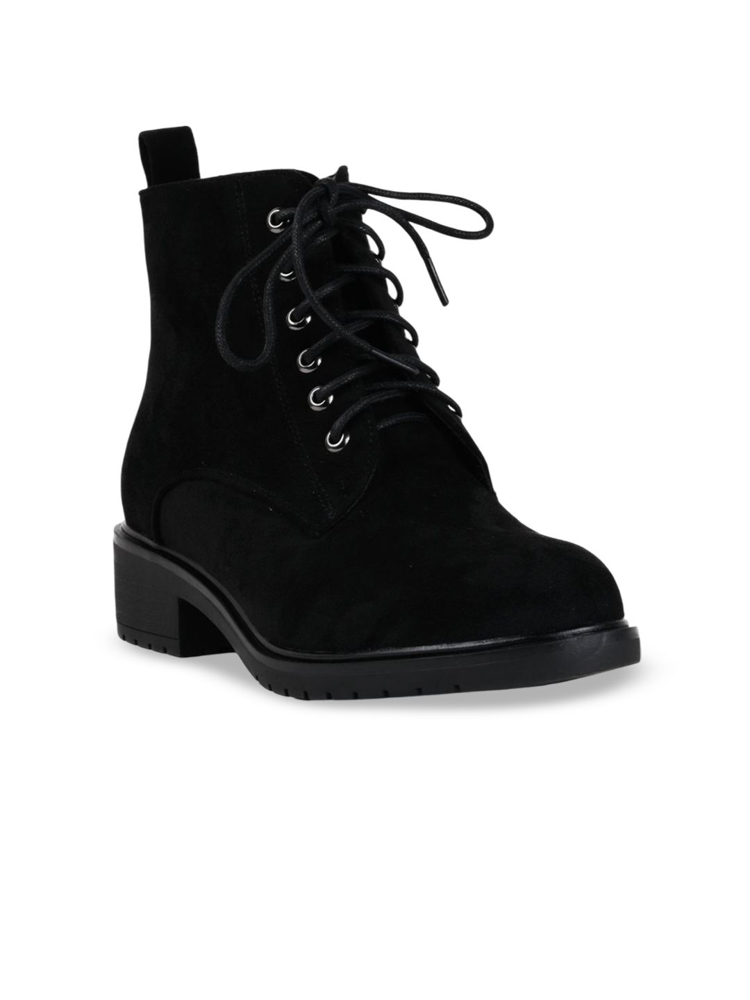 A pair of black regular boots, has mid-top ankle and lace-up fastening and back detailPU Solid upper materialCushioned footbedTextured and patterned TPR outsole, has a block-heeled