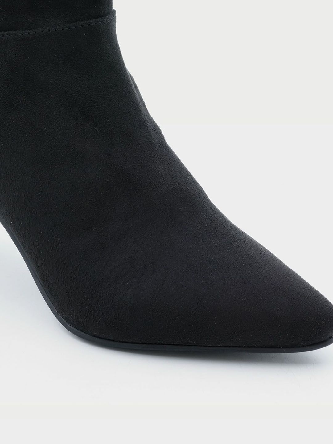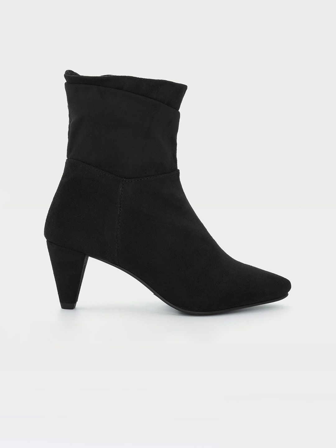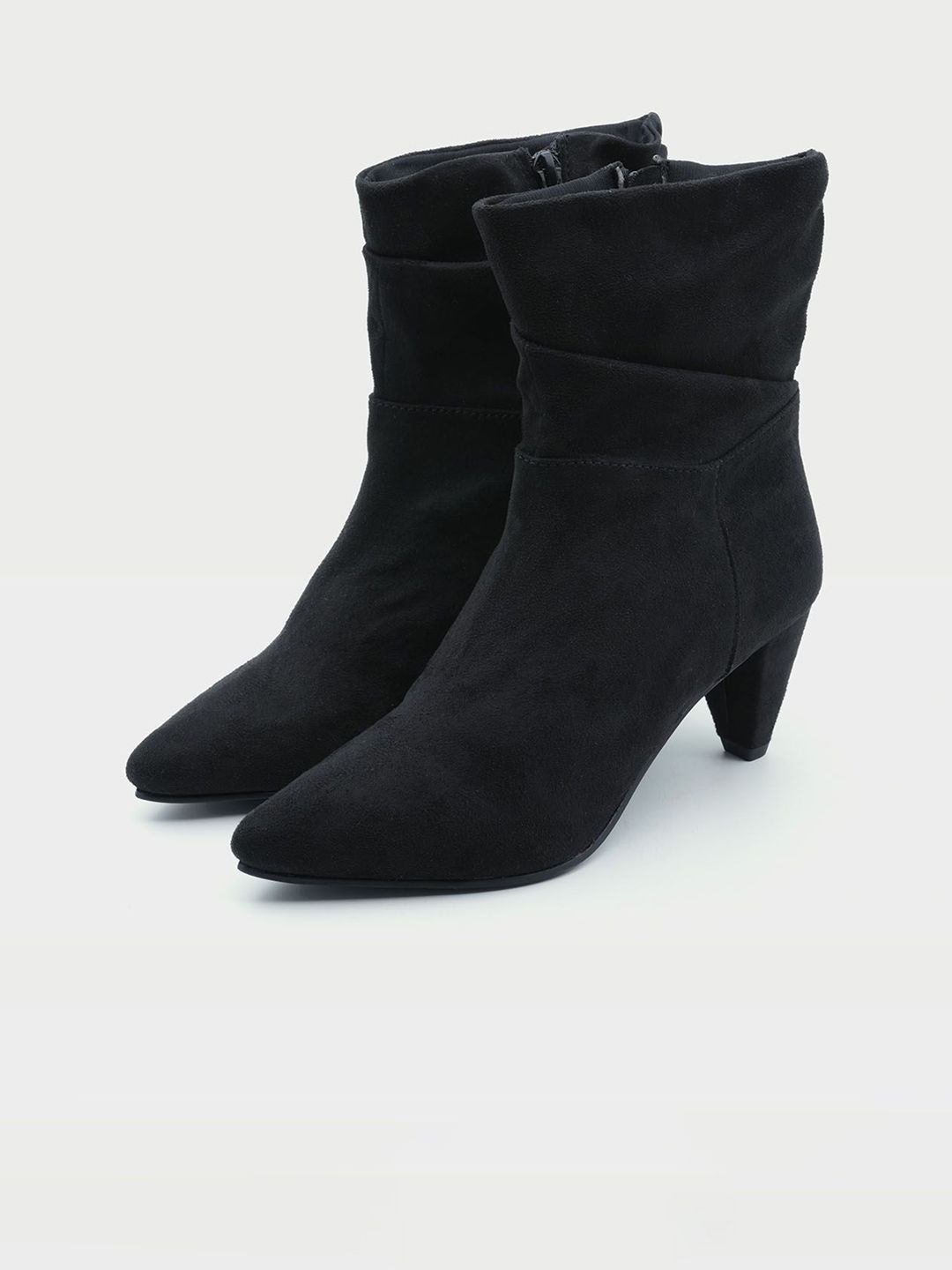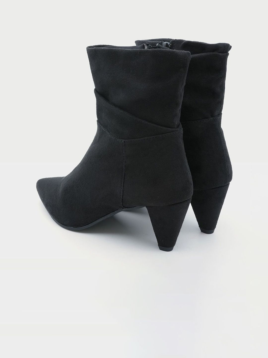 A pair of black slouchy boots, has mid-top ankle and zip fastening and back detailSuede Solid upper materialCushioned footbedTextured and patterned Tunit outsole, has a wedge-heeled