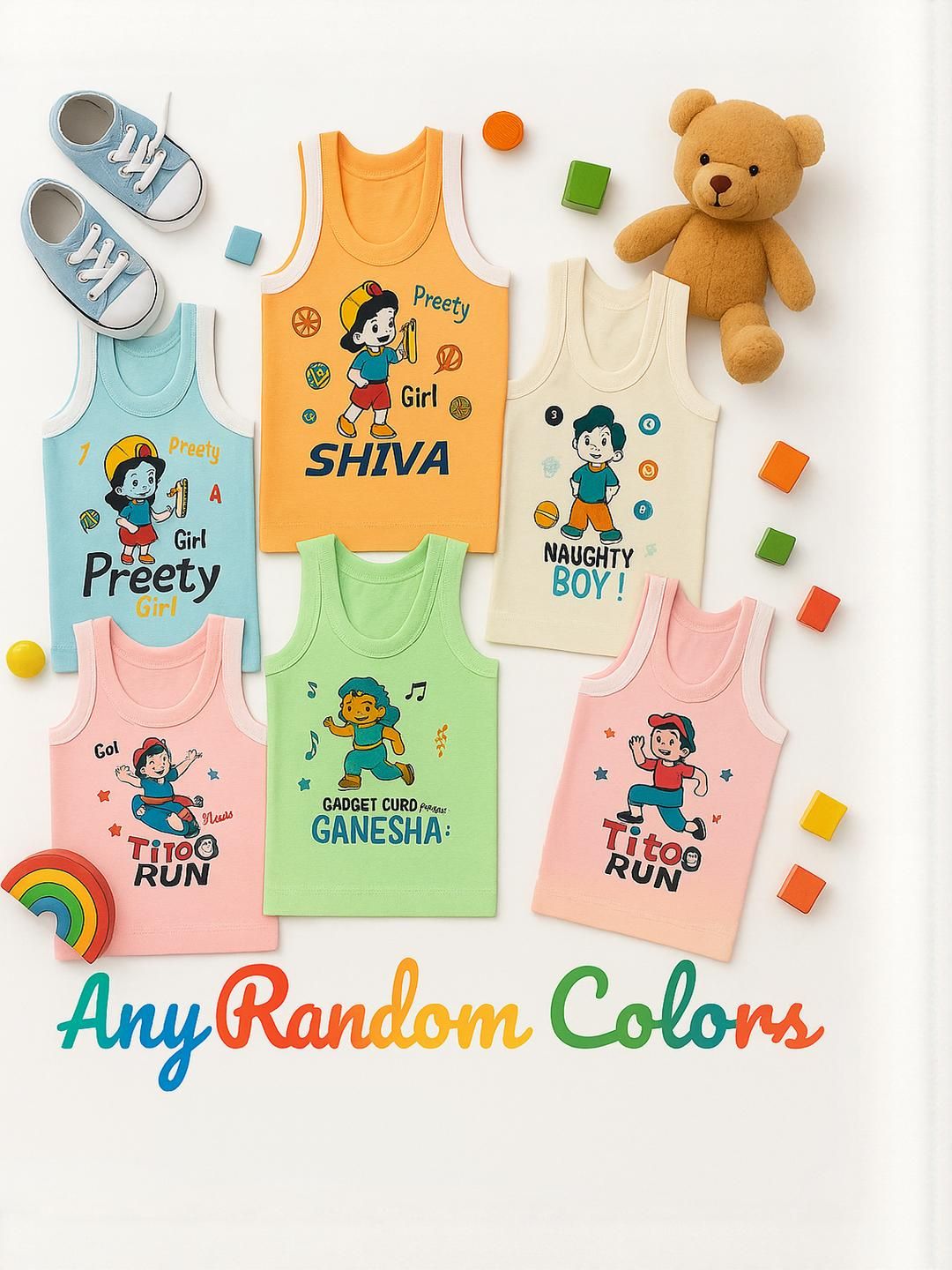 1.Pack Of 3 pcs New Born baby kids inner wear baniyan | unisex printed cotton baby sando | 100% Cotton vest for baby | daily wear infant vest | sleeveless vest for baby | toddlers vest cotton. 2.Sleeveless Vest for Baby & Toddlers | A versatile and stylish innerwear option| perfect as a banyan undershirt, or layering piece for casual wear| sleepwear | summer outfits.3.Unisex Printed Cotton Baby Sando | Made from 100% premium cotton | These lightweight and stretchable vests offer a gentle touch on delicate skin | keeping babies cool and sweat-free.4.100% Cotton Vest for Baby | Crafted with high-quality | skin-friendly cotton | This daily wear infant vest is soft | durable | Retains color and print even after multiple washes.5.Age Limit:- It is for all ages from newboarn baby to Kids upto 9 Years sizes are like;- 0-3 Month, 3-6 Months, 6-12 Months, 12-24 Months, 2-3 years, 3-4 years , 4-5 Years , 5-6 Years , 6-7 Years.6.Perfect Gift Option:- Not sure what to buy a baby, baby shower, or birthday gift? This cute and functional Shamriz Baby Tank Top Set blends style, comfort, and affordability in one delightful package sleeveless vests is excellent for baby showers or as a welcome present. Holidays, birthdays, and other special occasions These soft pyjamas make great gifts for infants on Diwali, Christmas, Eid, and Rakhi for everyday wear, playing, or going away