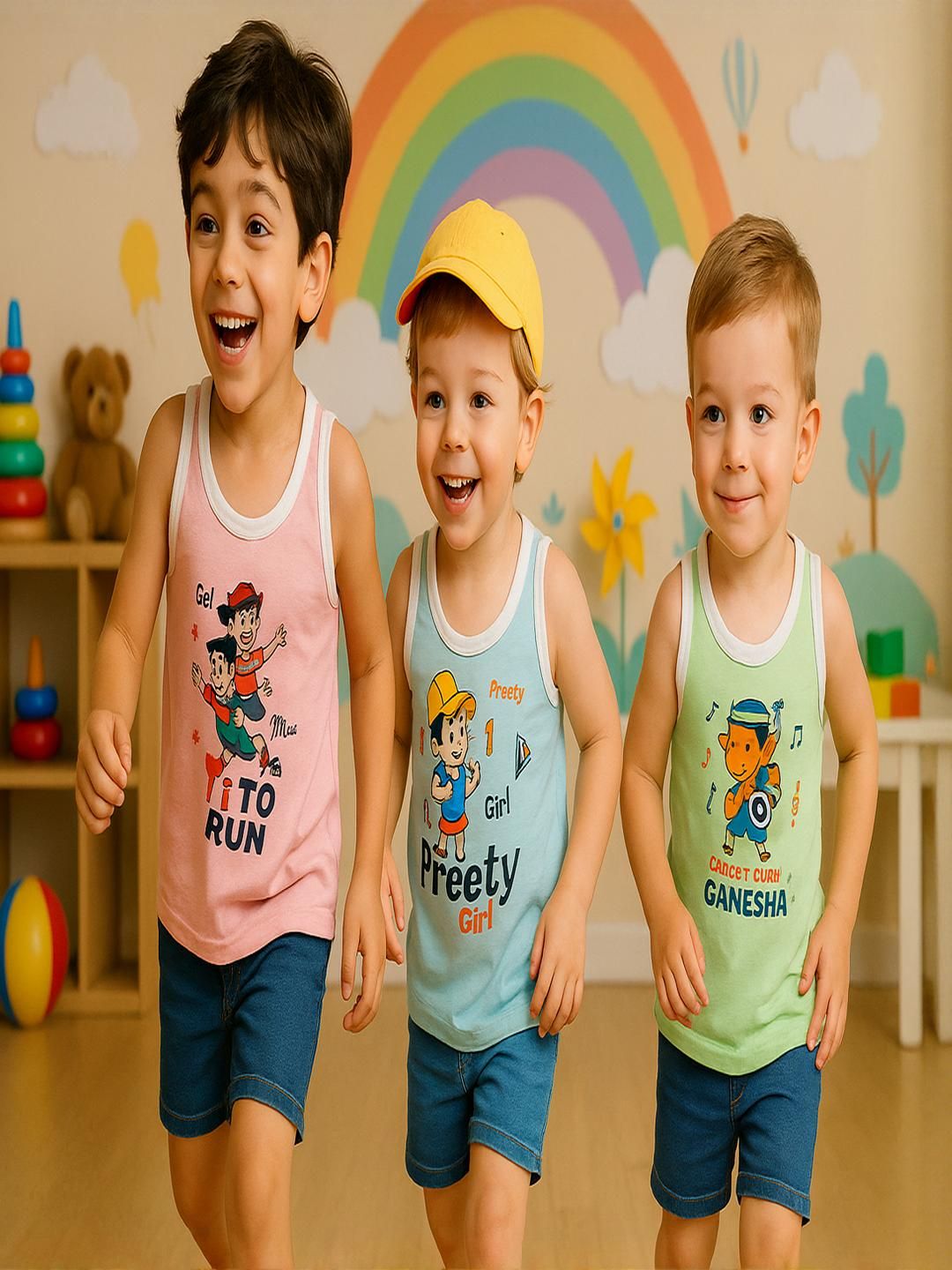 1.Pack Of 3 pcs New Born baby kids inner wear baniyan | unisex printed cotton baby sando | 100% Cotton vest for baby | daily wear infant vest | sleeveless vest for baby | toddlers vest cotton. 2.Sleeveless Vest for Baby & Toddlers | A versatile and stylish innerwear option| perfect as a banyan undershirt, or layering piece for casual wear| sleepwear | summer outfits.3.Unisex Printed Cotton Baby Sando | Made from 100% premium cotton | These lightweight and stretchable vests offer a gentle touch on delicate skin | keeping babies cool and sweat-free.4.100% Cotton Vest for Baby | Crafted with high-quality | skin-friendly cotton | This daily wear infant vest is soft | durable | Retains color and print even after multiple washes.5.Age Limit:- It is for all ages from newboarn baby to Kids upto 9 Years sizes are like;- 0-3 Month, 3-6 Months, 6-12 Months, 12-24 Months, 2-3 years, 3-4 years , 4-5 Years , 5-6 Years , 6-7 Years.6.Perfect Gift Option:- Not sure what to buy a baby, baby shower, or birthday gift? This cute and functional Shamriz Baby Tank Top Set blends style, comfort, and affordability in one delightful package sleeveless vests is excellent for baby showers or as a welcome present. Holidays, birthdays, and other special occasions These soft pyjamas make great gifts for infants on Diwali, Christmas, Eid, and Rakhi for everyday wear, playing, or going away