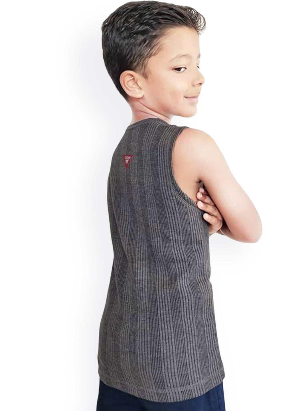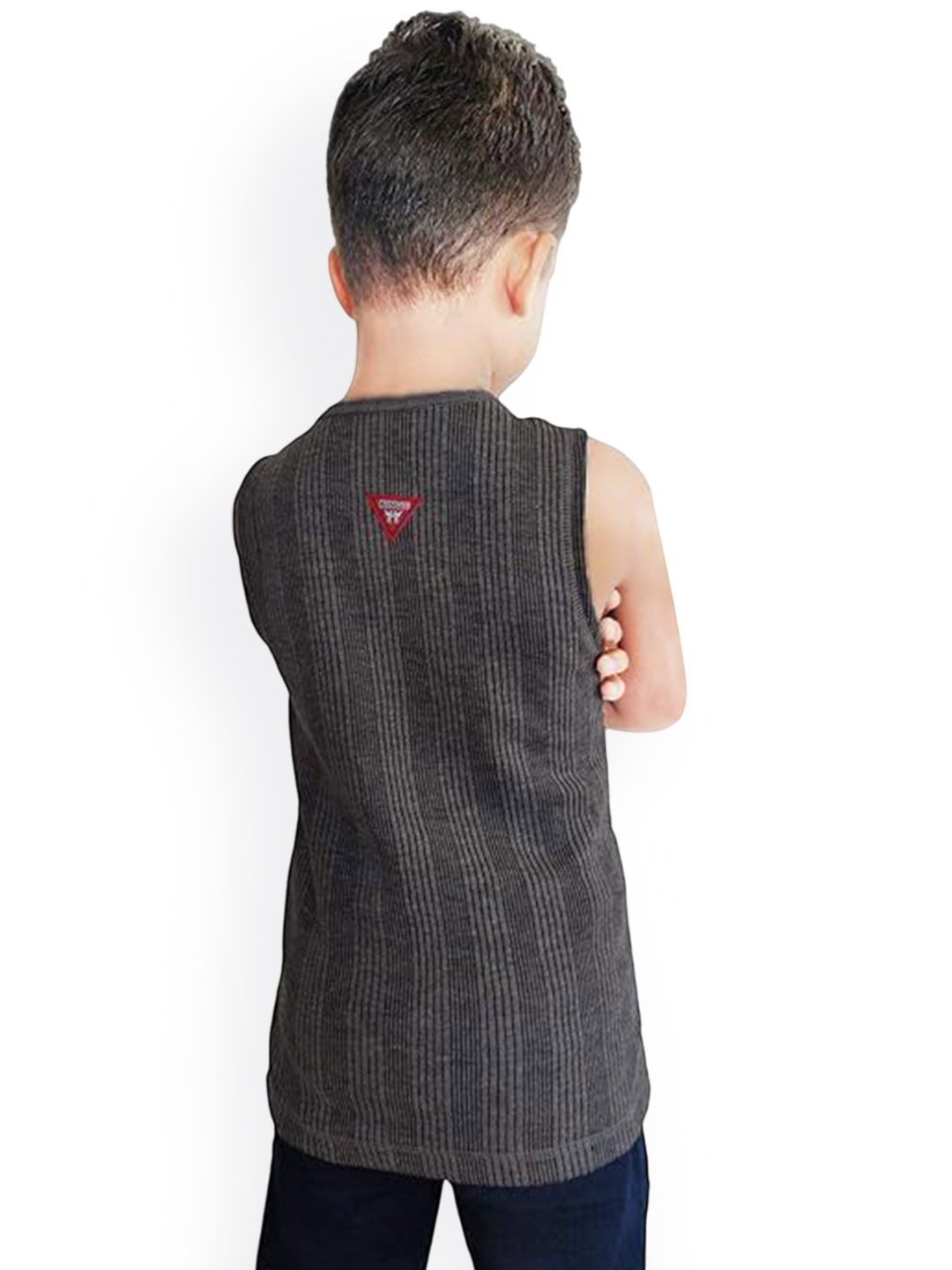 Grey ribbed thermal top, has a round neck, and has sleeveless with straight hem