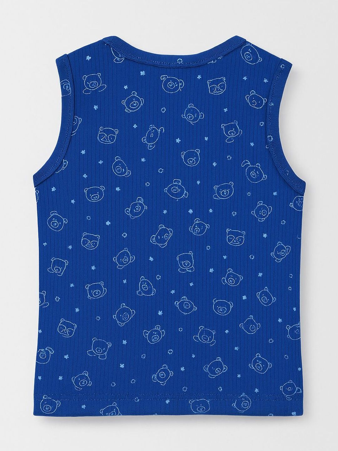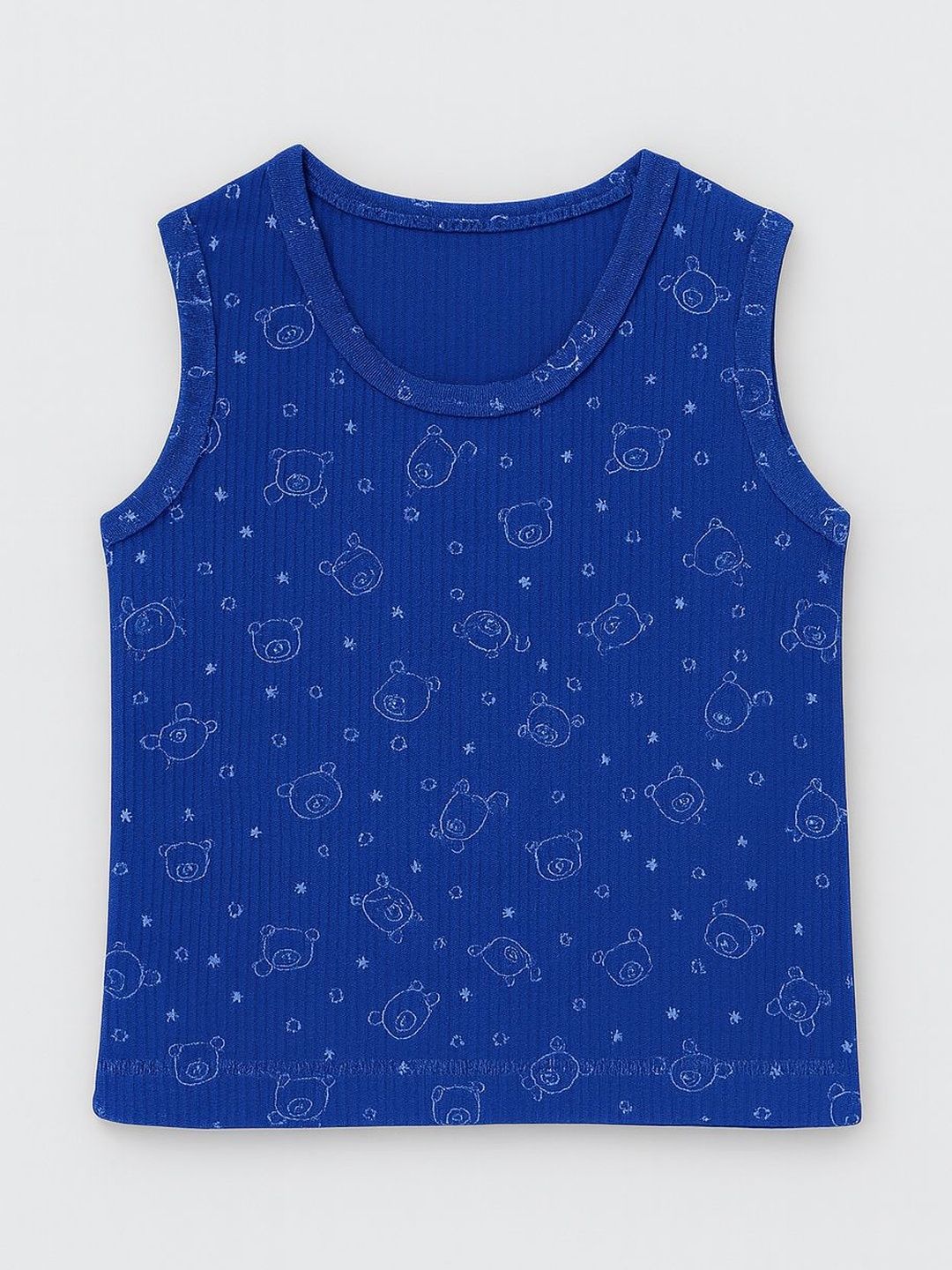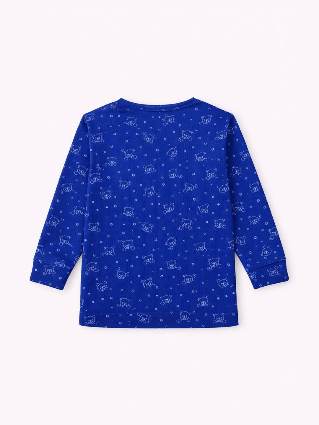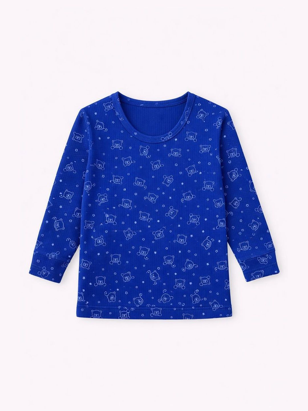 Blue printed thermal sets Blue printed thermal top, has a round neck and long sleevesBlue printed regular-fit mid-rise thermal , has an elasticated waistband with slip-on closure, cuffed hemsComes with blue printed innerwear vest, has round neck sleeveless