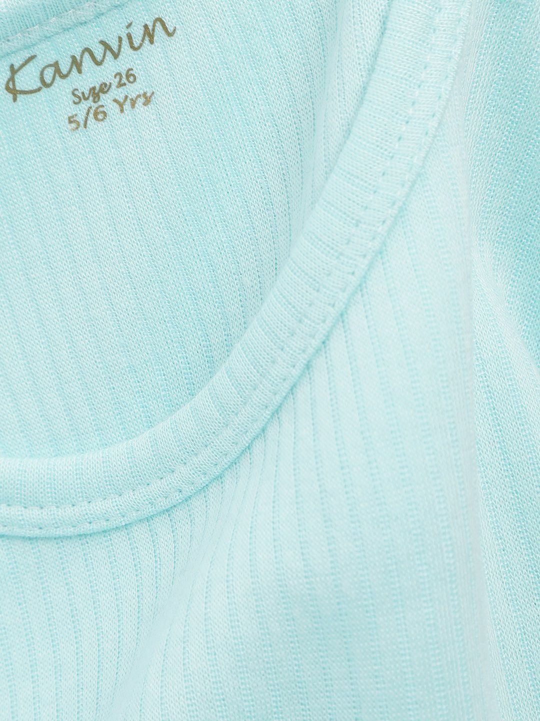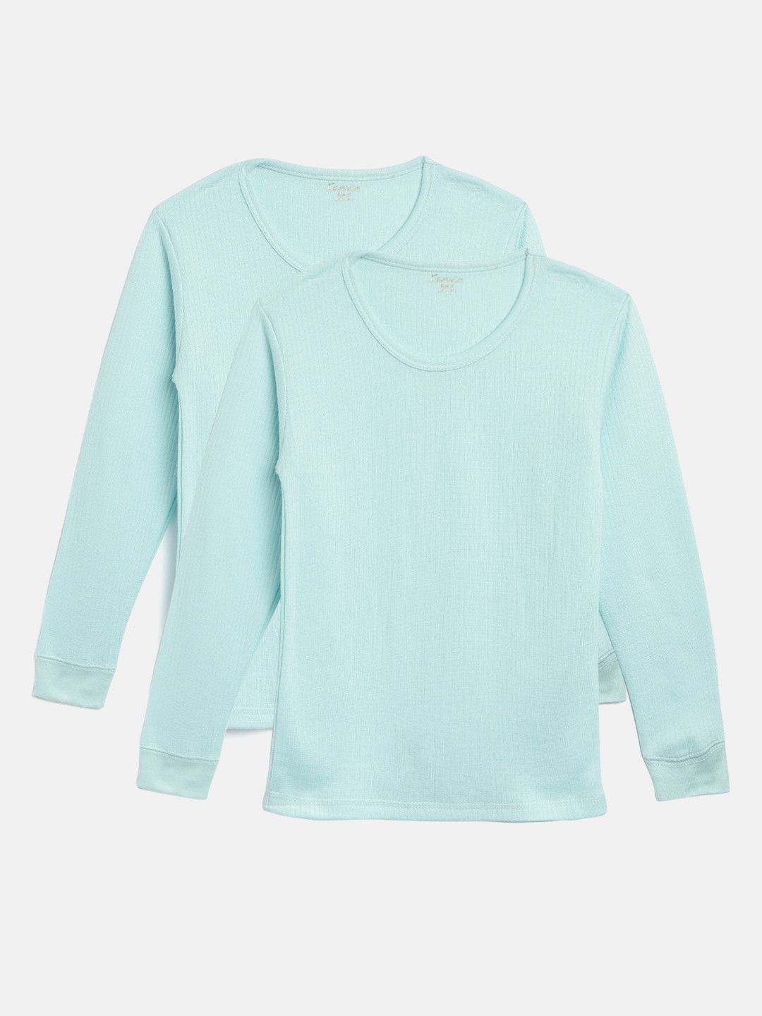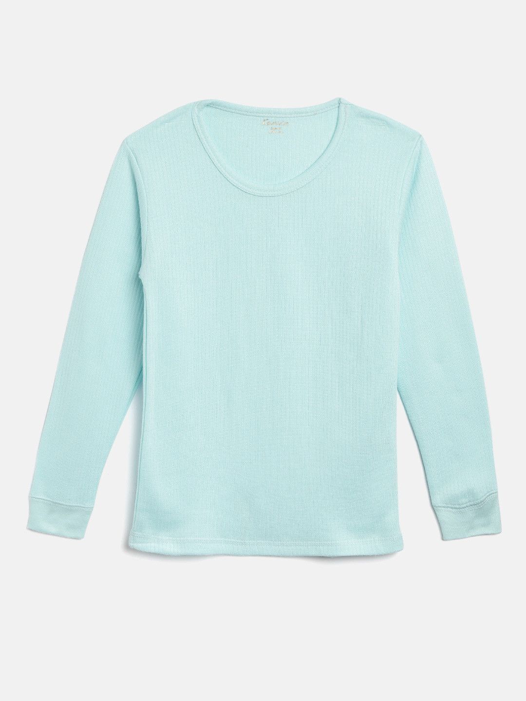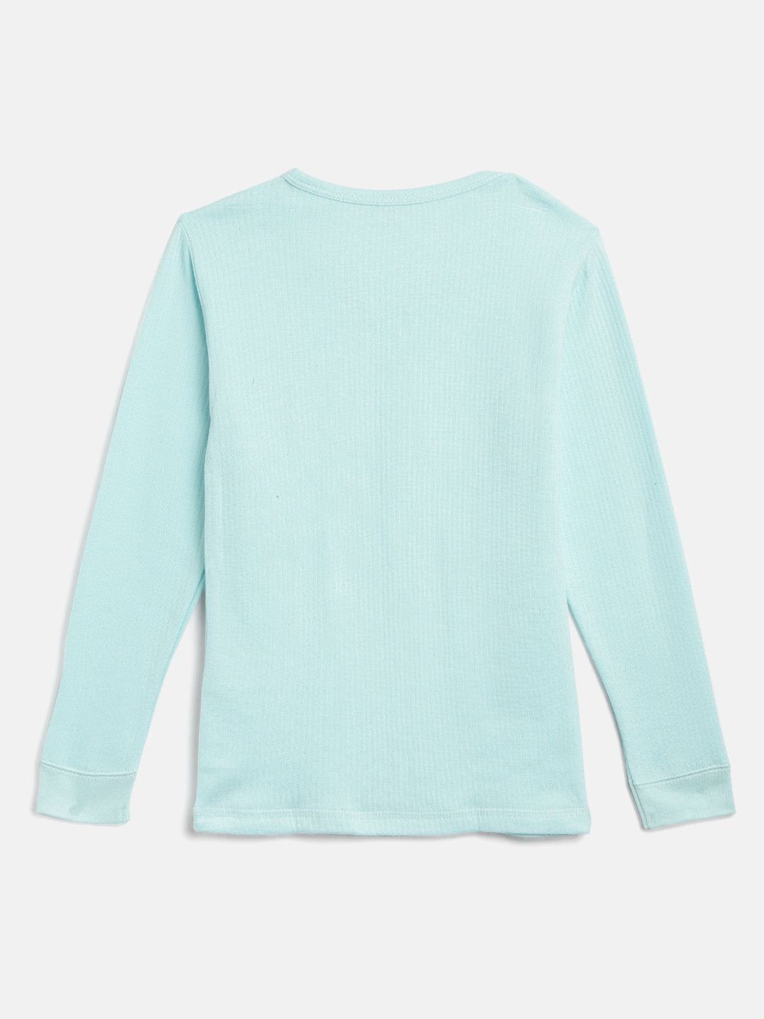 Turquoise Blue ribbed thermal top, has a round neck, and has long sleevels with straight hem