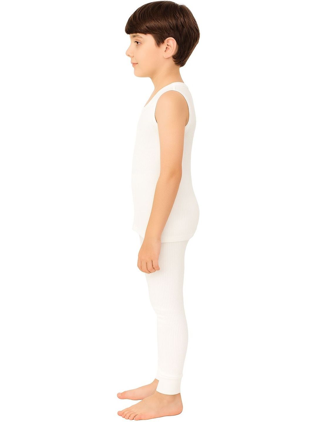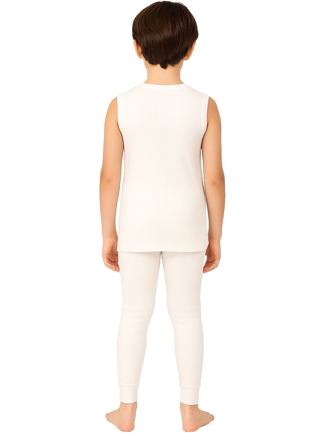 This thermal set consists of a top and a pair of thermal bottomsOff white ribbed thermal top has a round neck and slip-on closure, sleeveless, and cuffed hemOff white ribbed mid-rise thermal bottoms, has an elasticated waistband and cuffed hem