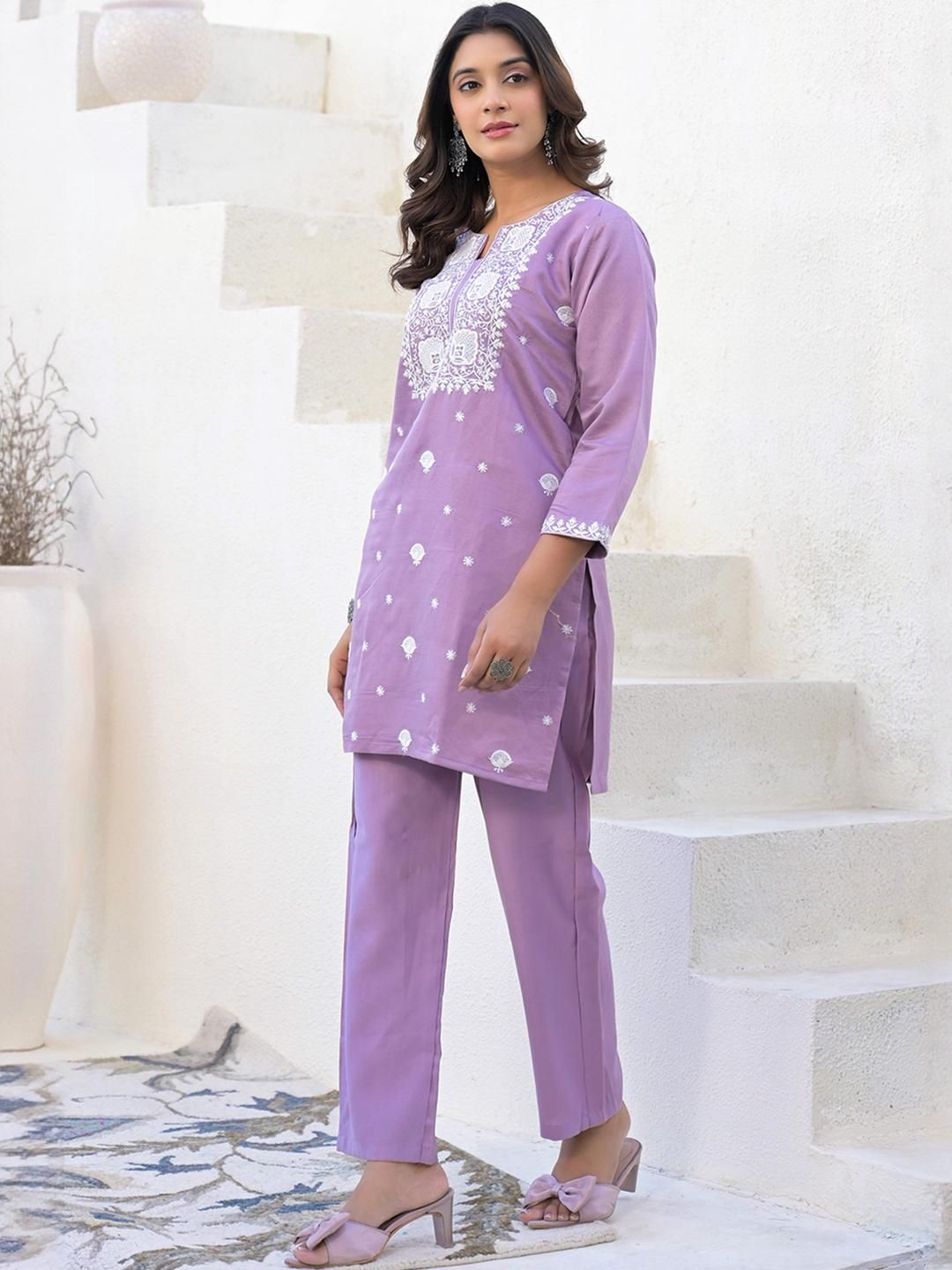 This light purple Co-Ord set is beautifully enhanced with thread embroidery, giving it a classy and elegant appearance. Made from viscose gadwal silk fabric, it comes with a matching viscose gadwal silk bottom for a coordinated look. Ideal for festive celebrations and party wear, this set offers a graceful and stylish appeal.