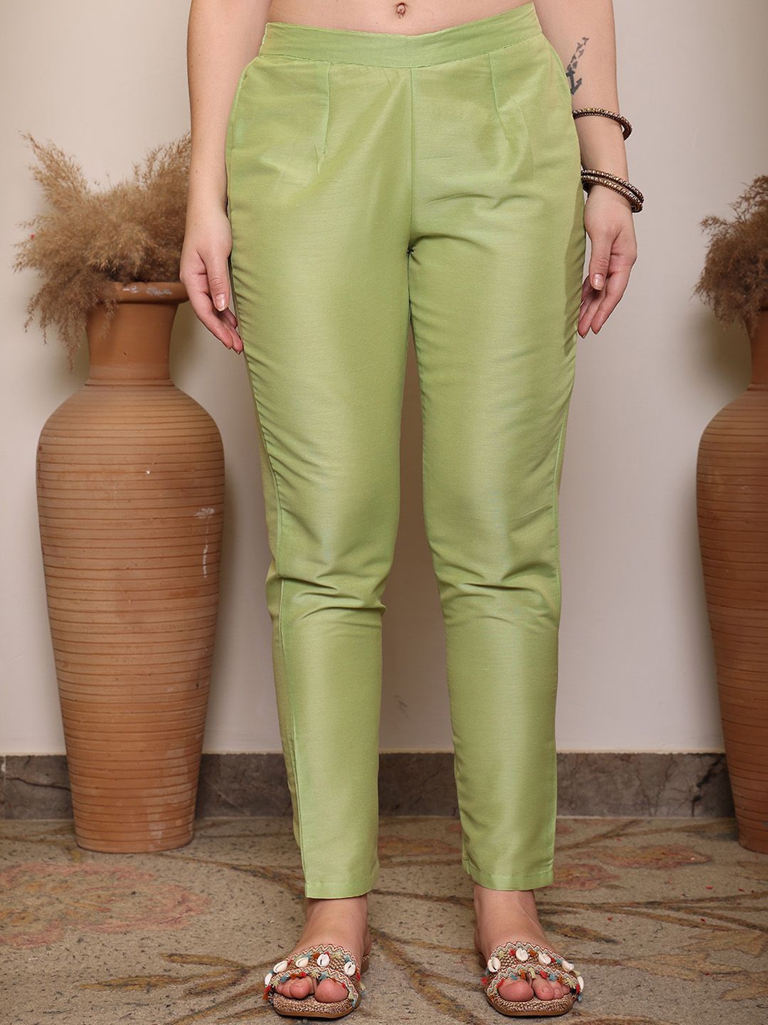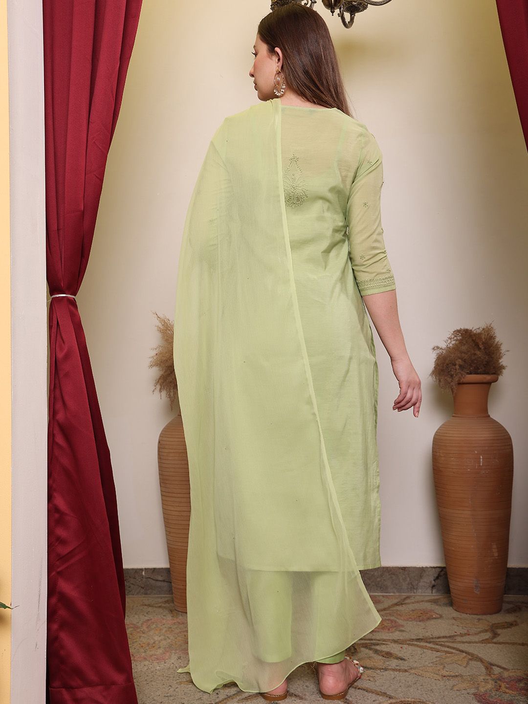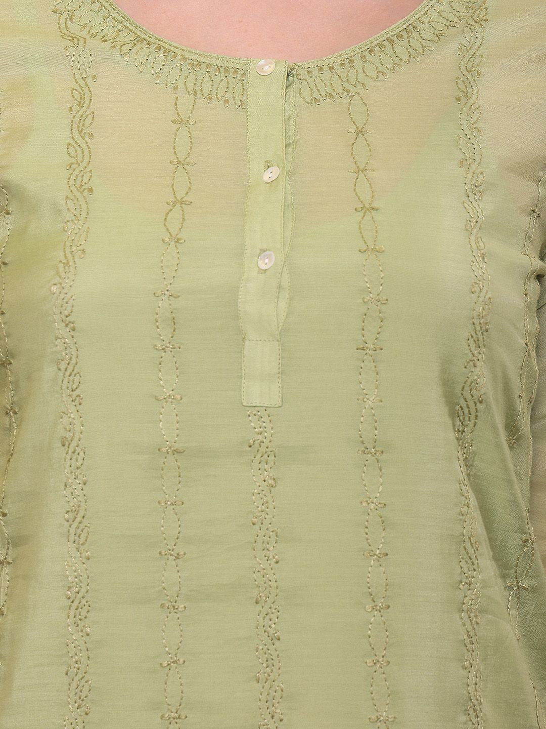 This kurta set consists of kurta, trousers and a dupattaKurta DesignGreen KurtaEmbroidered detailsRound neckThree-quartered regular sleevesStraight shapedCalf-length with straight hemMachine weave regular poly chanderiTrouser Design:Green solid TrouserSlip-On ClosureDupatta Design:Green DupattaSolid