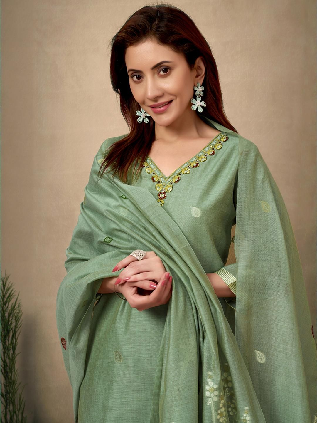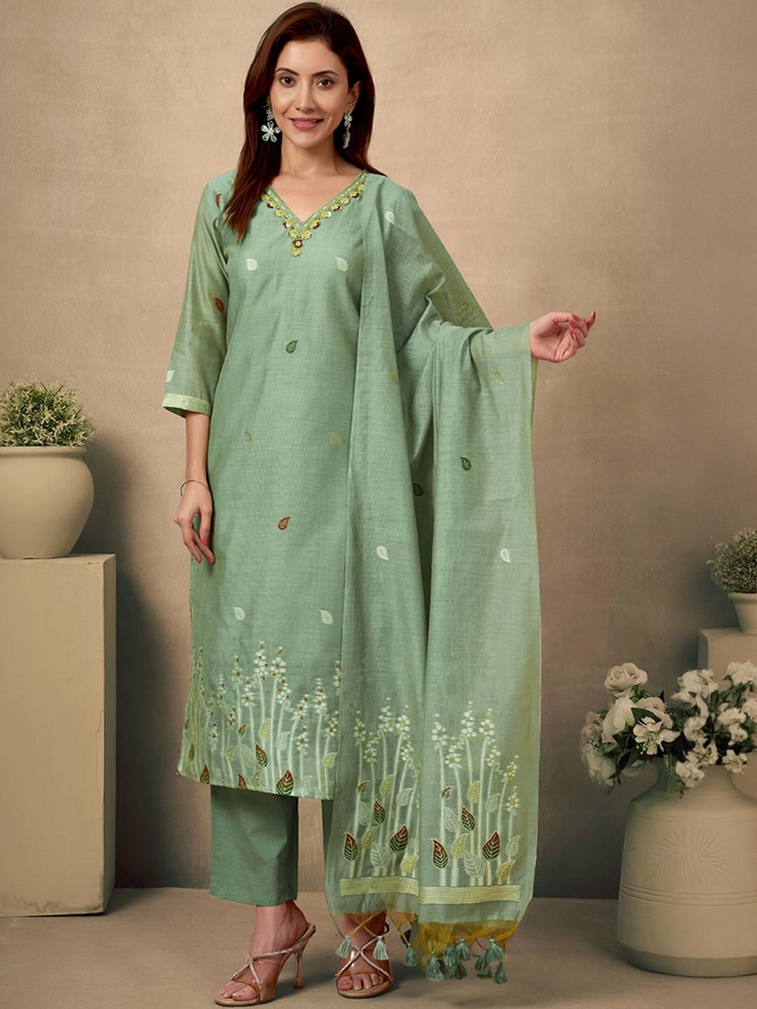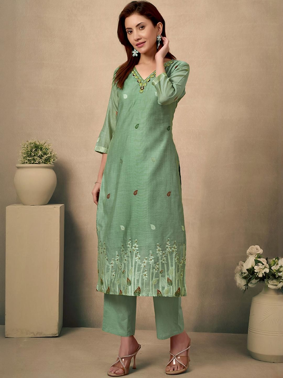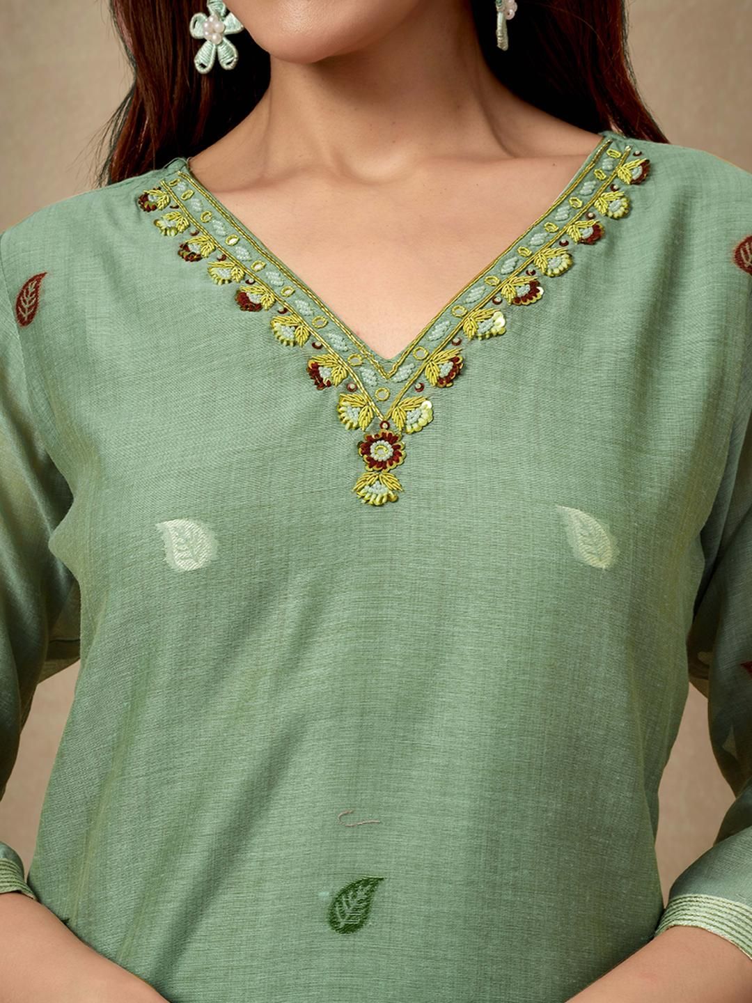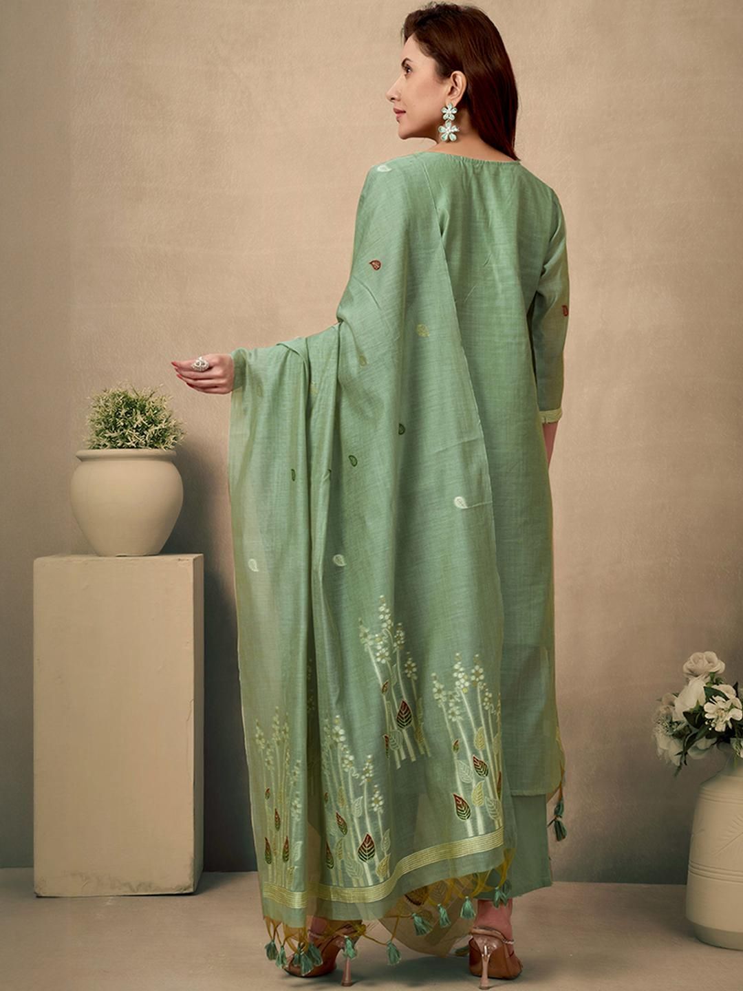 Light green Chanderi salwar suit with beads and stone handwork and Jamdani weaving, paired with a Santoon bottom and Chanderi dupatta for a refined festive look.