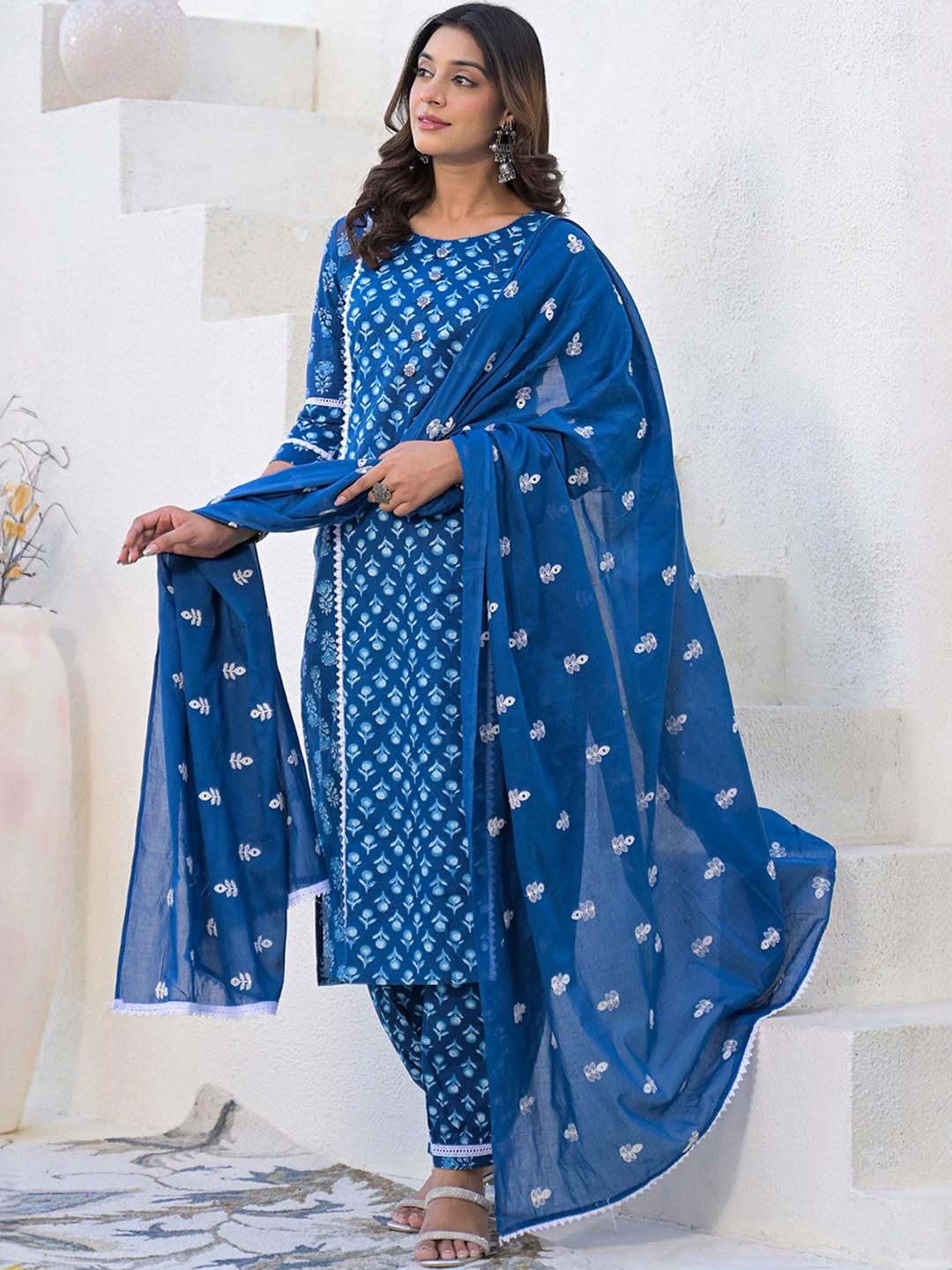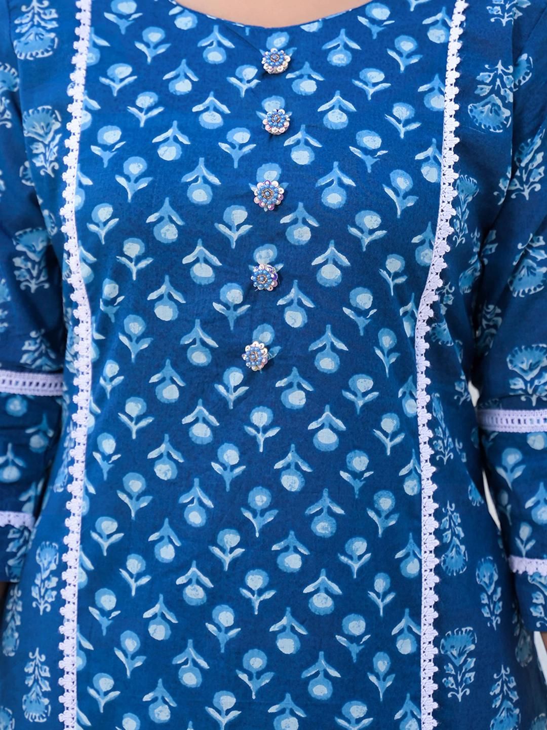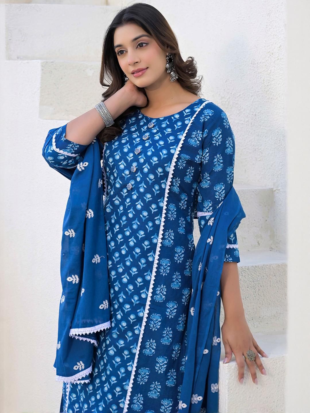 This elegant navy blue suit features a delicate floral print and intricate lacework, crafted from pure cotton with a matching bottom and breathable dupatta, perfect for festive occasions and special events.
