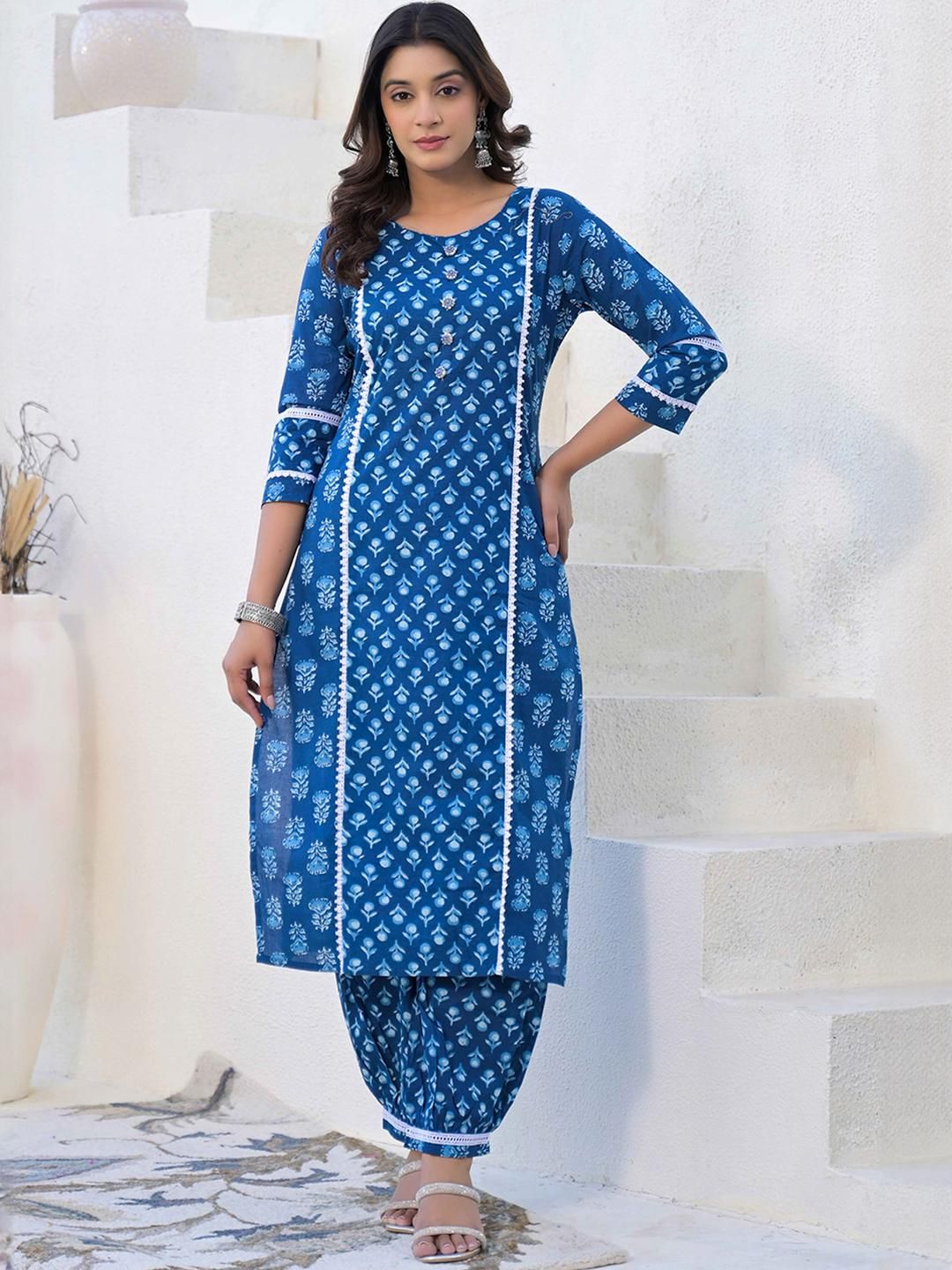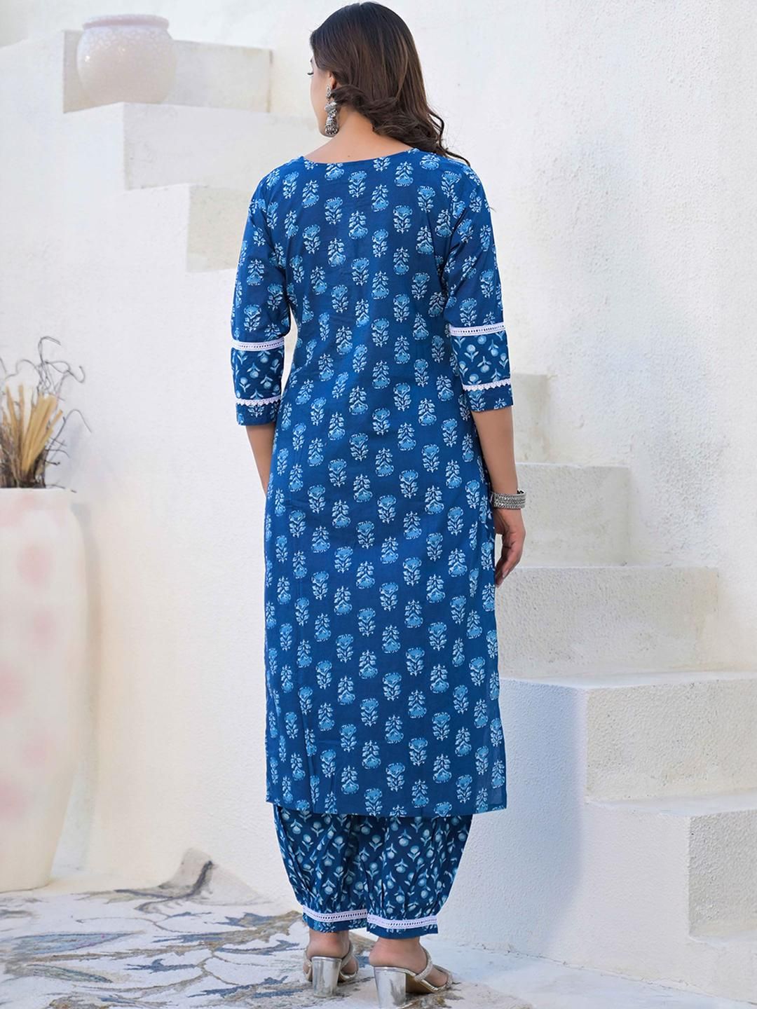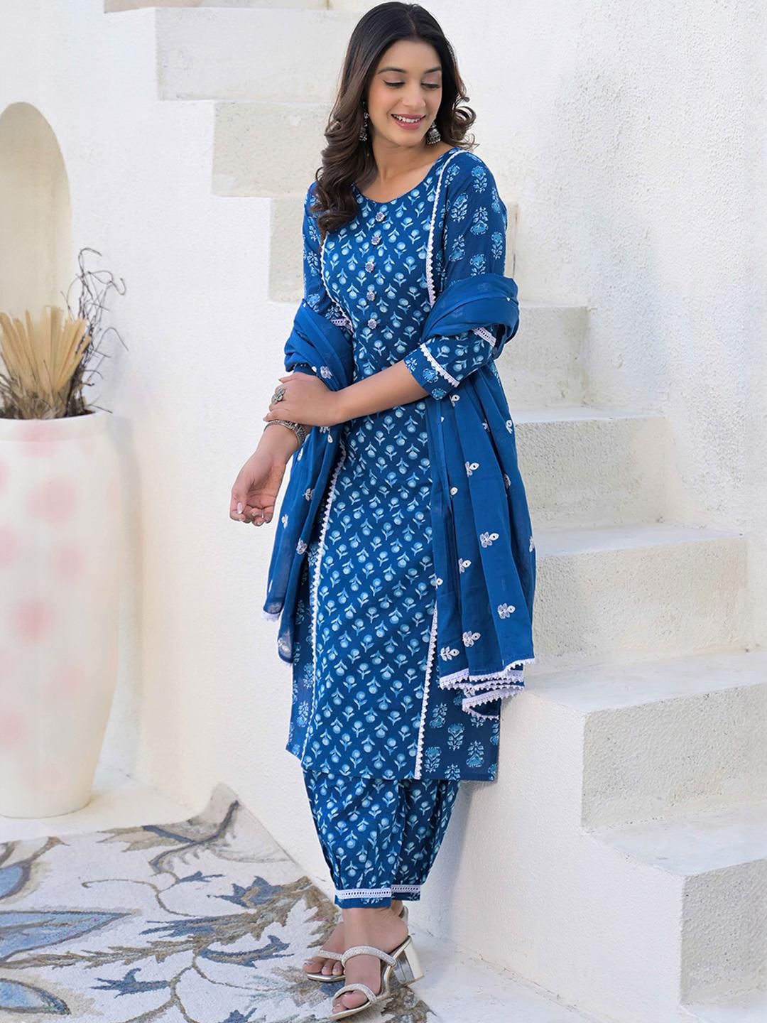 This elegant navy blue suit features a delicate floral print and intricate lacework, crafted from pure cotton with a matching bottom and breathable dupatta, perfect for festive occasions and special events.