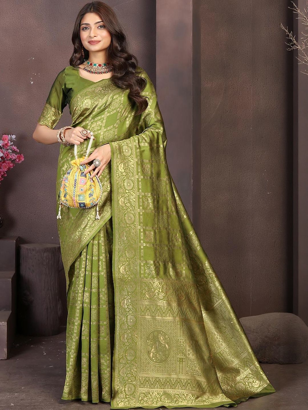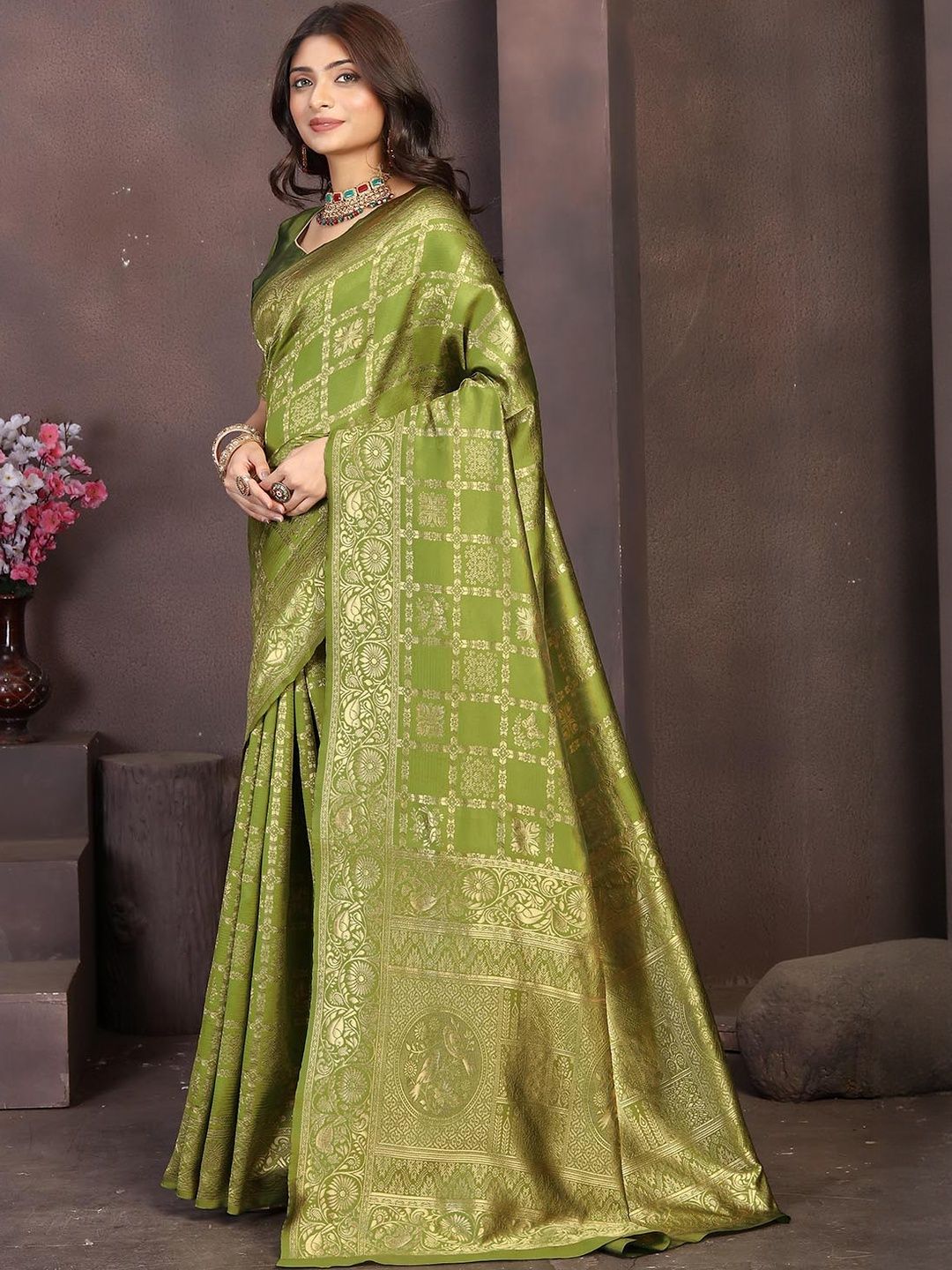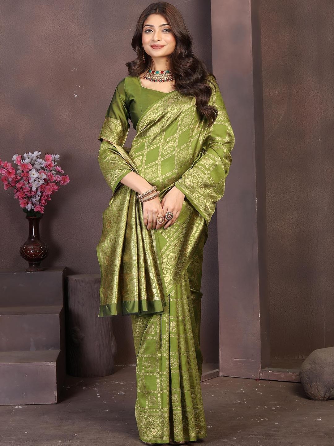 Elevate your festive look with this Mahendi and gold woven Banarasi saree. Pair it with statement kundan jewellery, a sleek clutch, and embellished heels for weddings, receptions, or festive occasions.