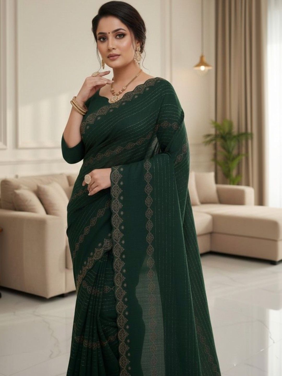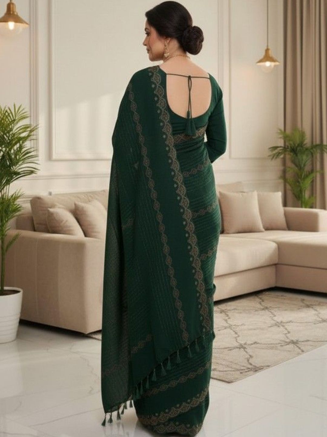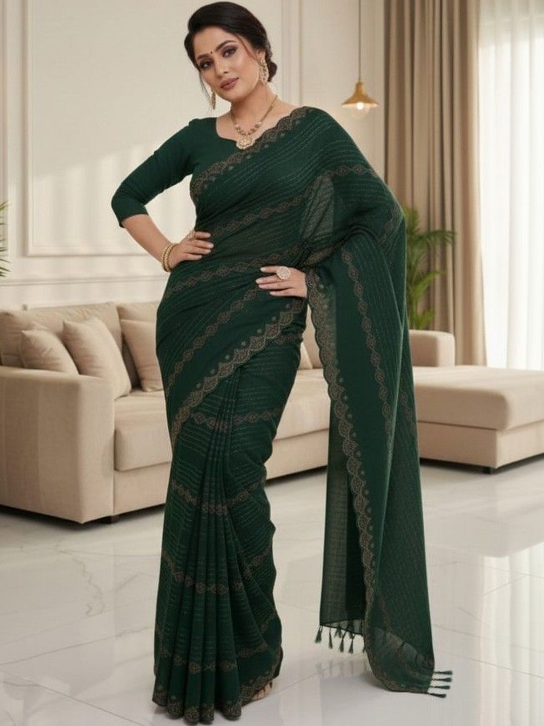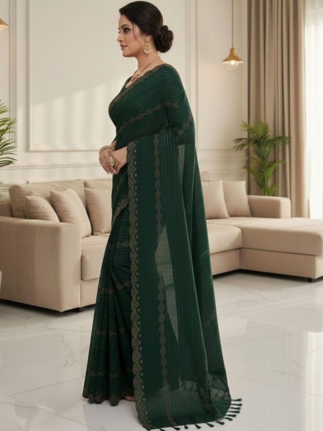 Pair your saree with statement earrings or a delicate necklace to highlight the border or embroidery. Add matching bangles or a stylish bracelet and carry a chic clutch for a complete ethnic look. Style your hair in a bun, braid, or loose waves, and finish with heels or traditional sandals. Keep your makeup subtle with kajal and a matching lipstick.