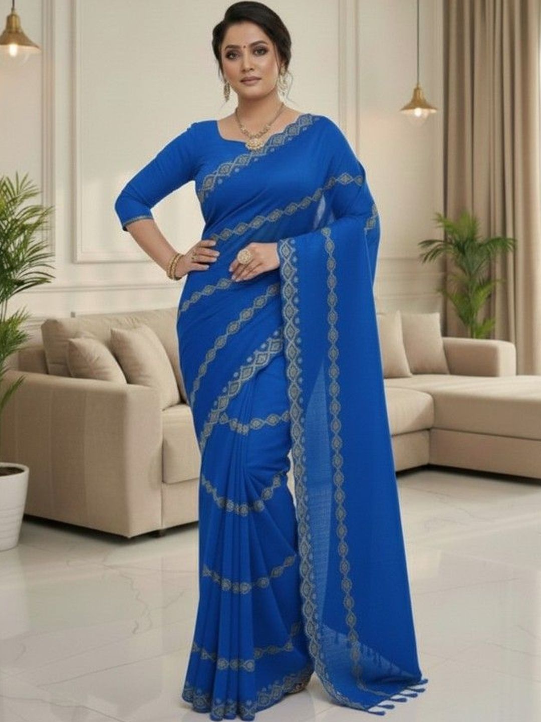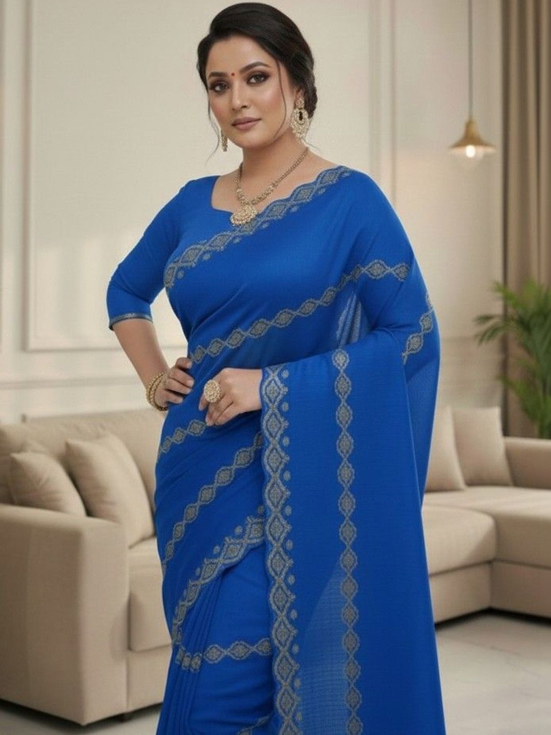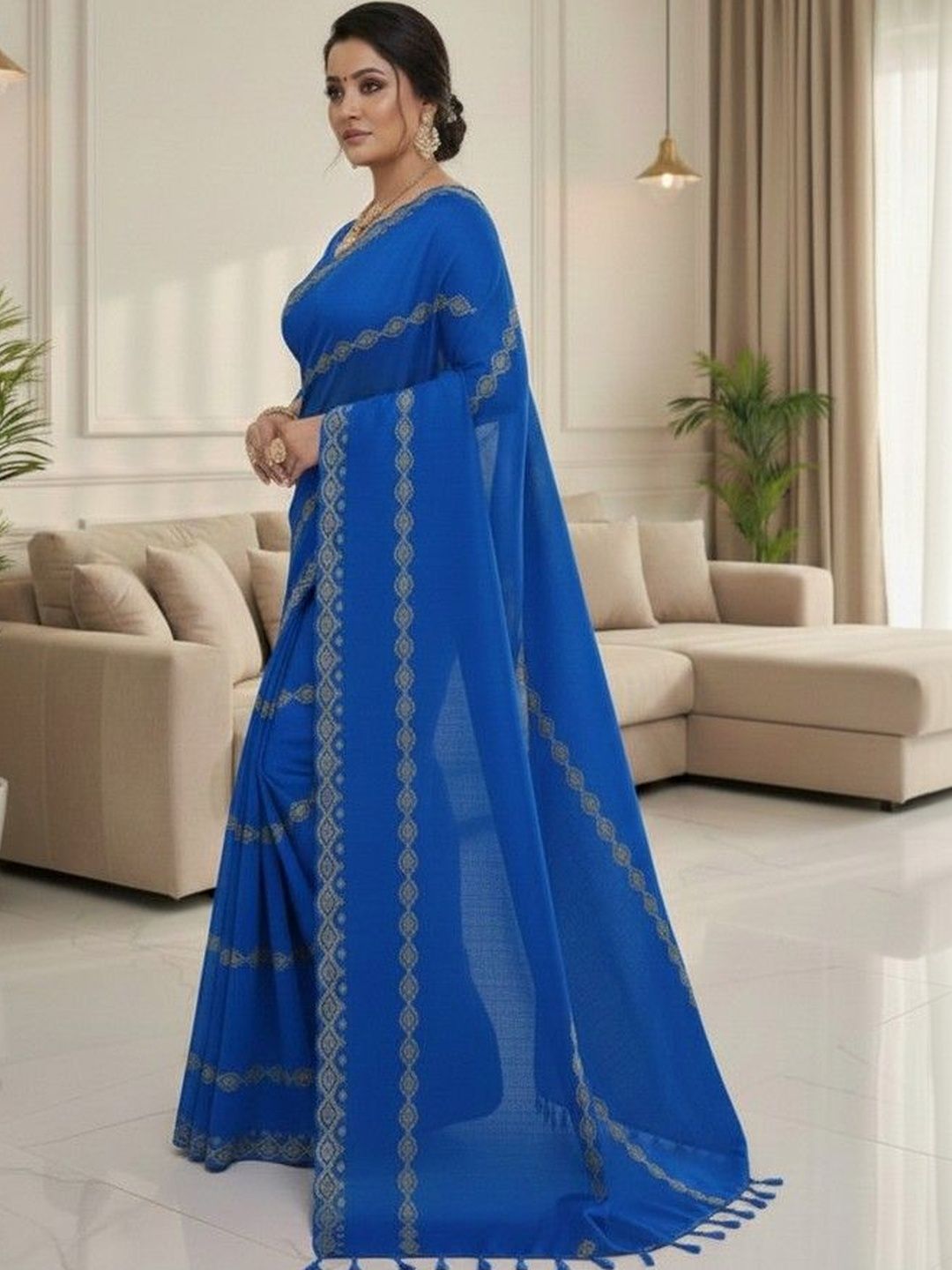Pair your saree with statement earrings or a delicate necklace to highlight the border or embroidery. Add matching bangles or a stylish bracelet and carry a chic clutch for a complete ethnic look. Style your hair in a bun, braid, or loose waves, and finish with heels or traditional sandals. Keep your makeup subtle with kajal and a matching lipstick.