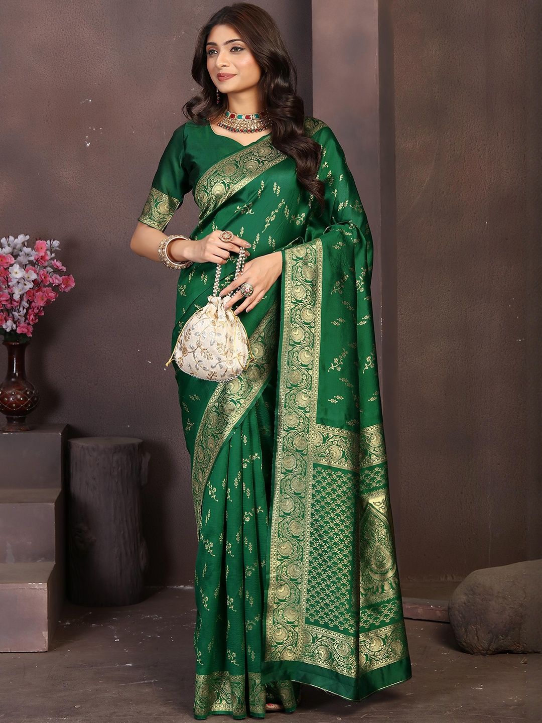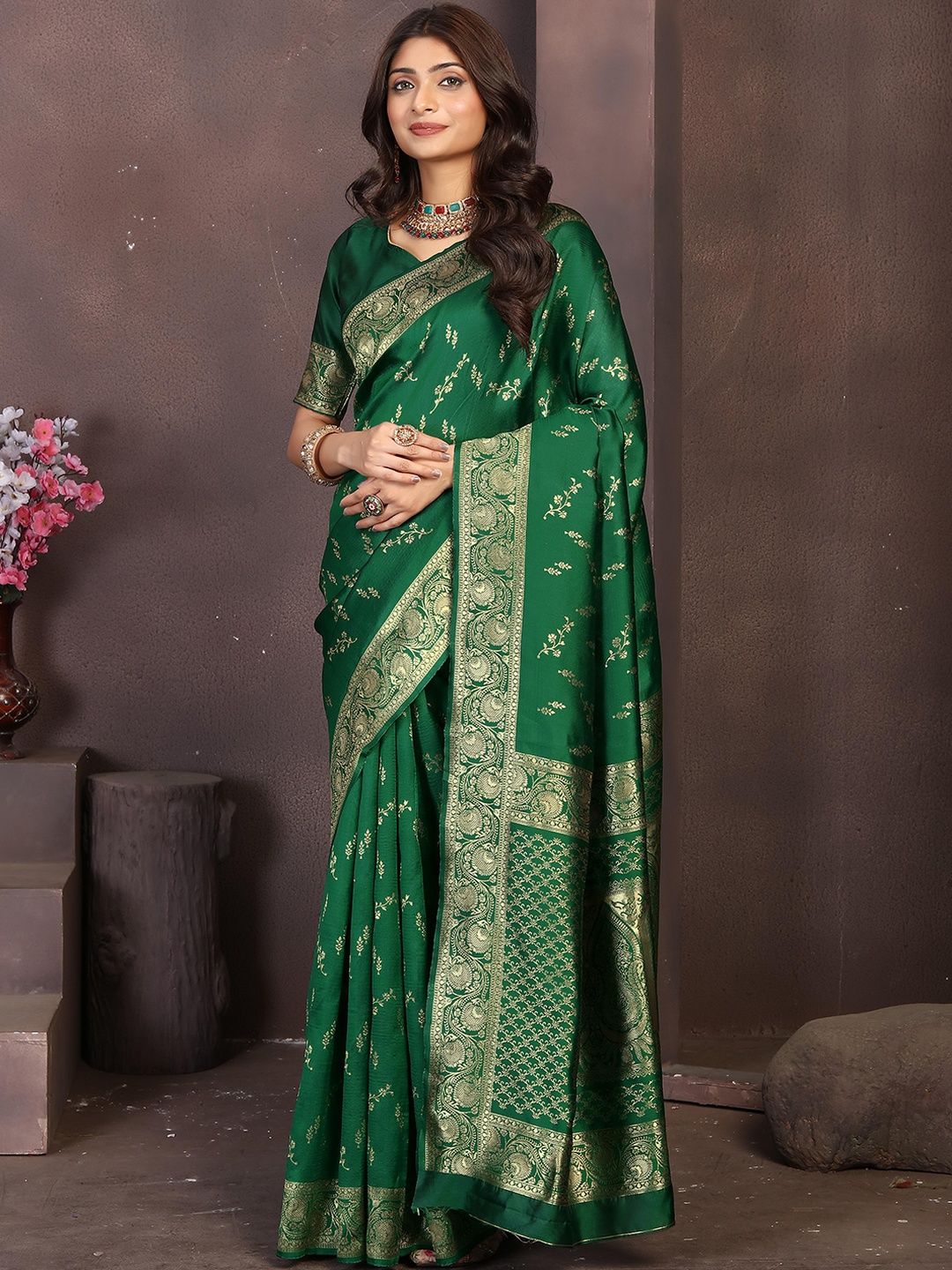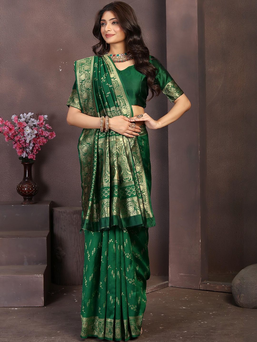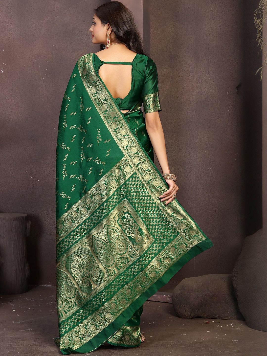 Elevate your festive look with this Dark Green and gold woven Banarasi saree. Pair it with statement kundan jewellery, a sleek clutch, and embellished heels for weddings, receptions, or festive occasions.