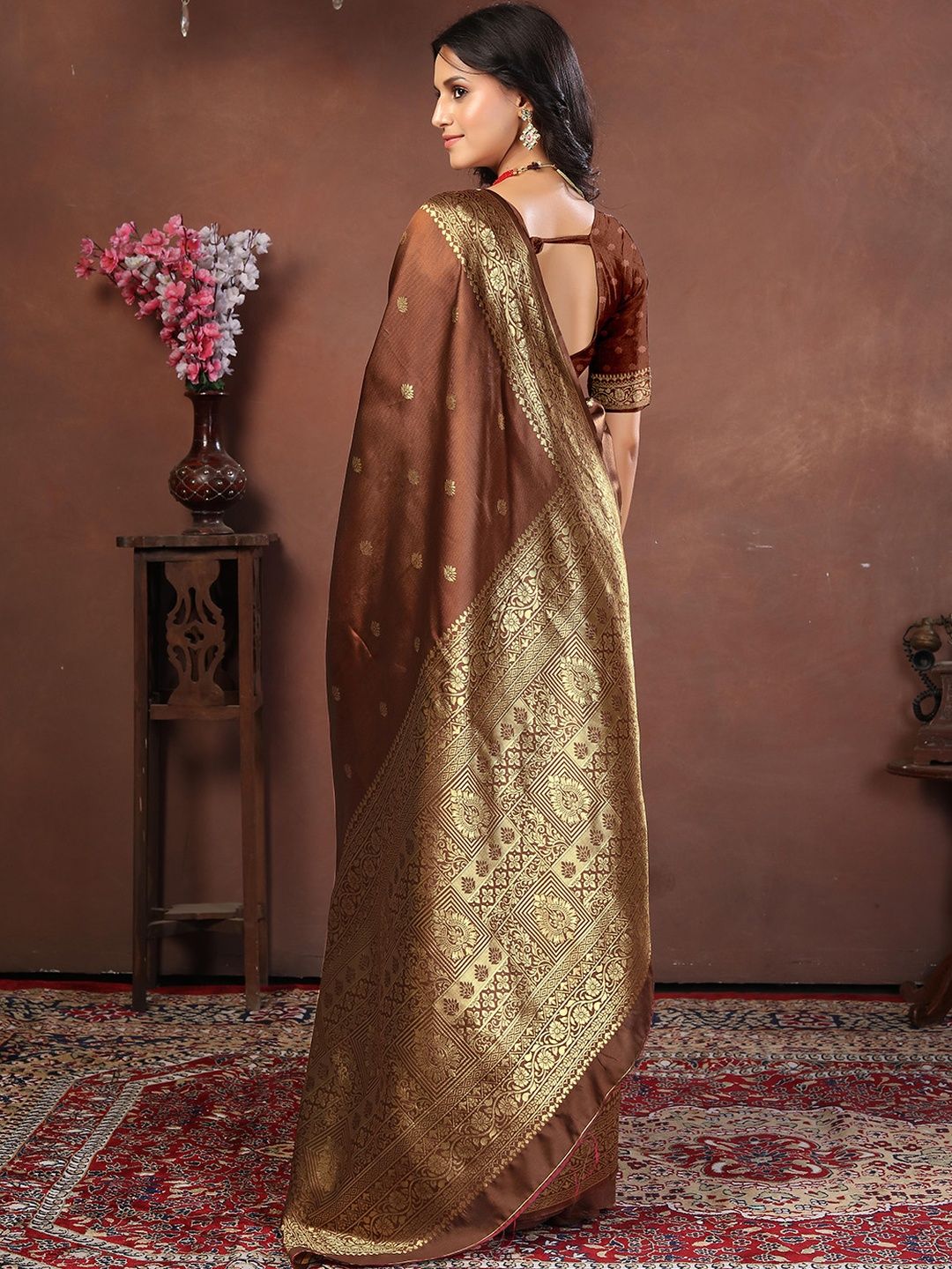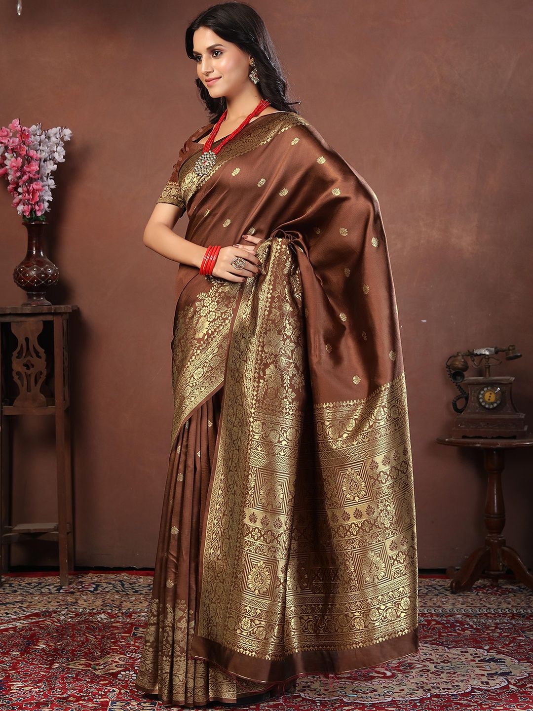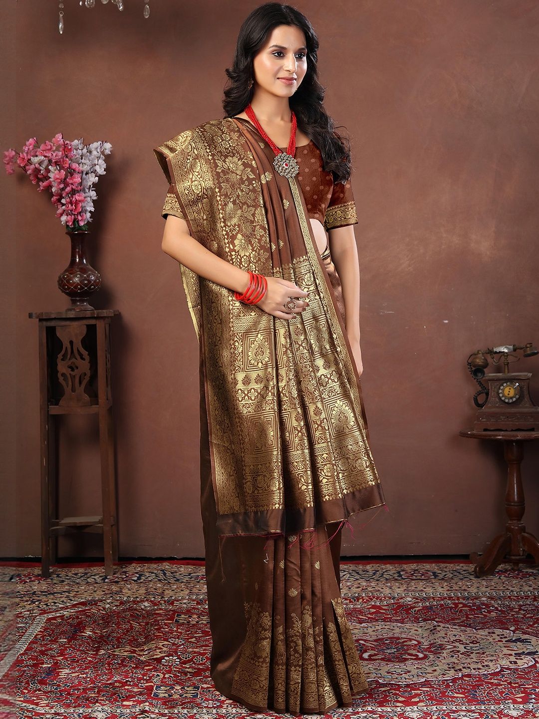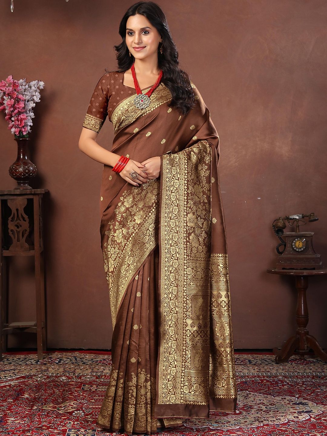 Saree Color: Brown with gold zari woven motifsPattern: Traditional woven jacquard with intricate floral & geometric designsBorder: Rich zari woven border with floral detailingPallu: Heavy zari woven pallu with ornate patternsFabric: Art Silk (Banarasi-style finish)Transparency: OpaqueFinish: Smooth, lightweight with lustrous textureOccasion: Festive & Wedding wearSaree Length: 5.5 metersBlouse Piece: 0.8 meters (unstitched, same fabric with matching woven border)Package Content: 1 Saree with blouse piece