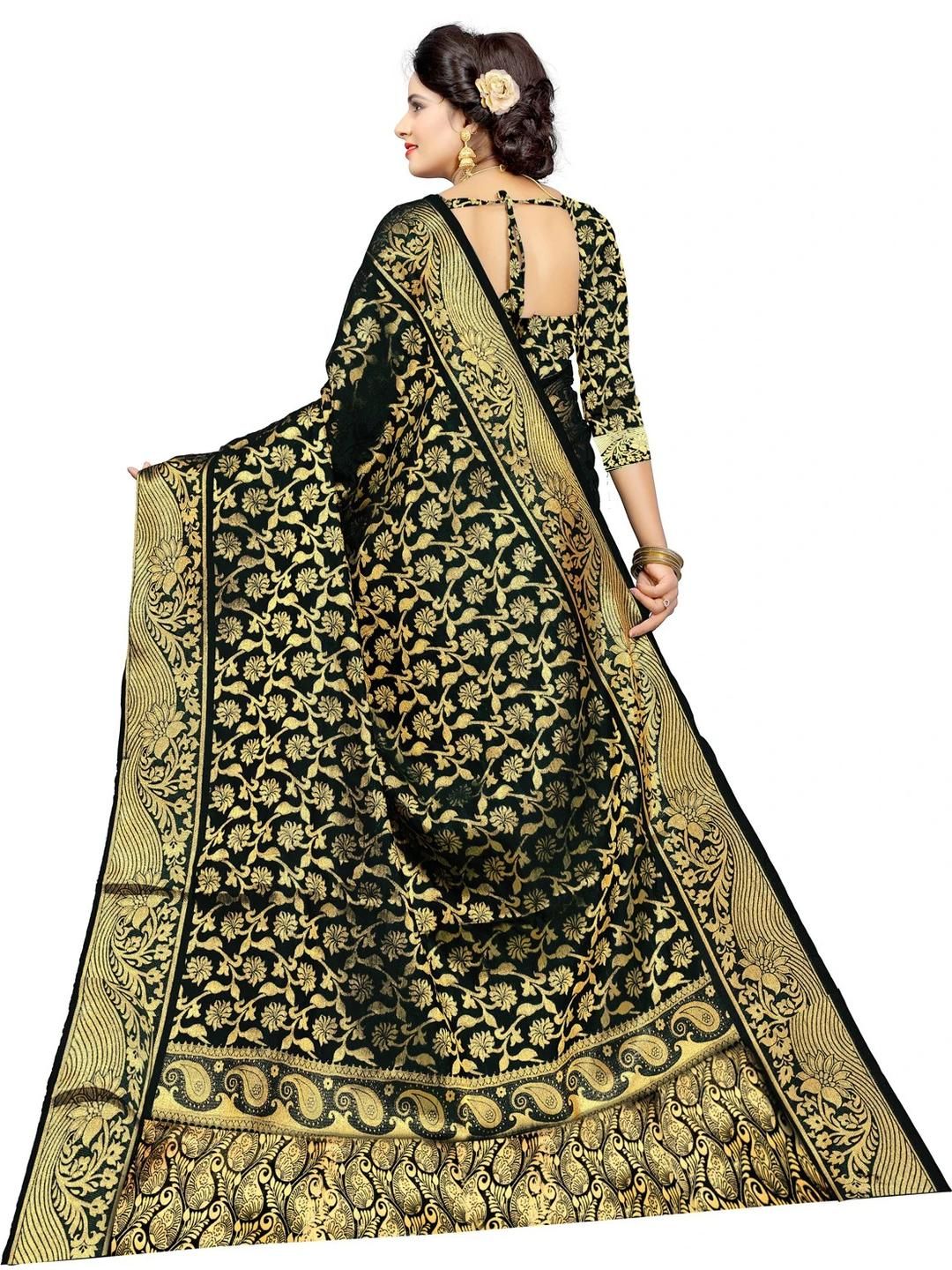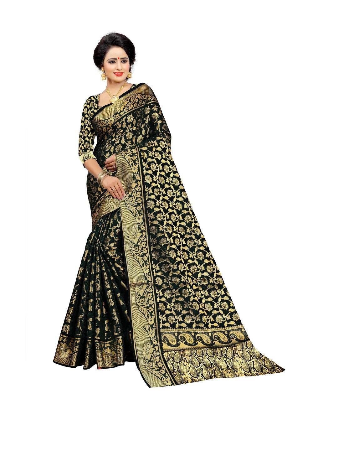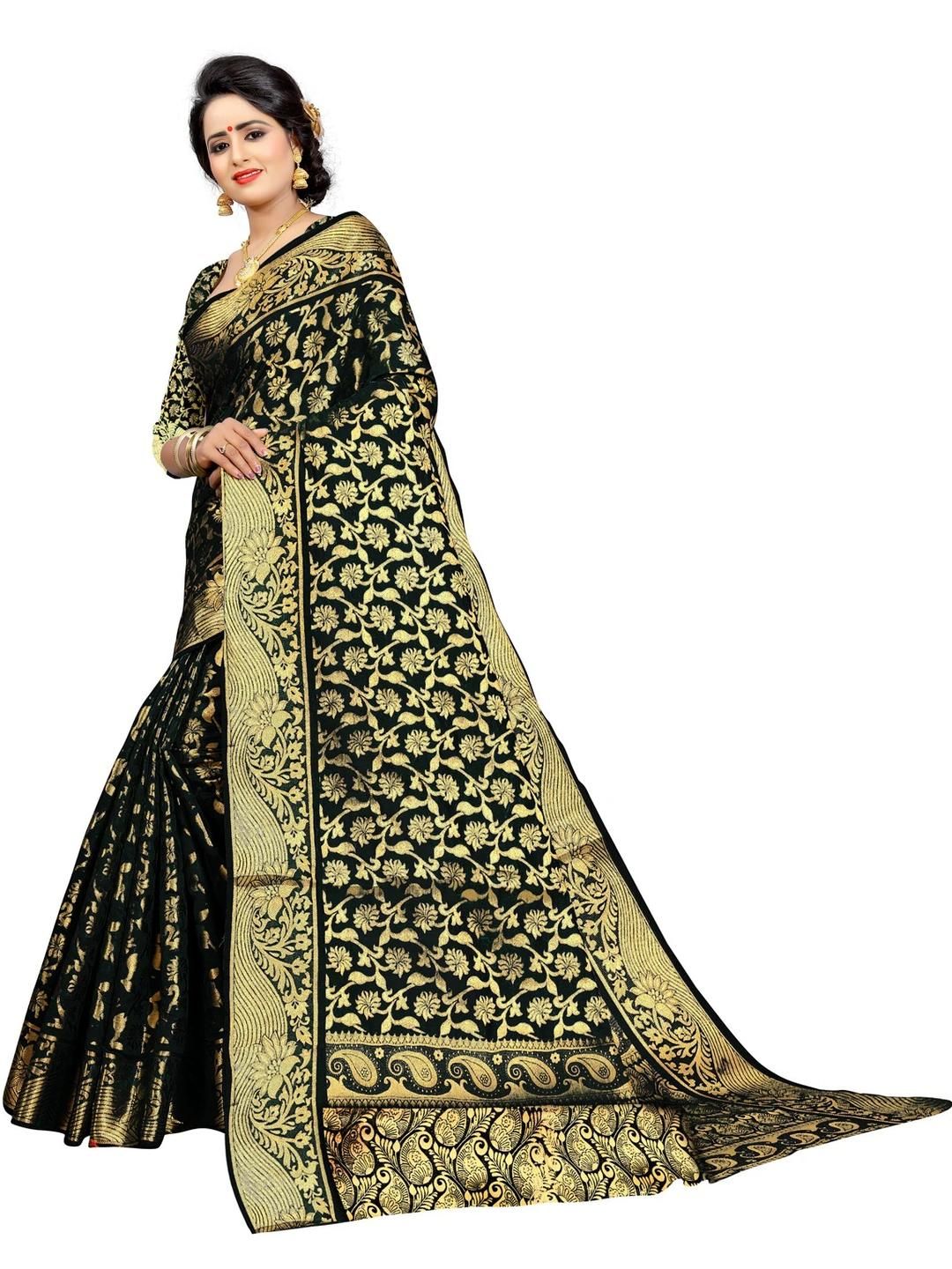 A Banarasi saree is a saree made in Varanasi, a city which is also called Benares or Banaras. The sarees are among the finest sarees in India and are known for their gold and silver brocade or zari, fine silk and opulent embroidery. The sarees are made of finely woven silk and are decorated with intricate design, and, because of these engravings, are relatively heavy.Their special characteristics are Mughal inspired designs such as intricate intertwining floral and foliate motifs, kalga and bel, a string of upright leaves called jhallar at the outer, edge of border is a characteristic of these sarees. Other features are gold work, compact weaving, figures with small details, metallic visual effects, pallus, jal (a net like pattern), and mina work.The sarees are often part of an Indian bride's trousseau.Depending on the intricacy of its designs and patterns, a saree can take from 15 days to a month and sometimes up to six months to complete. Banarasi sarees are mostly worn by Indian women on important occasions such as when attending a wedding and are expected to be complemented by the woman's best jewelry.