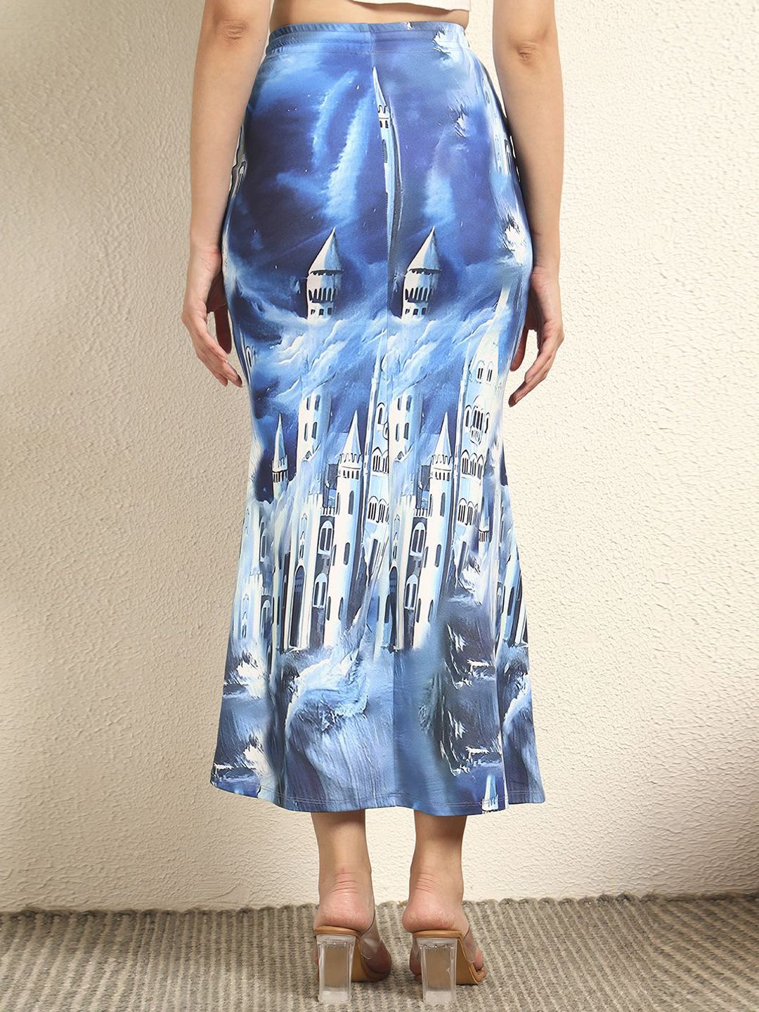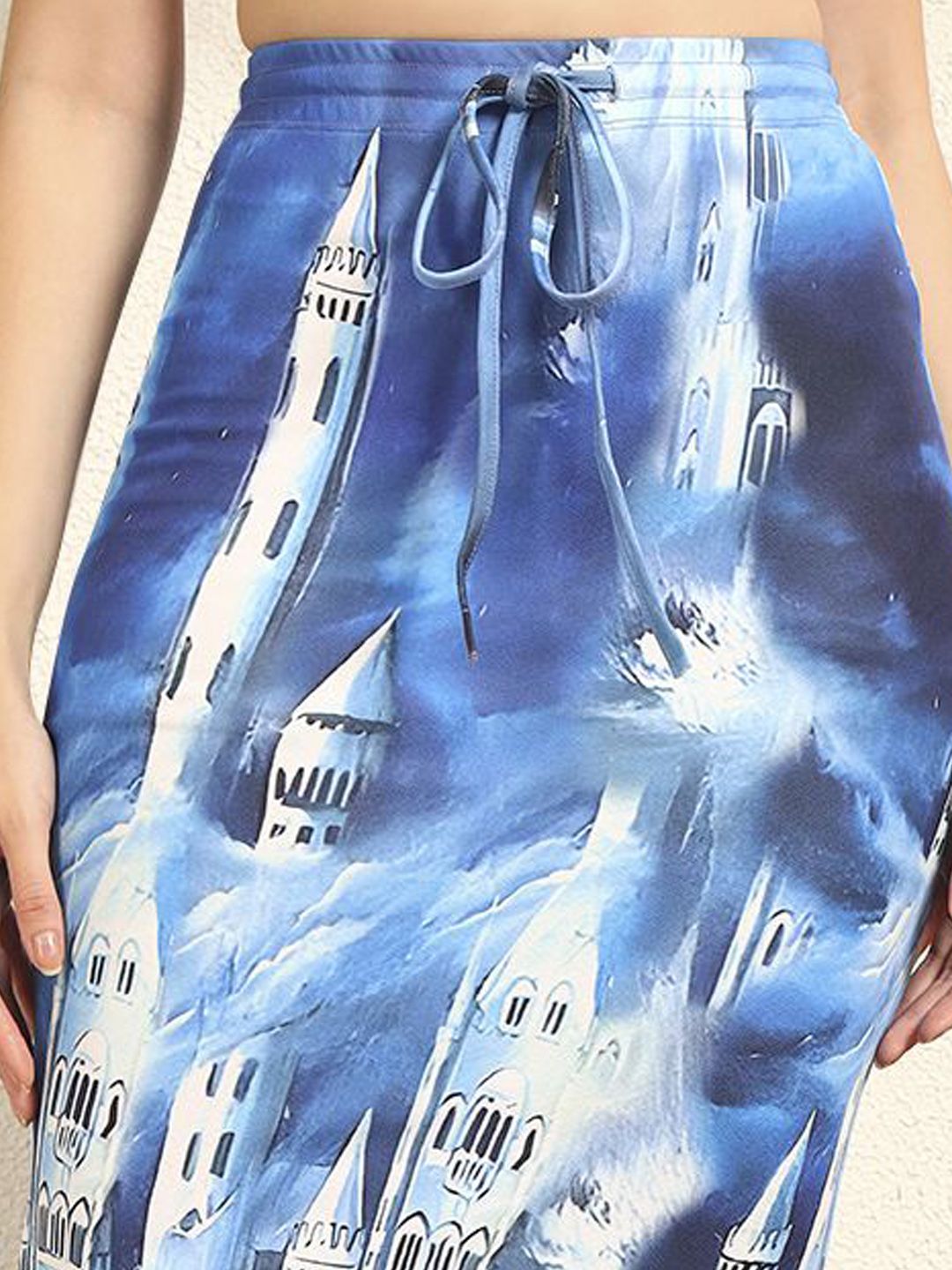 Blue and white printed pencil midi skirt, has elasticated waistband with drawstring closure, and straight hem