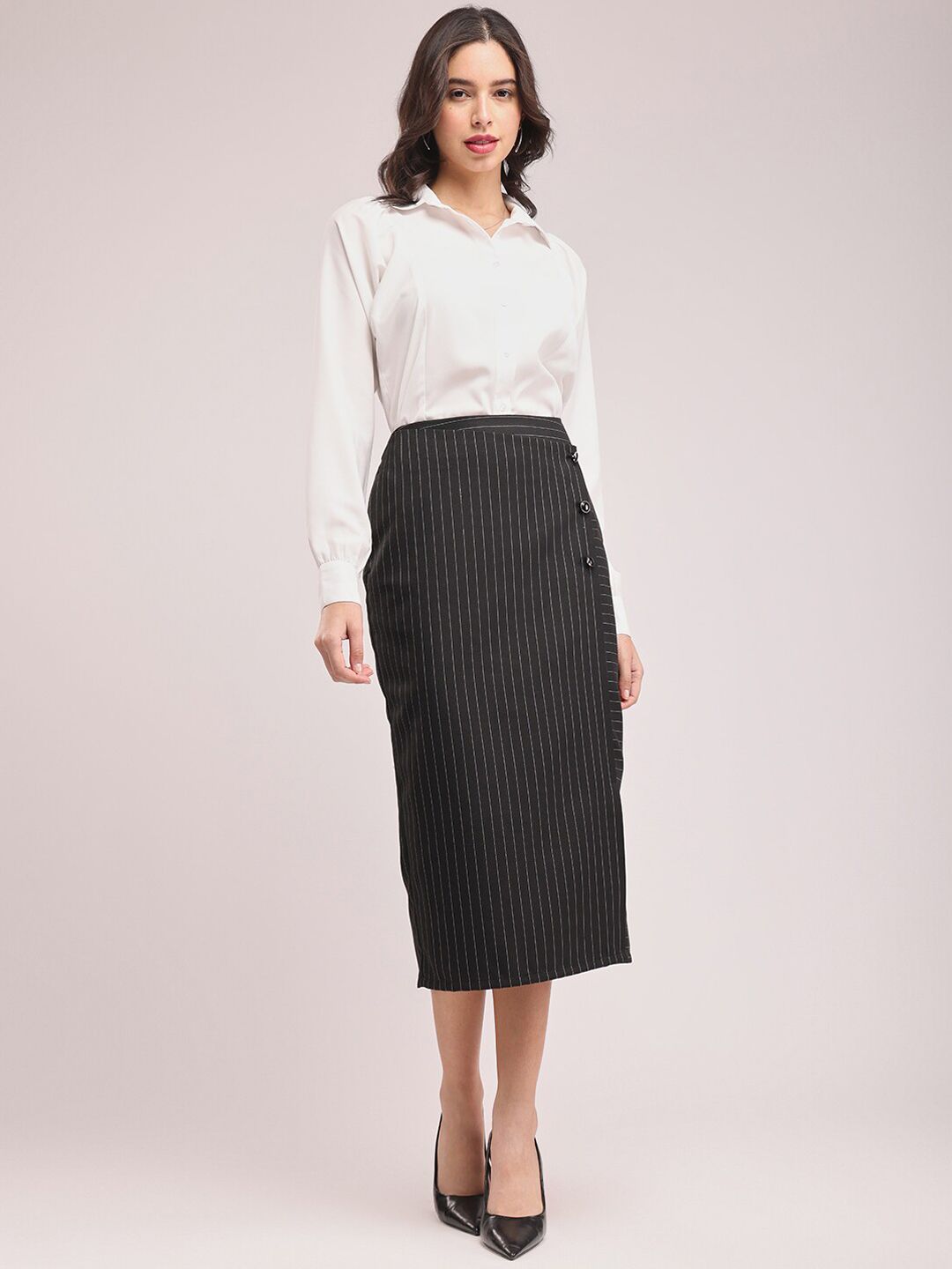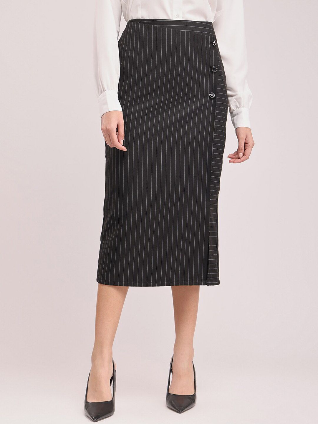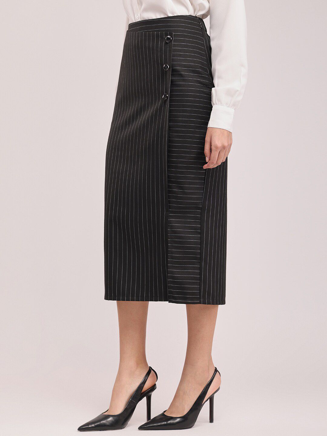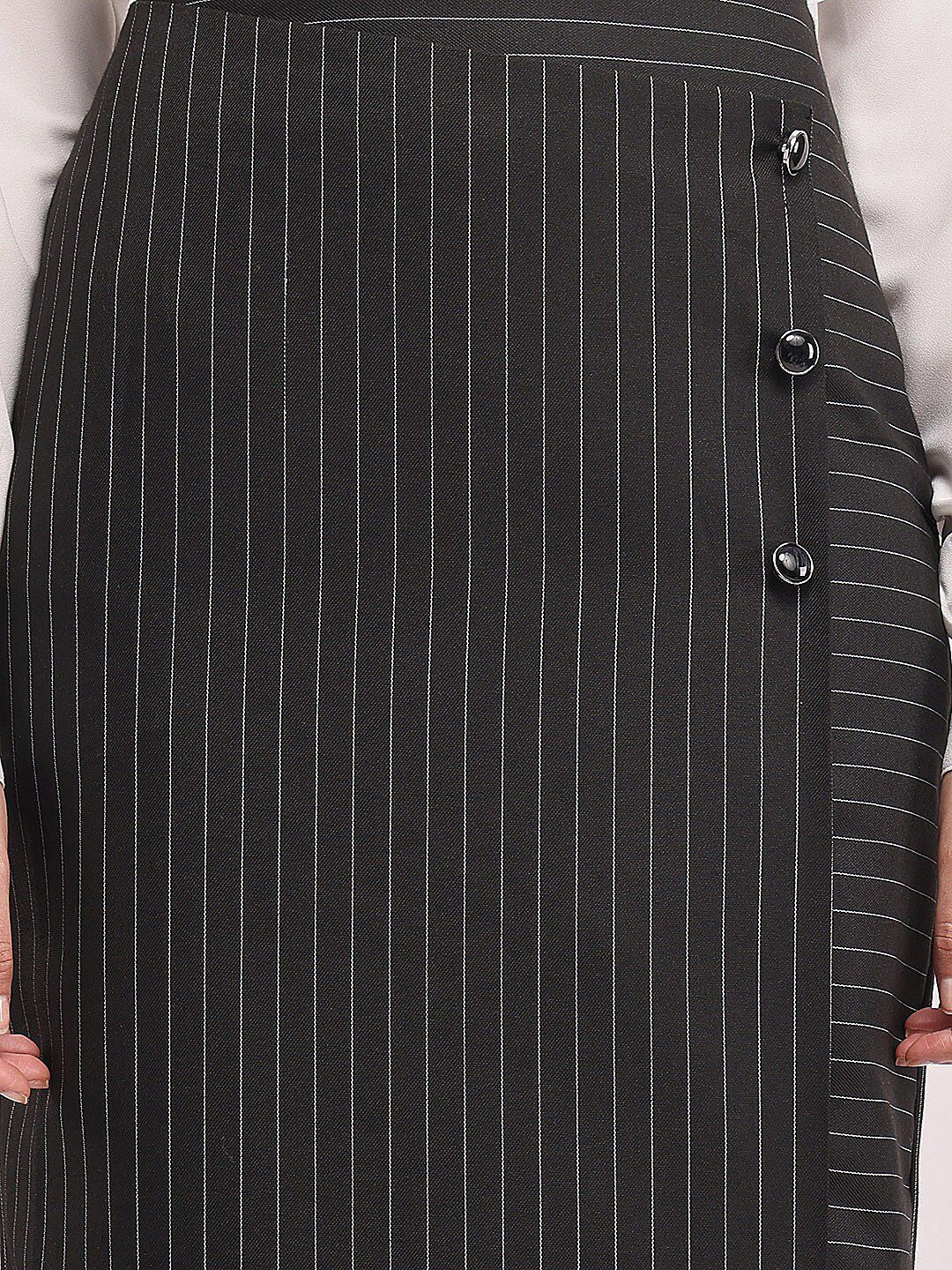Black striped Midi skirt, has an elasticated waistband with slip-on closure, and a straight hem
