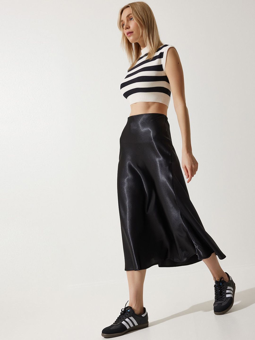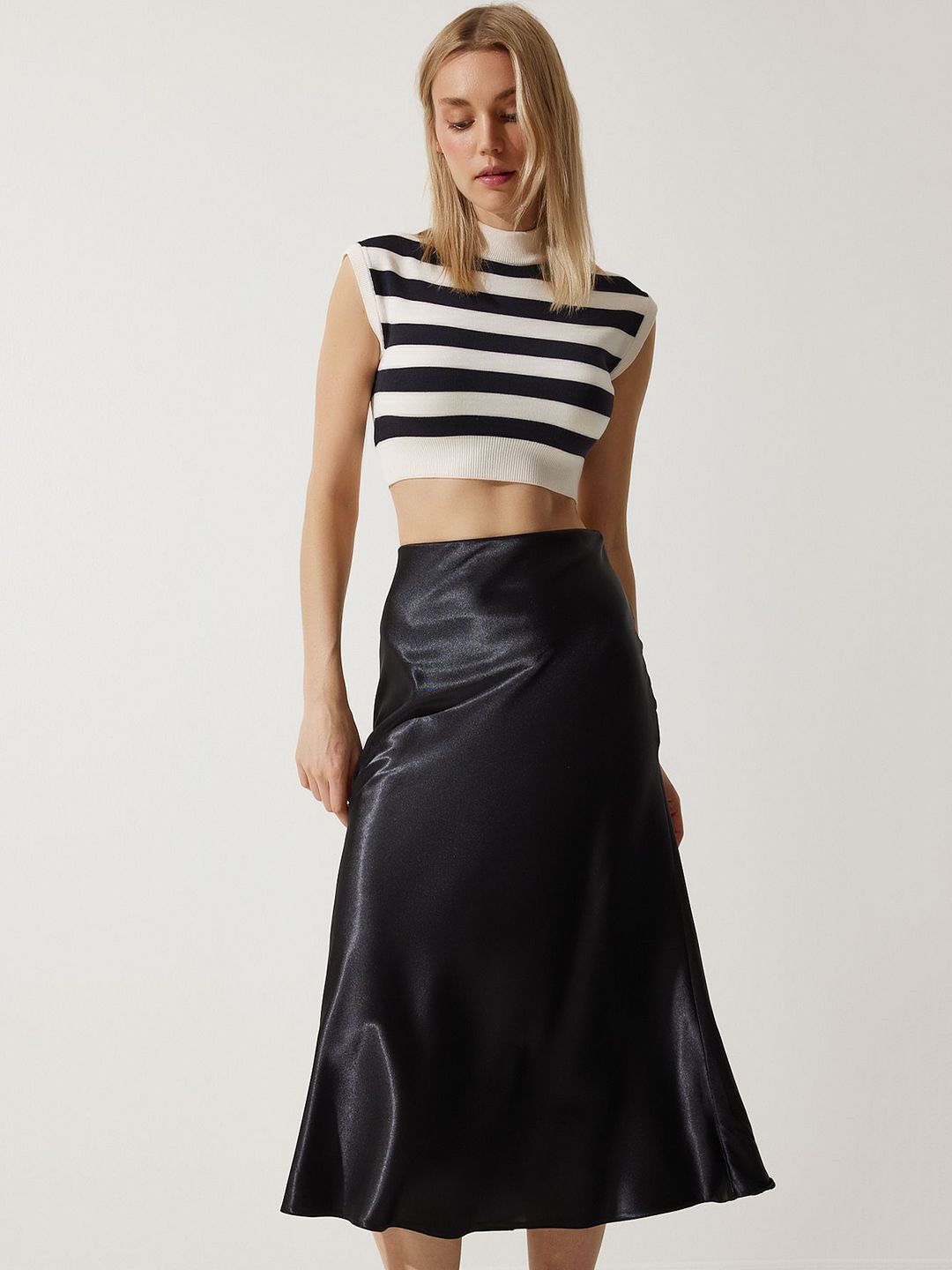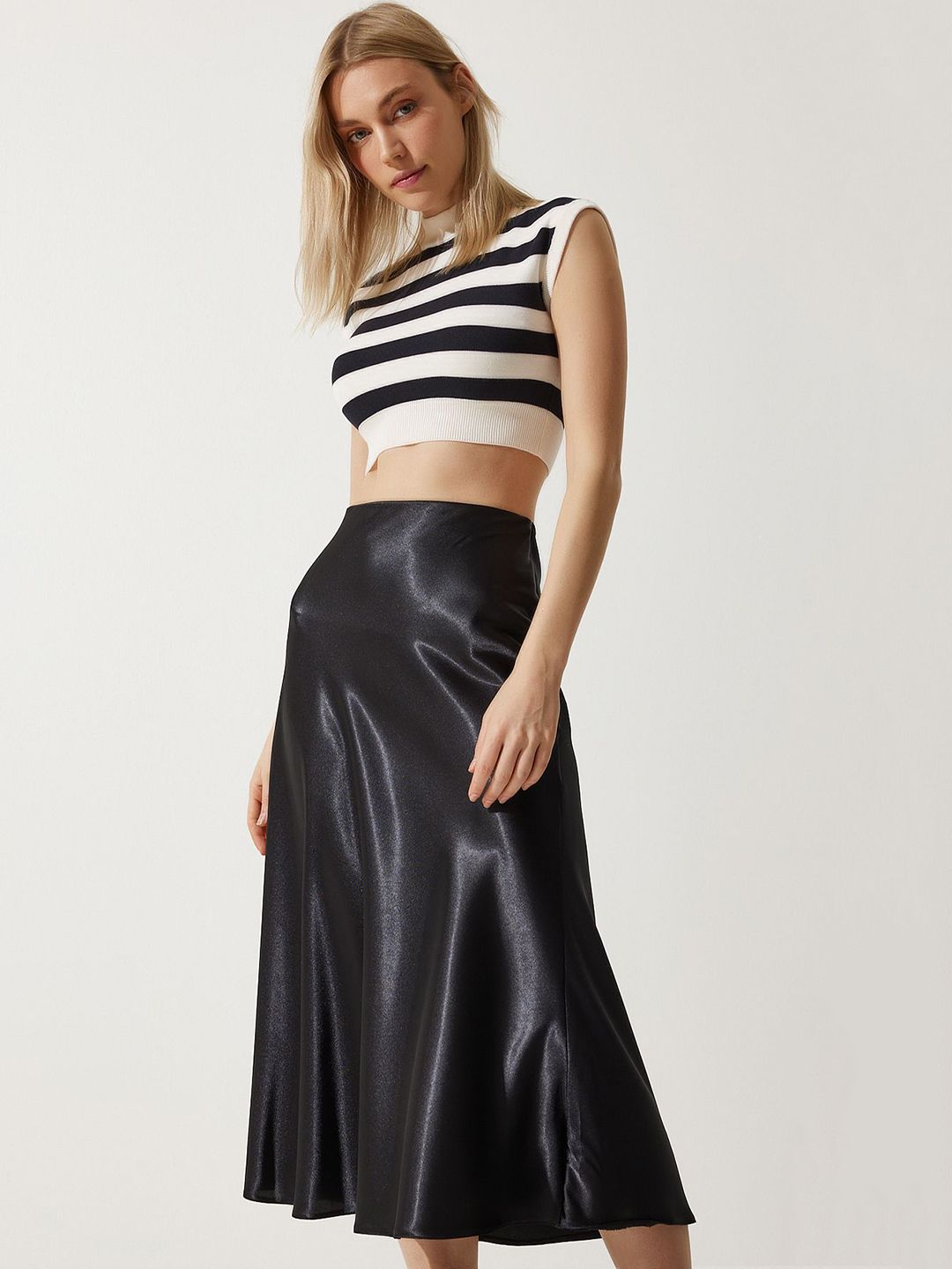 Black solid A-line high-waisted midi skirt, has an elasticated waistband with slip-on closure, smooth shiny finish and a flared hem
